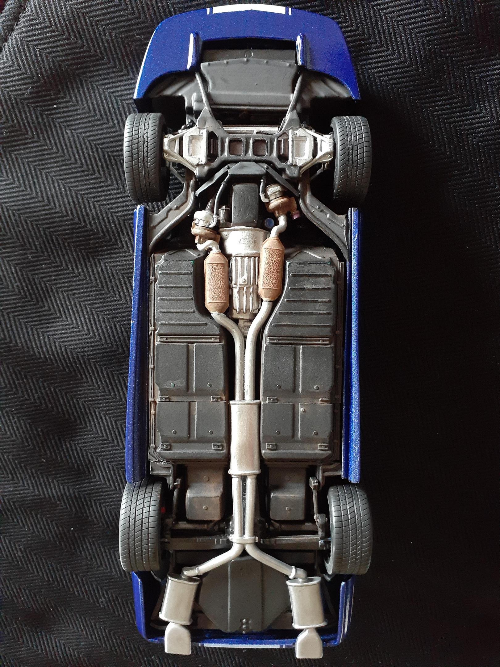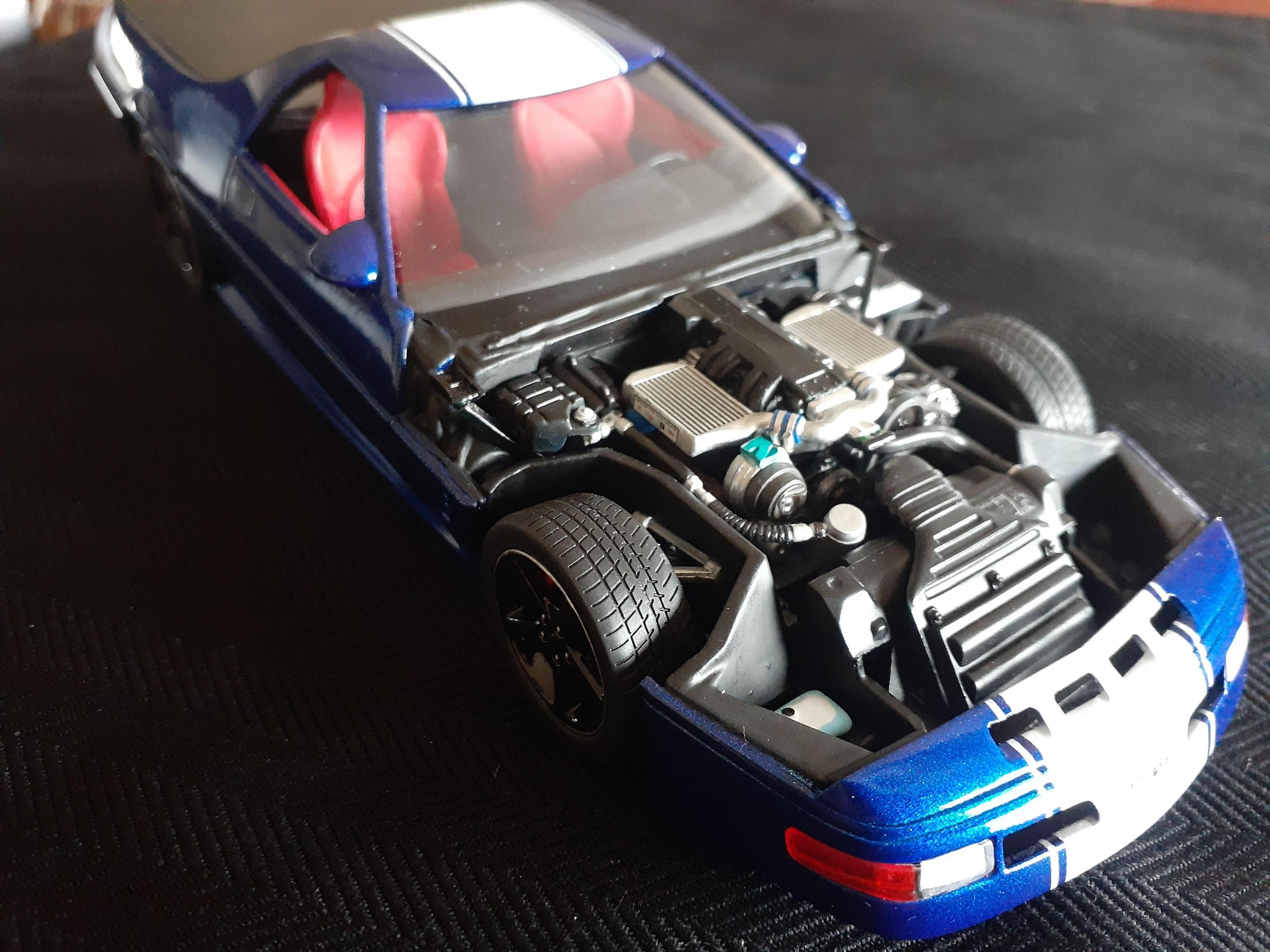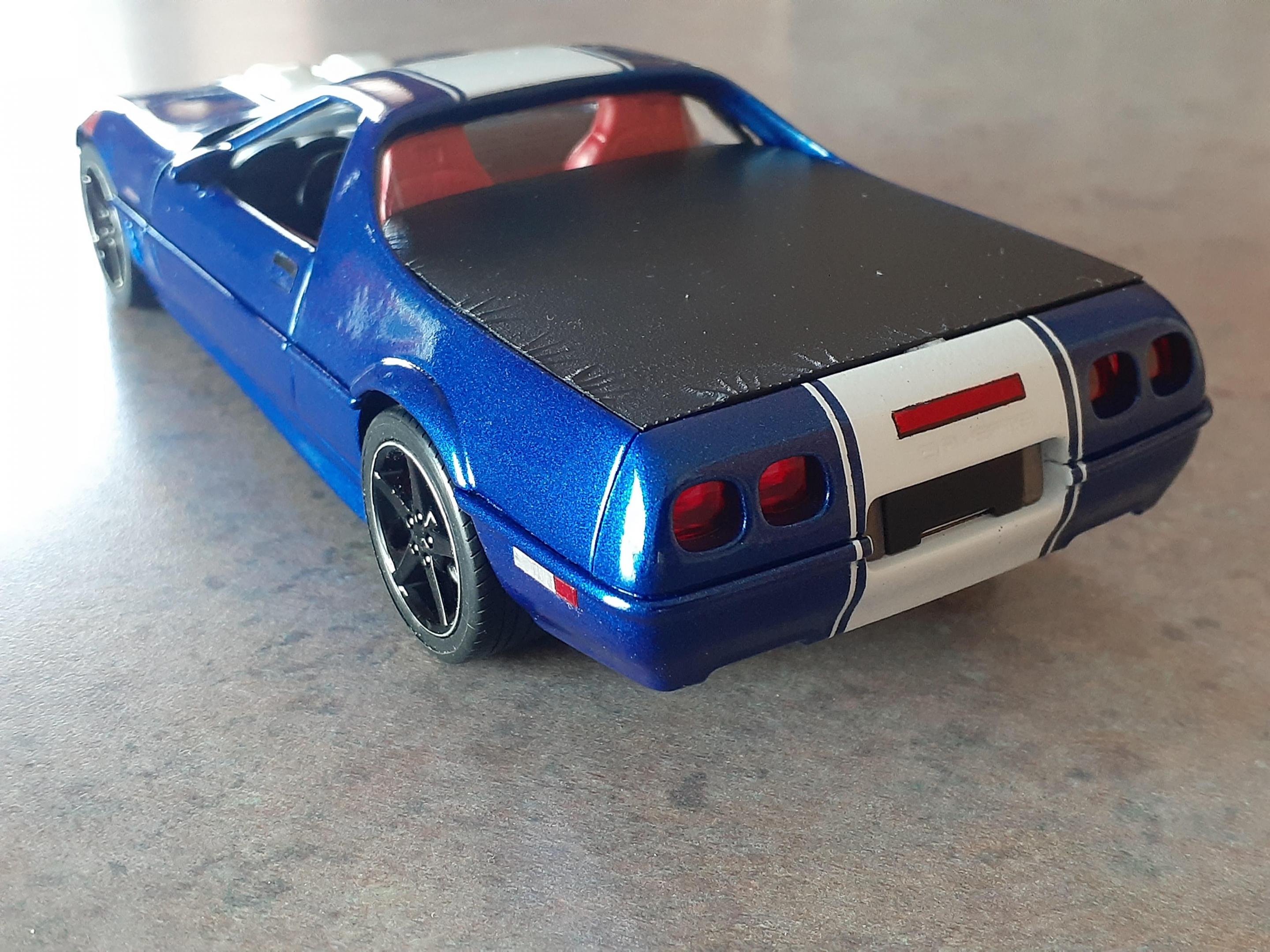 This was another stalled (5 years stalled!!) project I pulled out and finished. Paint is all lacquer: Blue base is Deja blue with True blue pearl. White stripes are masked and painted. Wheels are c6 Corvette with large Brembos behind them, tires are from the Foose c7. Photoetch emblem, rear sidemarkers, and door handles. Oh yeah, I made the front marker lights out of clear grand sport markers sanded and reshaped because the Callaway markers are tinted. ? When taking on something this complicated there are bound to be fitment issues which was an understatement.....the chassis had to be stretched 3/4 of inch to accommodate the new wheelbase, which meant new exhaust, driveline, new interior which is c4 Grand Sport.....yada yada yada. Lol on to the pics