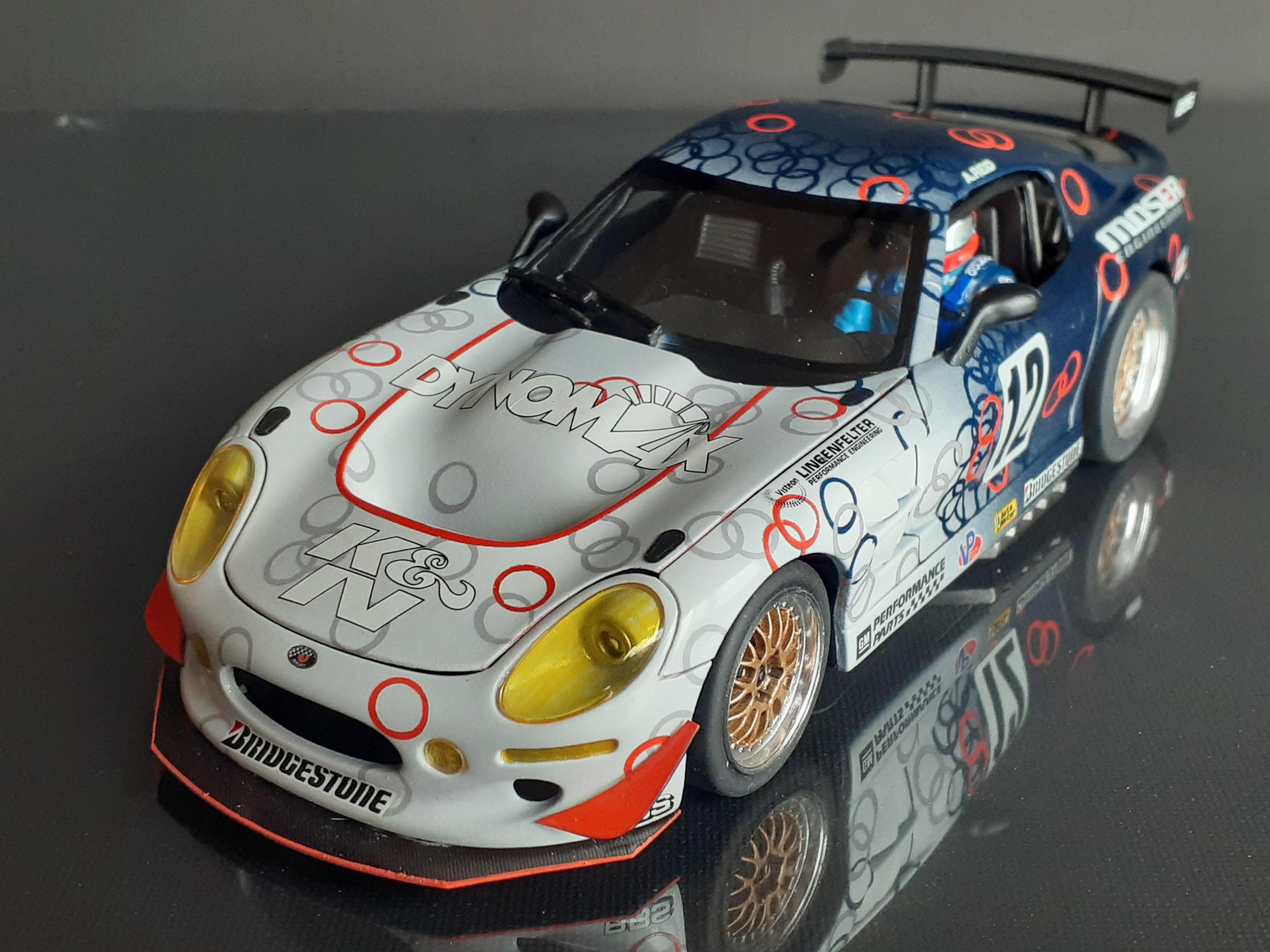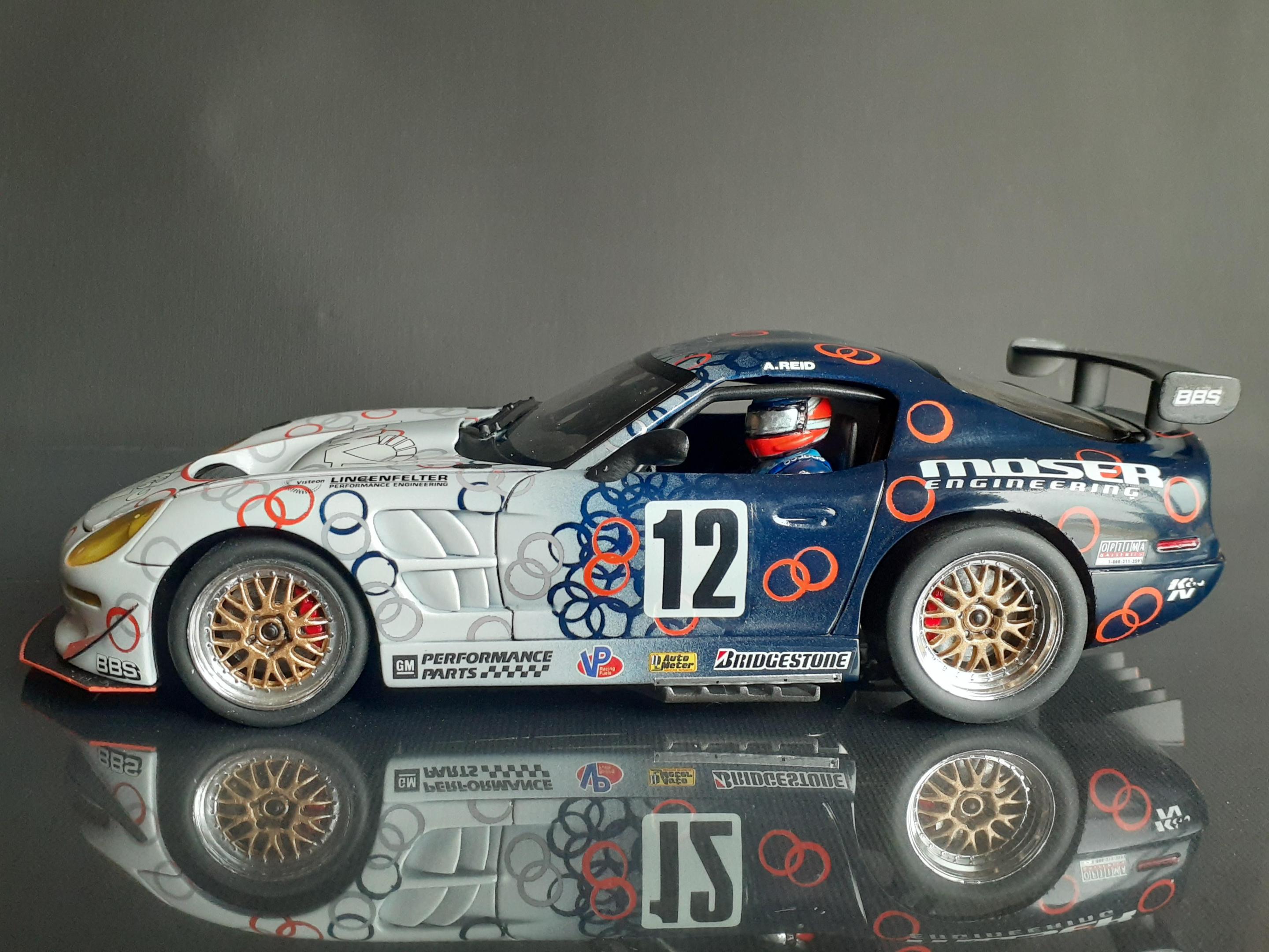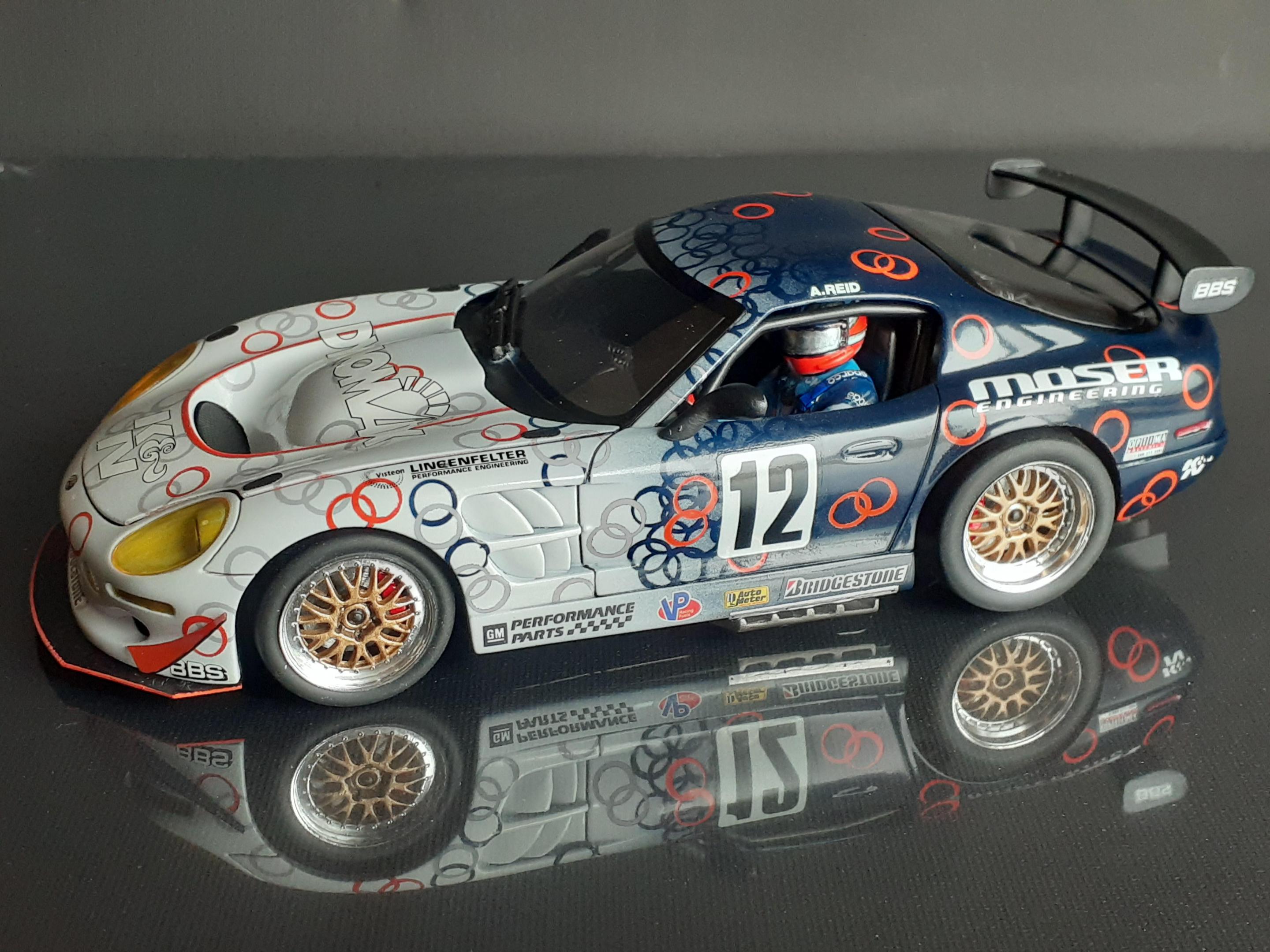 This was a long term build. I grafted a Viper GTS roof onto the Series 1 body. Then designed and fitted a roll cage, driver, and data systems and wiring. The wing is from a Viper GTSR diecast but it is plastic. The front splitter is Evergreen with scale Motorsport carbon fiber. Rear splitter is Evergreen also. Wheels are from a Tamiya Taisin Starcard kit. Feels good to finally have it done.