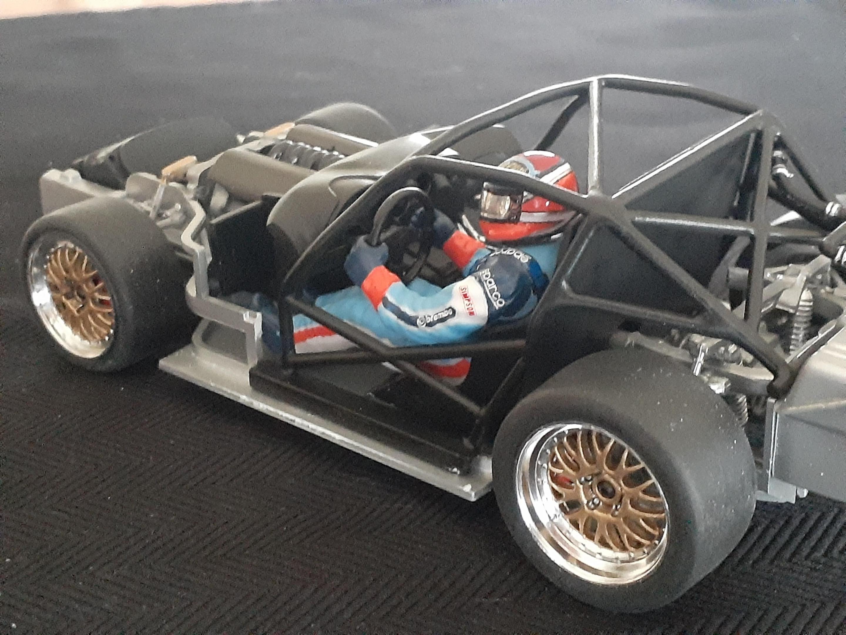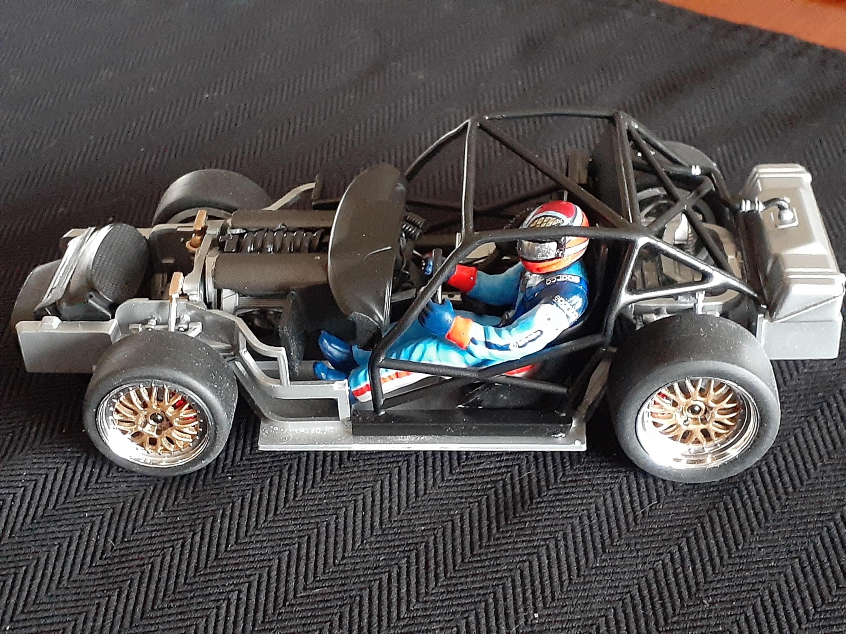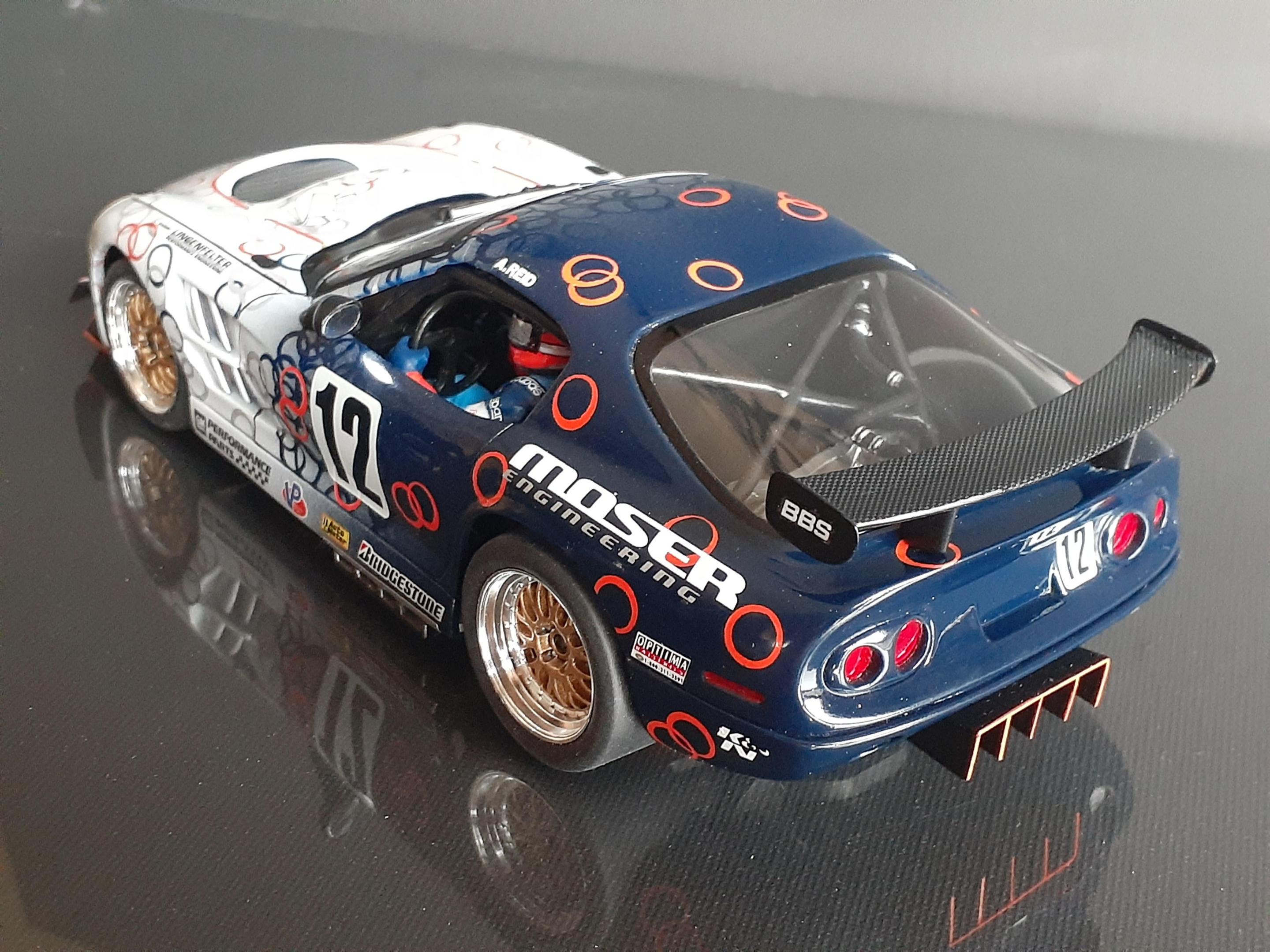 This was a long term build. I grafted a Viper GTS roof onto the Series 1 body. Then designed and fitted a roll cage, driver, and data systems and wiring. The wing is from a Viper GTSR diecast but it is plastic. The front splitter is Evergreen with scale Motorsport carbon fiber. Rear splitter is Evergreen also. Wheels are from a Tamiya Taisin Starcard kit. Feels good to finally have it done.