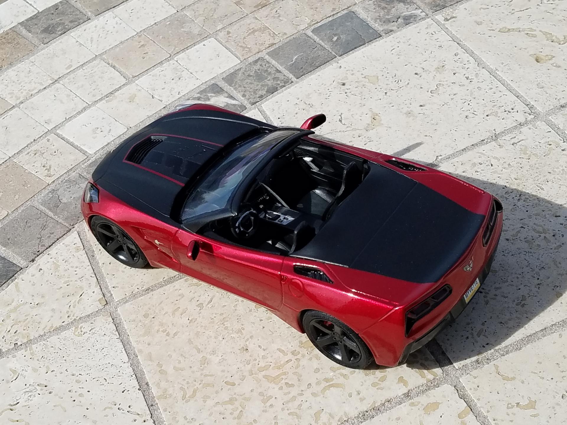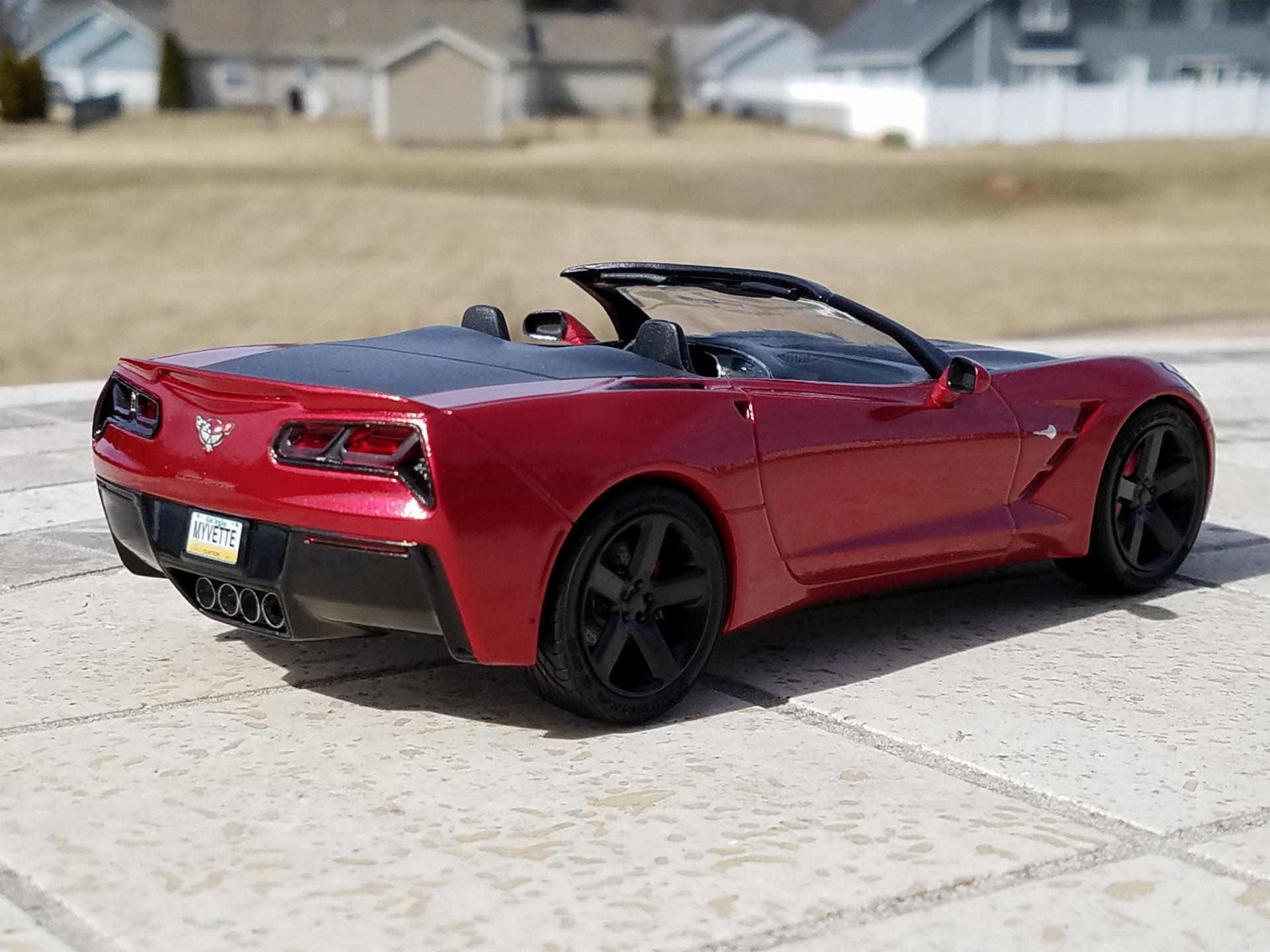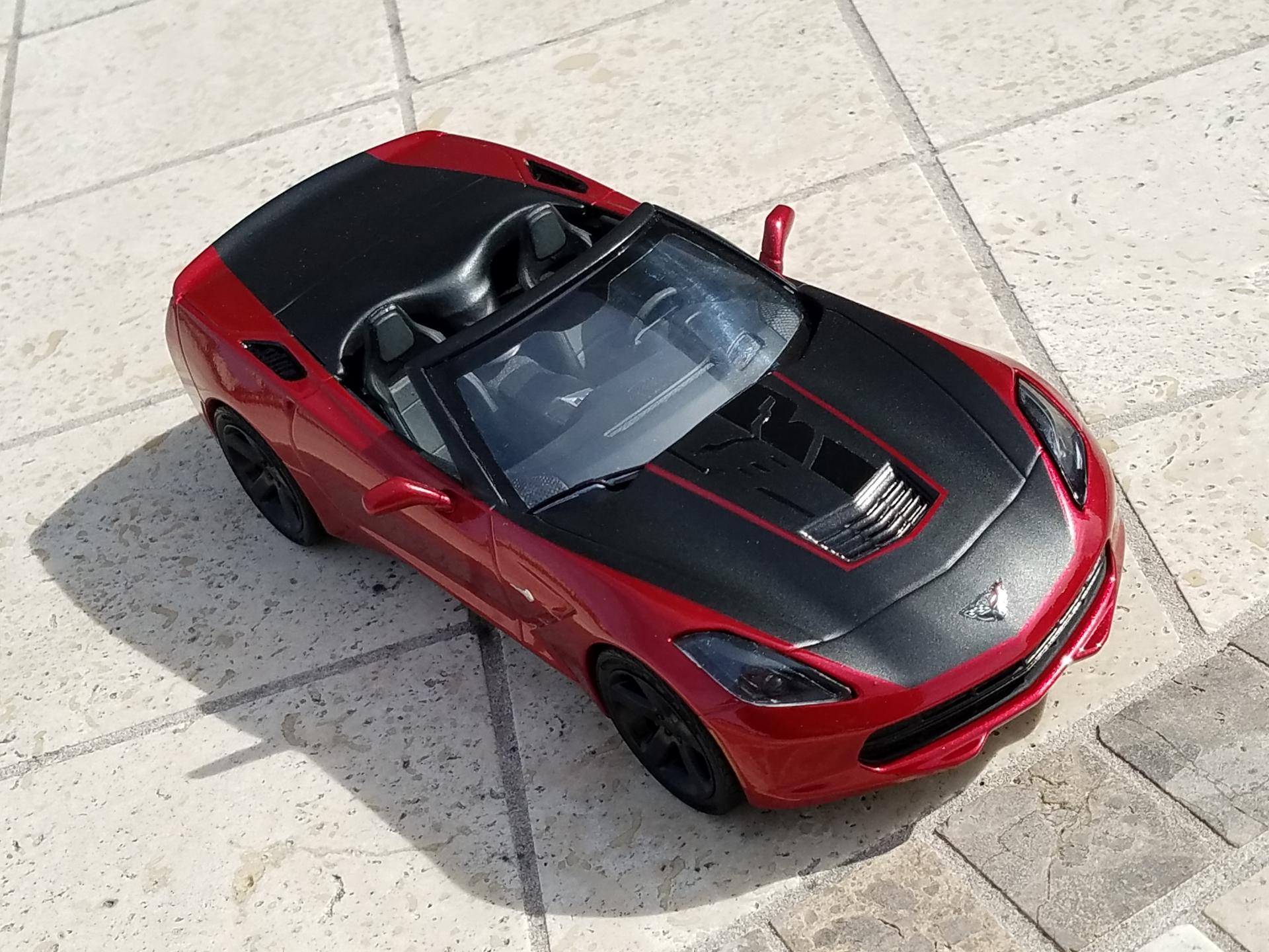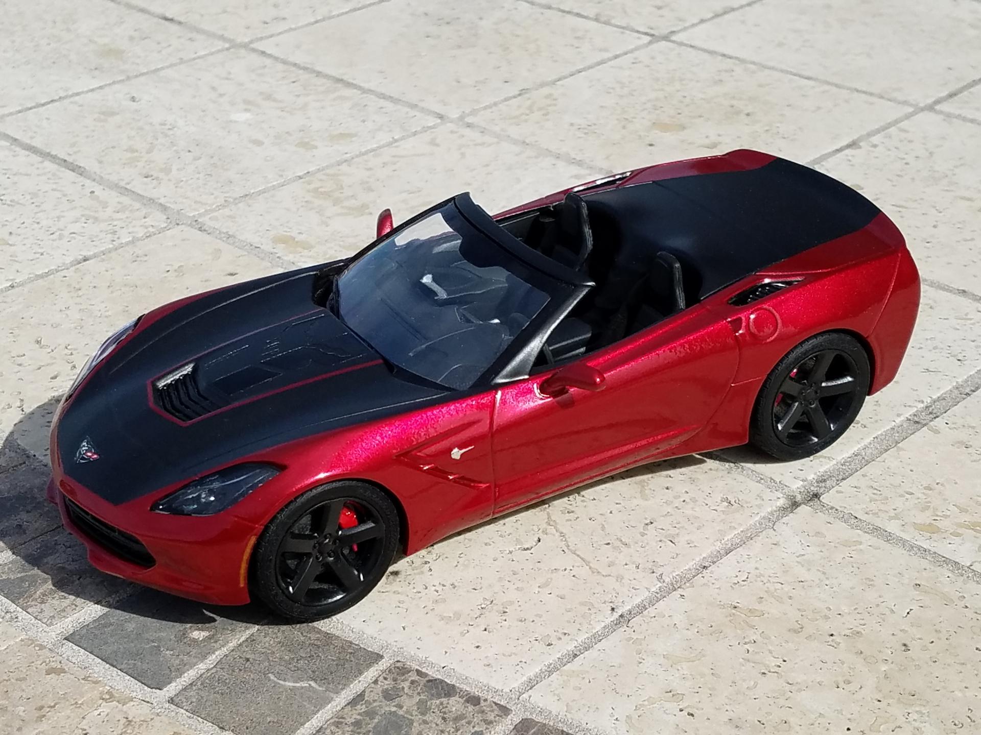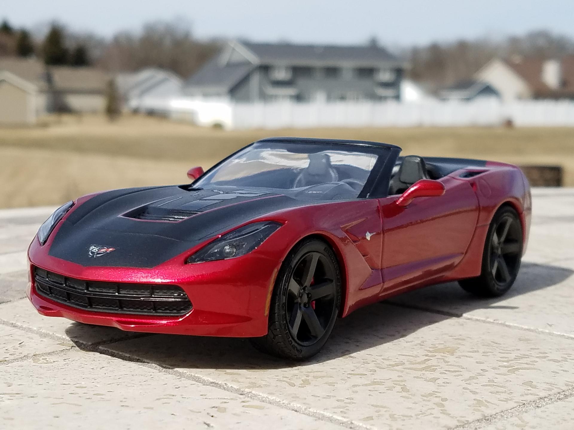 Color is OPI nail polish Romance on the moon cut with lacquer thinner and airbrushed over HOK goldmine pearl base. Masked and shot satin black, then masked and shot clear for Jake skull on hood. Convertible trunk was from a 98 Corvette kit, cut the top off C7 kit, cut and matched in the trunk section from the donor. Wheels are SRT Challenger wheels from parts box with Tamiya calipers/rotors and Fujimi Toyo Proxes tires. Drilled out headlight projector and installed glass led bulbs for depth. Tailpipes were removed, drilled out, and replaced with chrome penned drinking straws. Really happy with the end result of this build of a very simple kit.