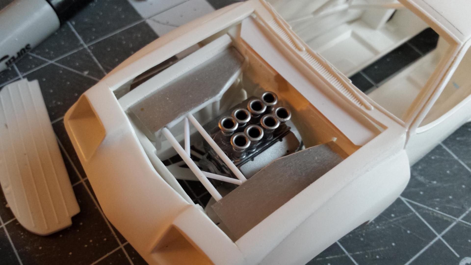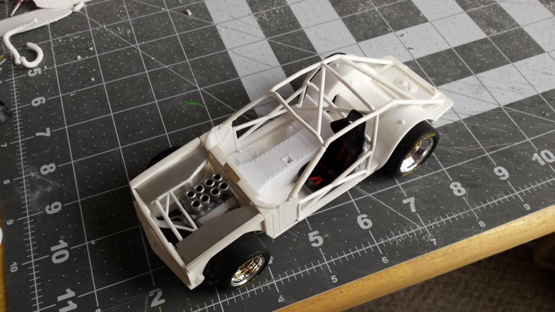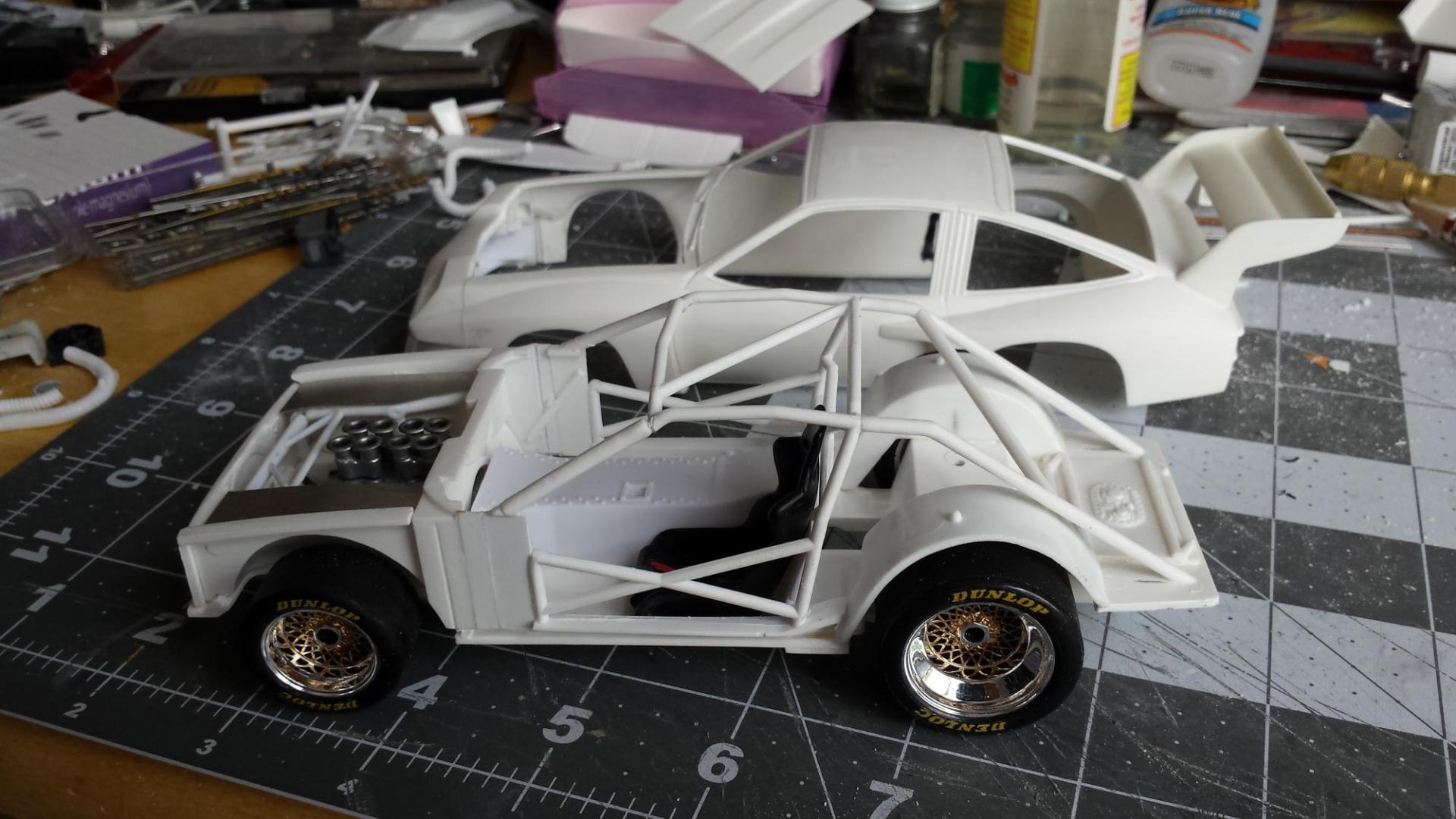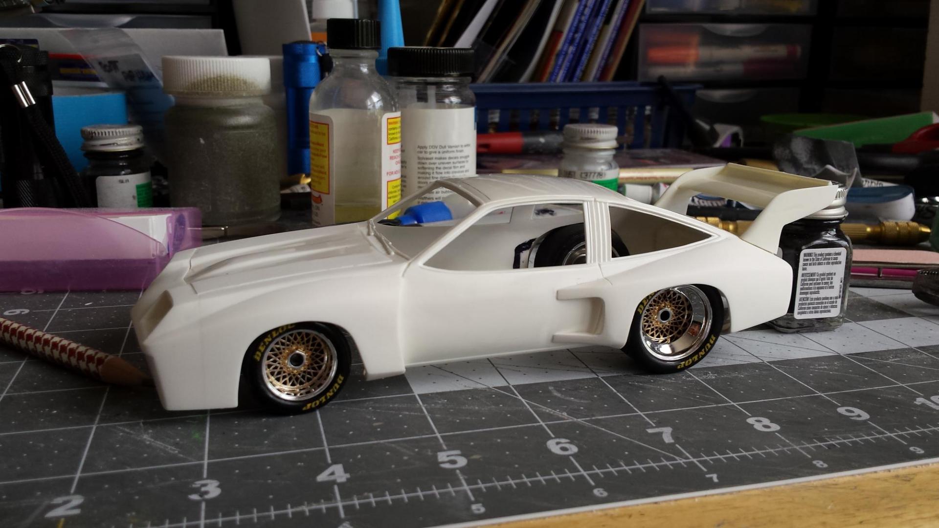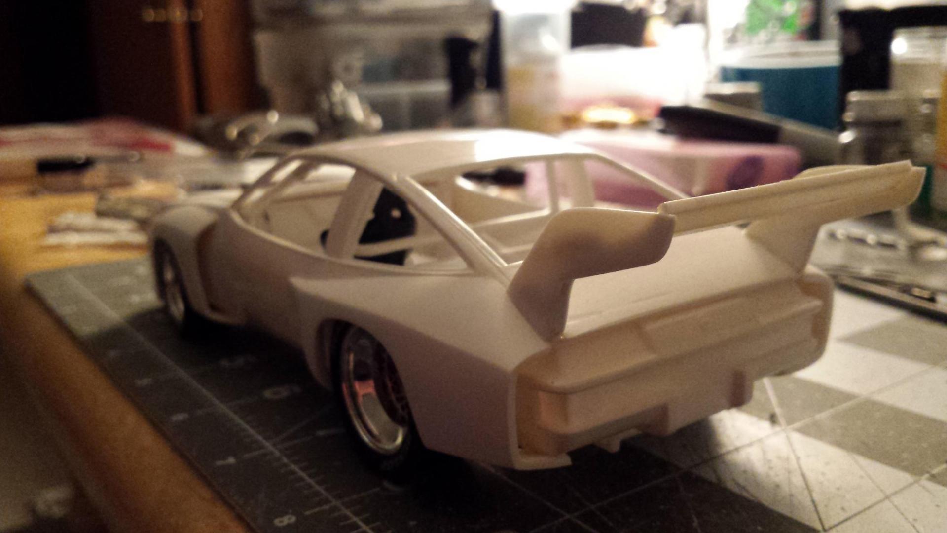 Jc was the first to start a thread on his build (and his will more than likely be better than mine) but here goes... I started my build last month. The kit I started with was the original at monza ss kit. I am going to build my car as one of the later models (phase 3 to 4 mostly) this will make it easier to distinguish it from others that were/are done. The wing uprights are scratch built, and the wing itself was borrowed from the parts bin. Wheels and tires are Porsche 935, engine is a 350 from the El Camino ss kit, cut off the transmission and replaced with the monza kit transmission, valve covers were parts box....stacks and eyelets were add-ons.