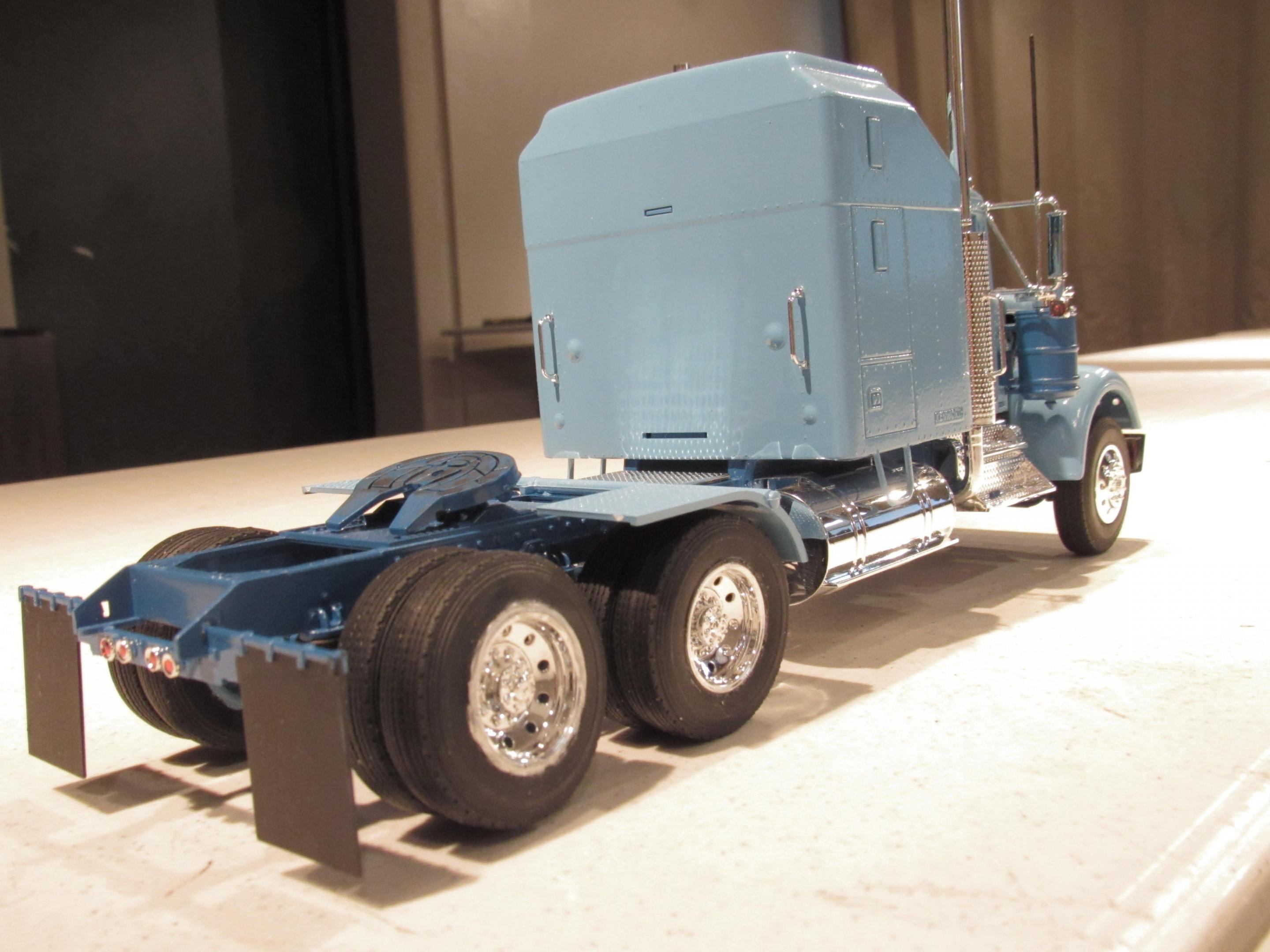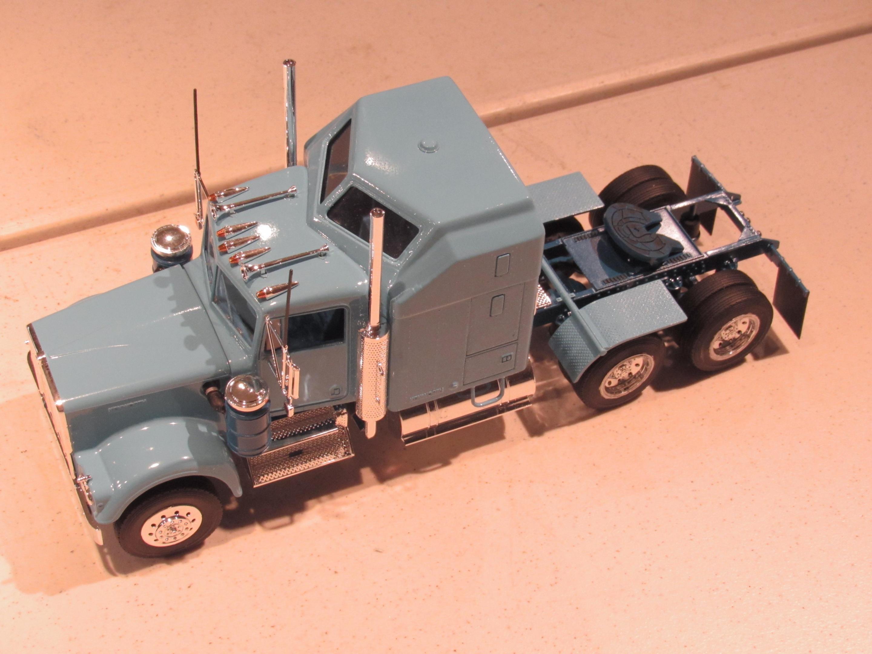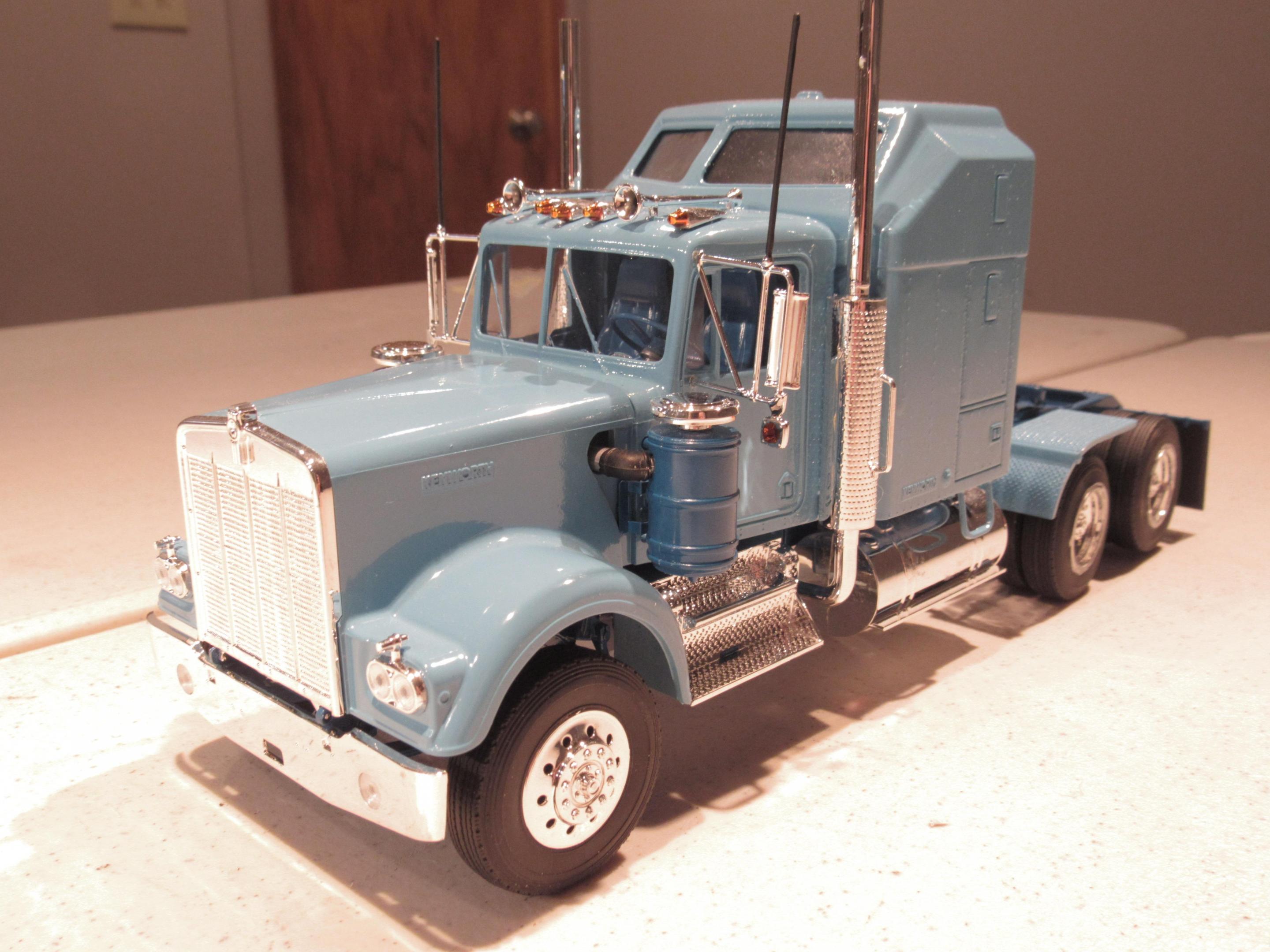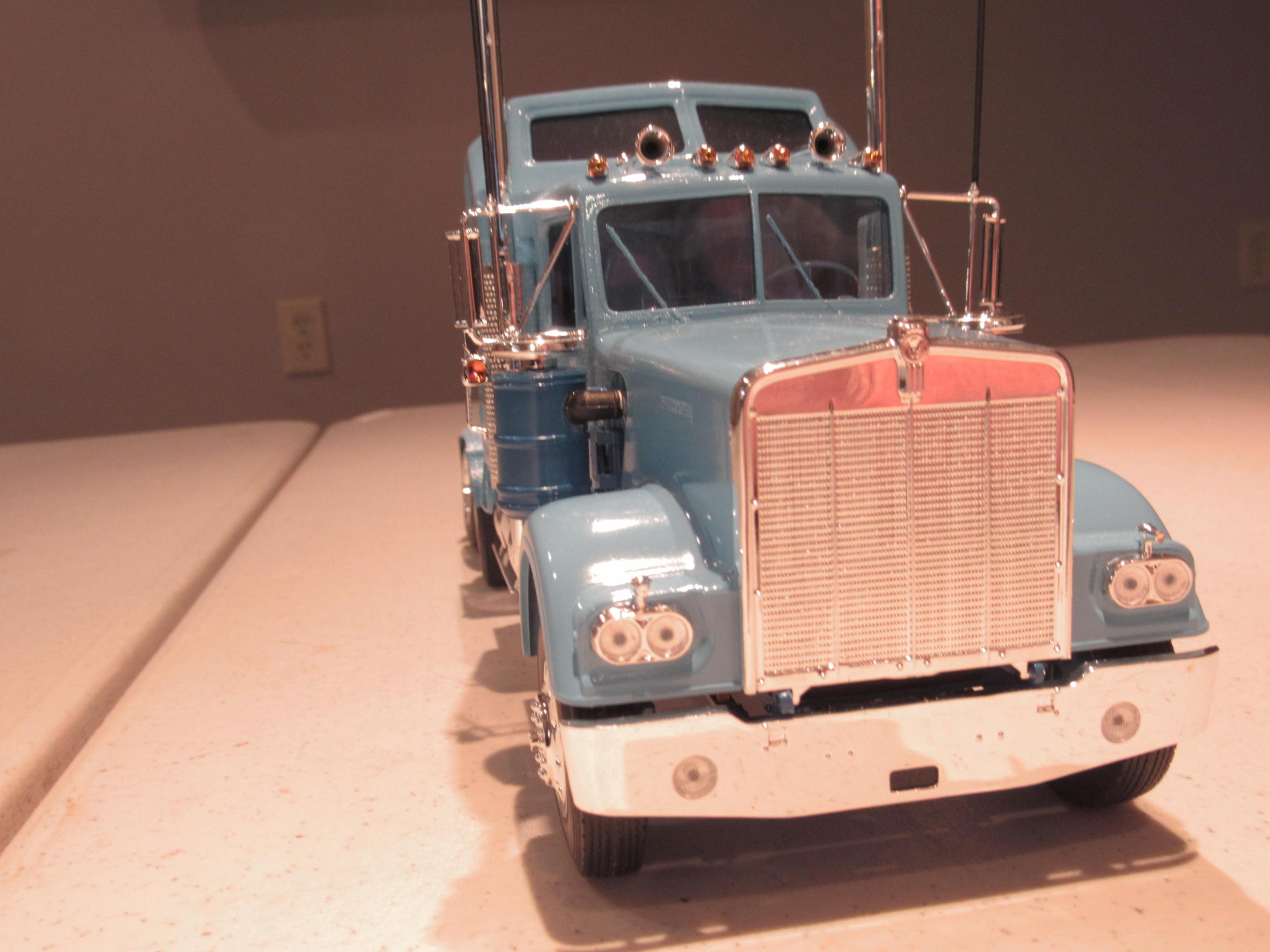 Out of the blue I decided to build my first ever big rig model. Searching my stash I knew I didn't want it to be one of the higher dollar kits so when I came across the Revell Kenworth W900 I knew it was the chosen. Big rigs are harder than I imagined. I didn't worry about seams on the chromed parts and the paint came out poorly as did several other things but I did it, I built it, and now I know. The tires were warped so I won't take the fall for how badly they came out. On to better big rigs builds. Thanks for looking.