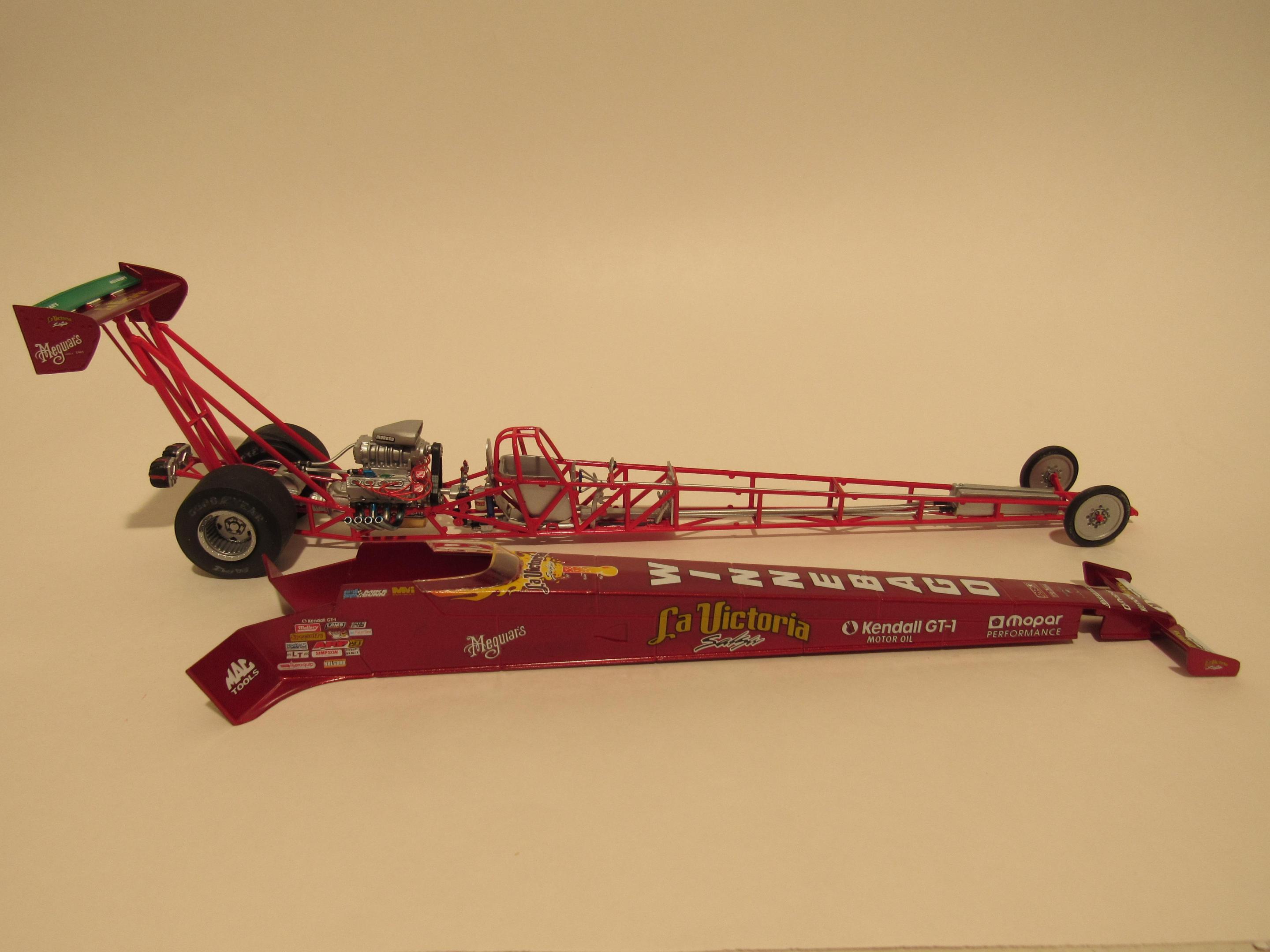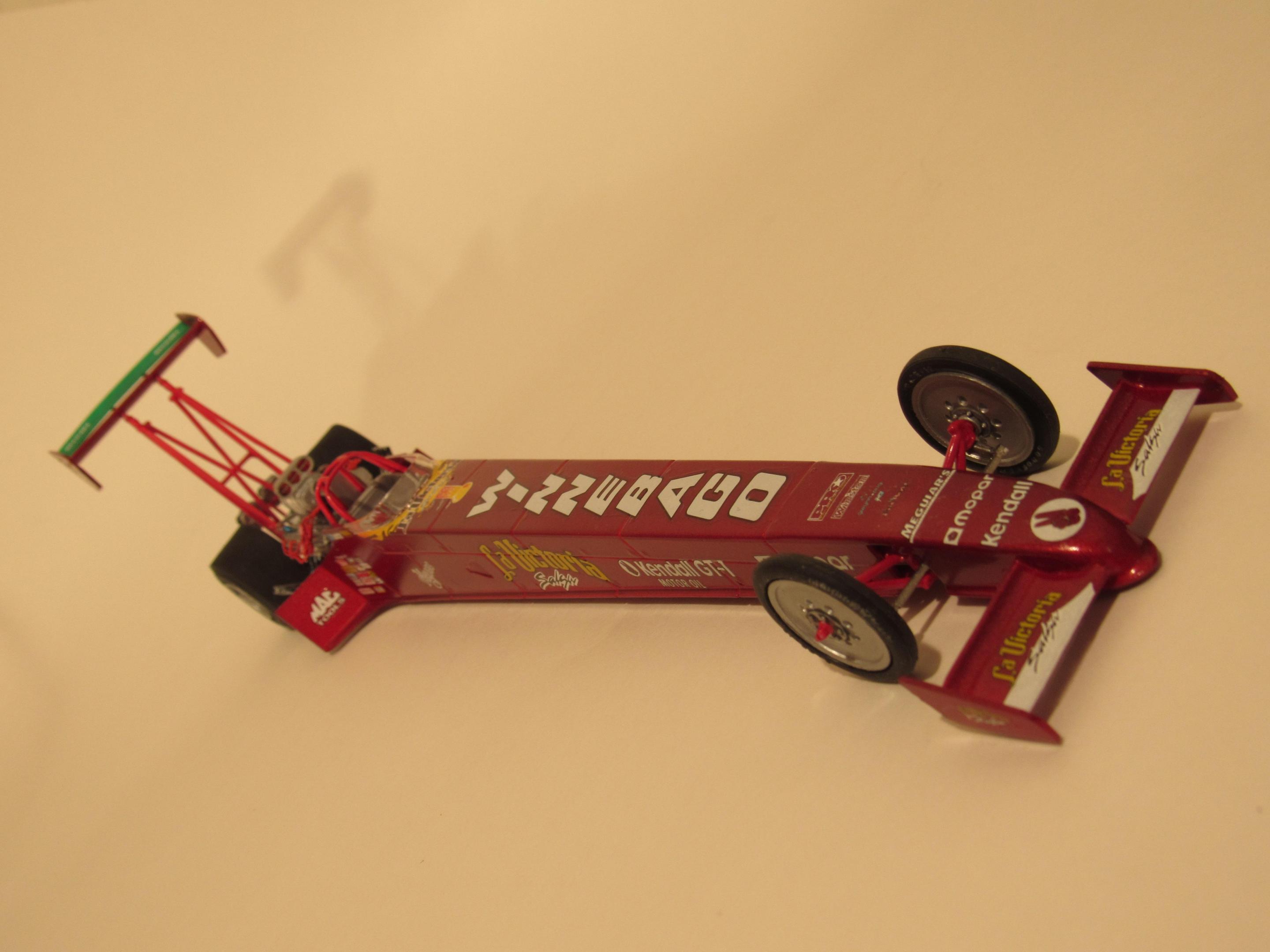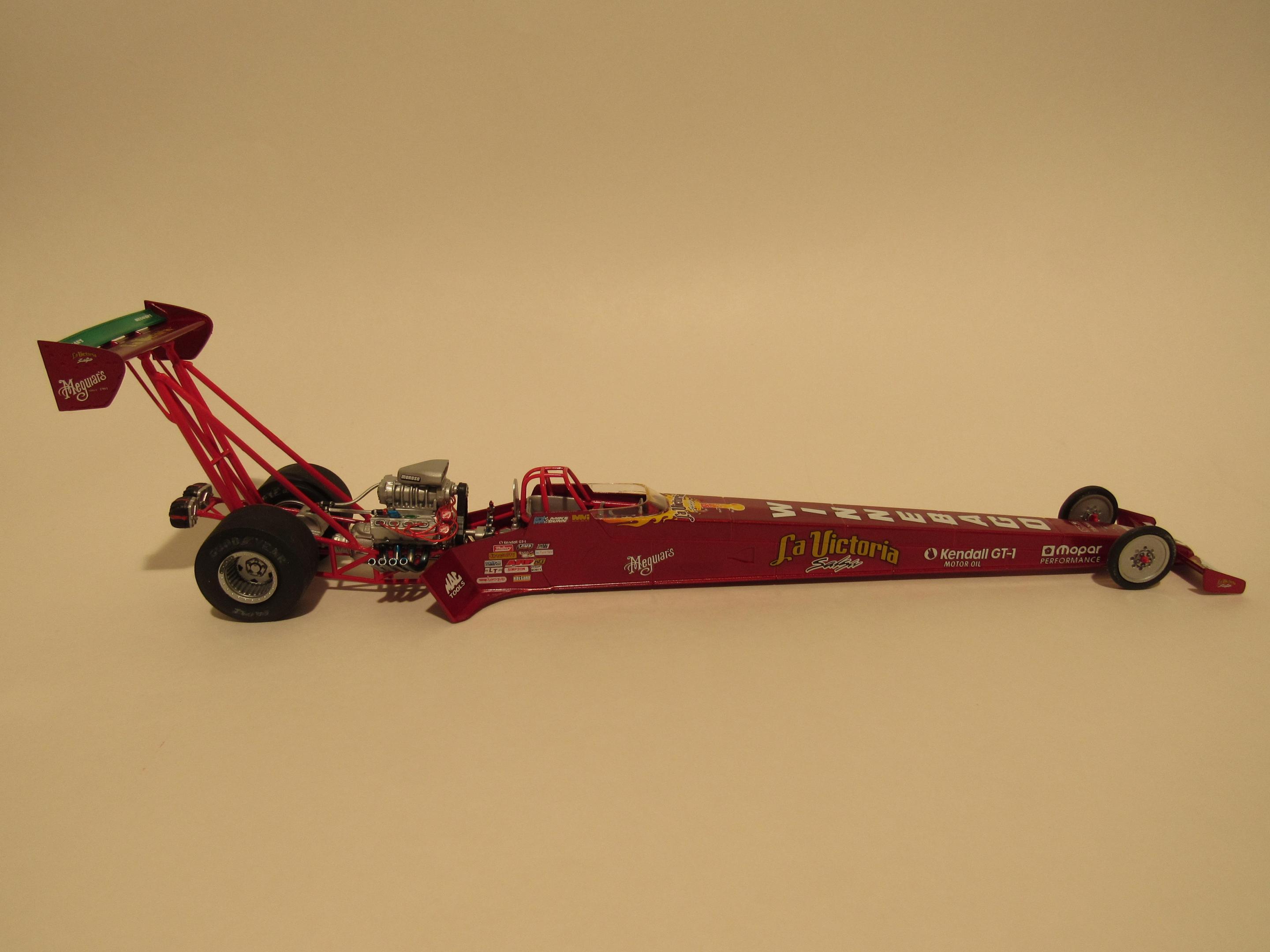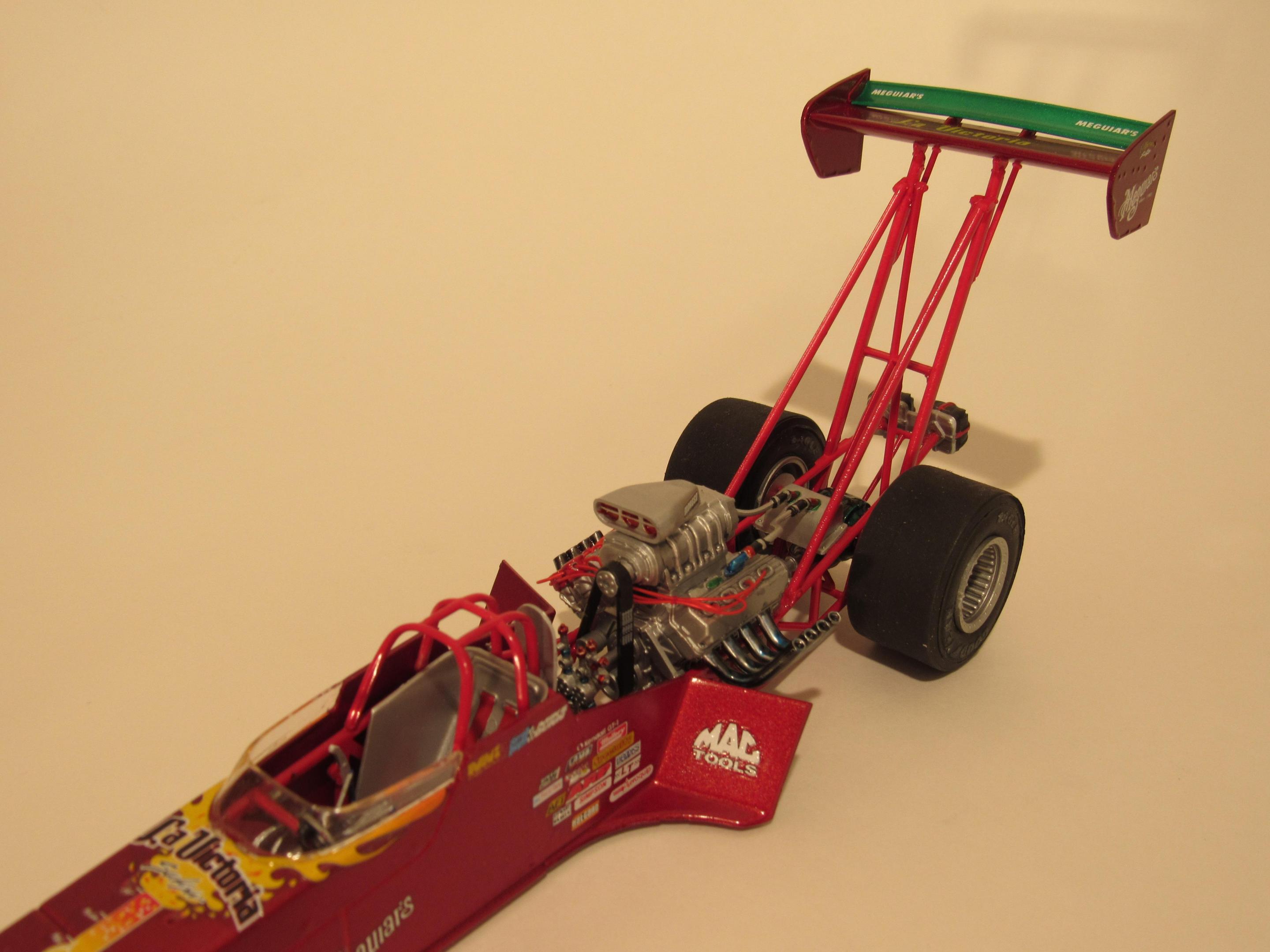 Base kit was the Revell Eddie Hill Pennzoil Top Fuel. I used a set of Slixx La Victoria decals I had transforming it into my own racer. Not supposed to be an exact replica because in my little scale world I am immensely rich and good looking and this would be one of my many play toys. I will admit despite the few mistakes I am rather proud of this build.