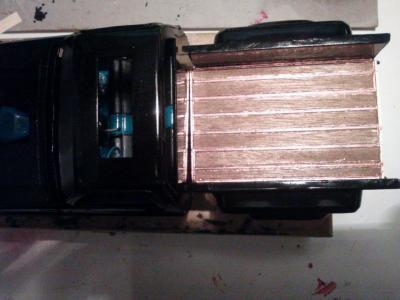 1. Real wood bed floor with copper trim, craft spray paint,acrylics on the inside. Donk wheels & tires. Blown 454 from Heavy Chevy Malibu.