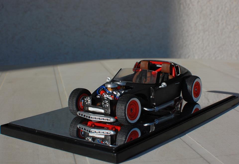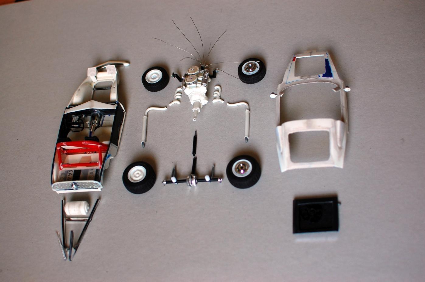 after finishing the 911 fiat 500, the mustang turbo and the '49 merc i had a lot of parts left: - a 911 body (without fenders, bumpers and roof) - a 426 hemi cross ram (optional engine for the merc) - custom wheels and tyres (also optional for the merc) - 2 bucket seats (guess what: optional for the merc) and plenty of small parts but no - suspension - transmission - radiator as of many volksrods have already been build from beetles but no porsches were "rodded", i decided to call it porschrod basic decision was: front or rear engine? i wanted to keep the shape of the 911, so i could not mount the only suitable radiator (from a 1/12 motorcycle kit) i had in spare in the front. i decided to go for the front engine option, but to mount the radiator in the rear window with some extra air intakes and an electric fan. i had to make a lot modifications to the 911 body (it was too wide, it was too long, it had no firewall, it had no transmission tunnel, and some more). as i wanted to use as many spare parts as possible i scratched a rollcage, head-rests for the seats, a wheelie-bar, front and rear suspensions, drumbrakes, differential and transmission, a fueltank and some more. also the engine was modified and detailed to my likings. 2 pics before painting and the result.