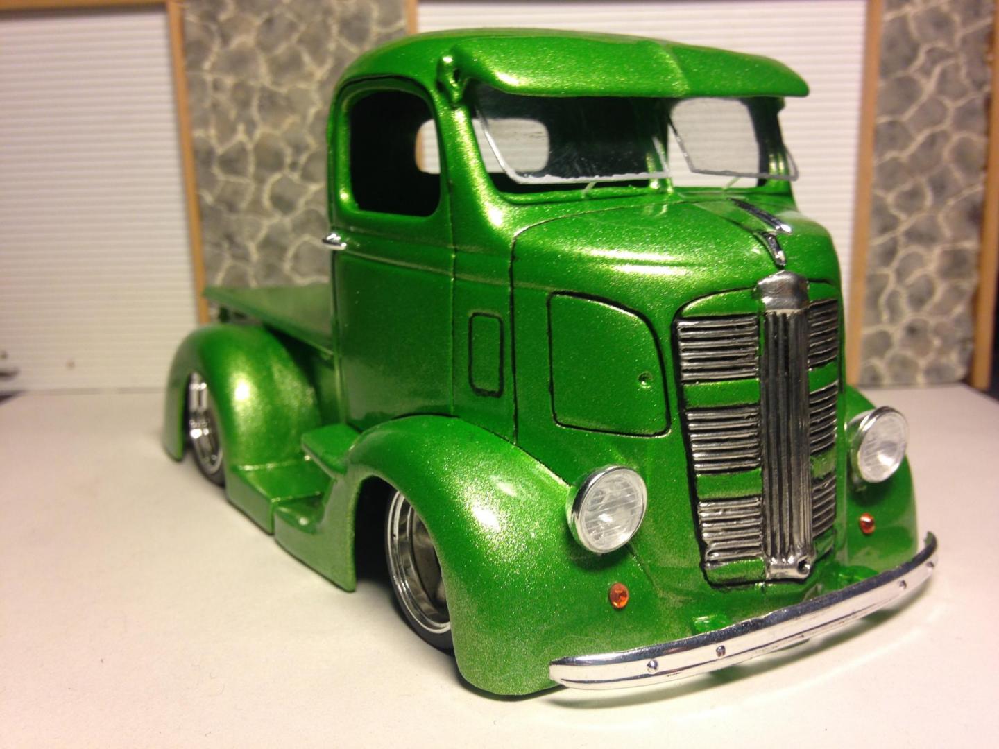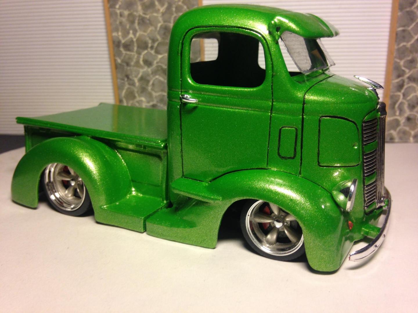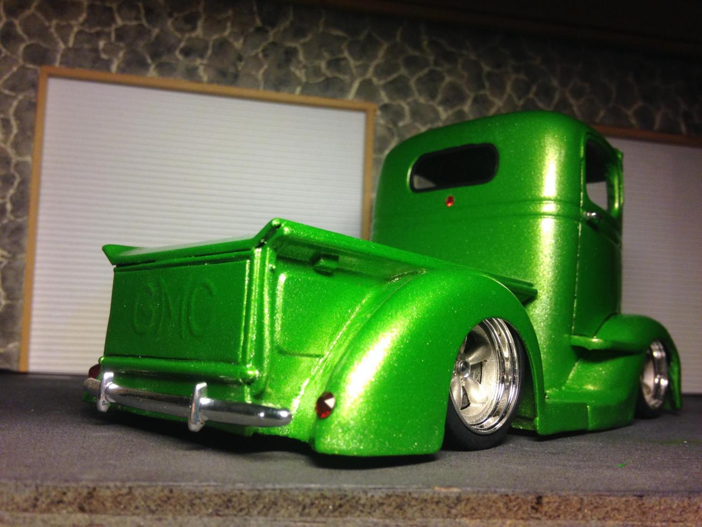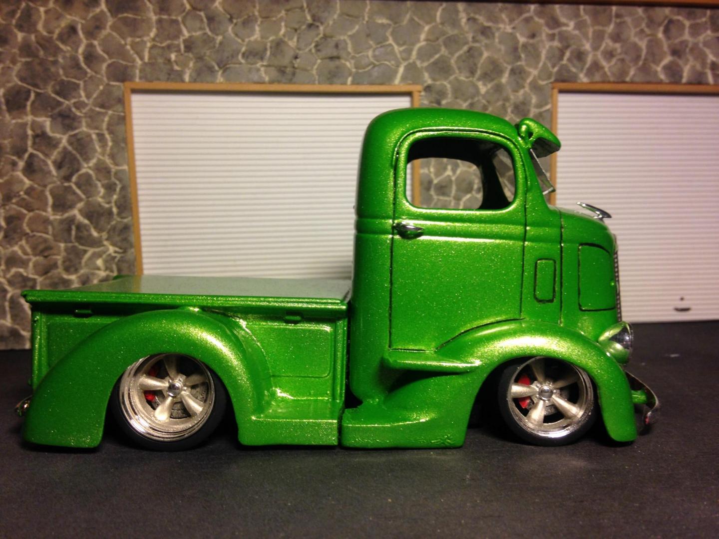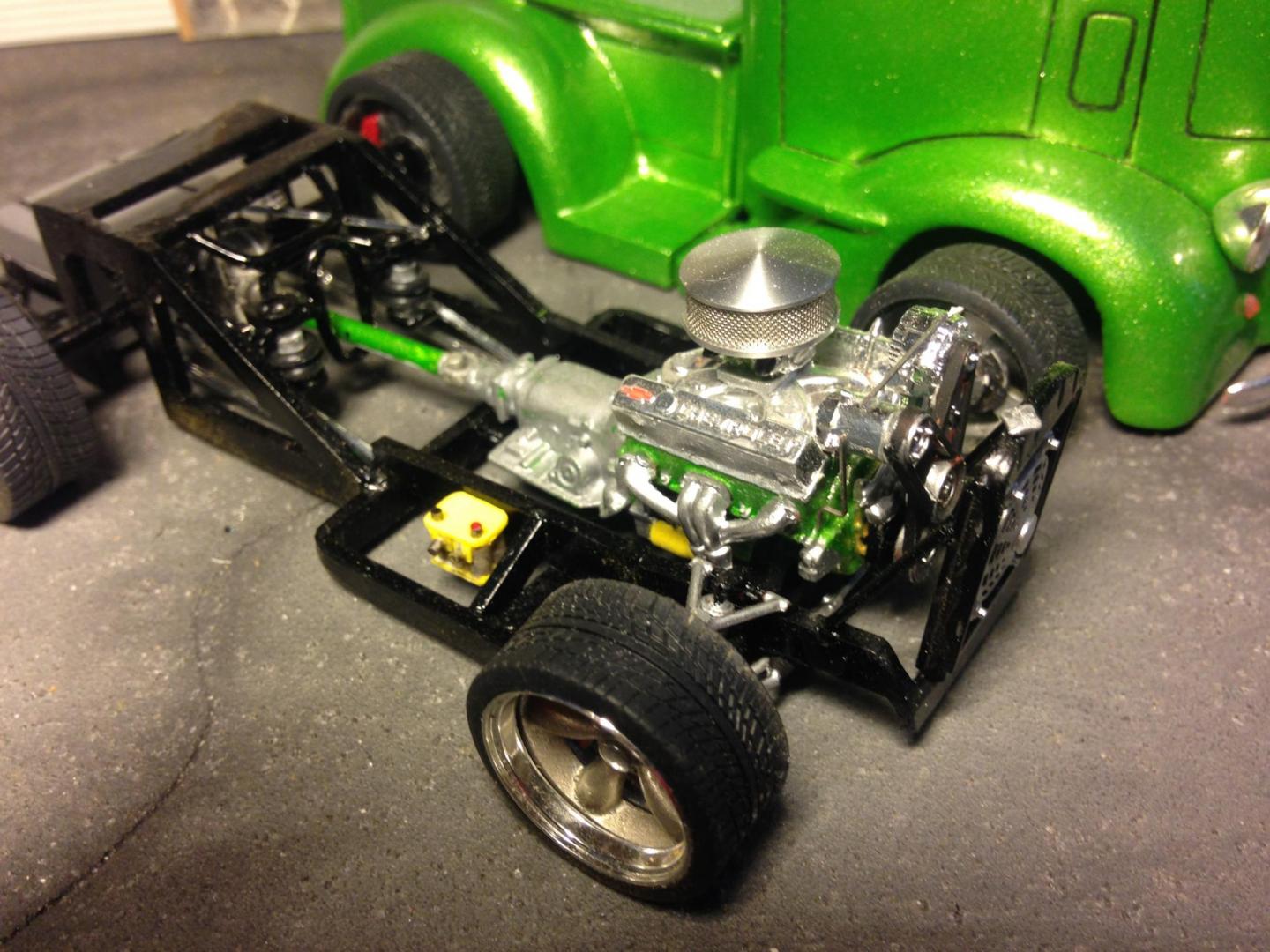 build this after seeing a frame with air rid set up for a rat rod , I started with a Jimmy Flintstone body ,chopped it ,opened the roof ,and drivers door , scratch built a frame with an air ride system , motor is a Chevy S/B w/2-4,s custom headers , there are over 300 wholes that I drilled in the whole model , details go on and on ,
