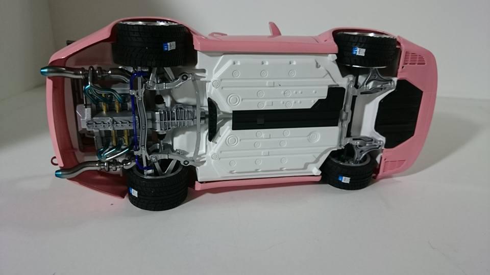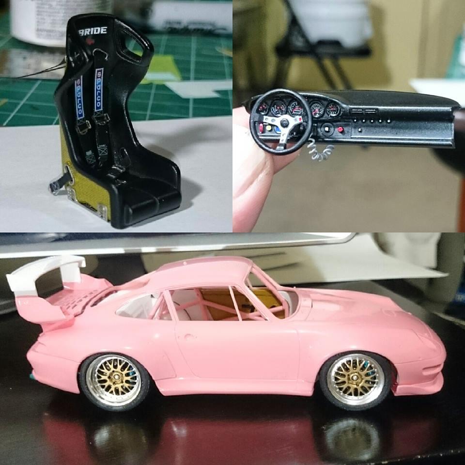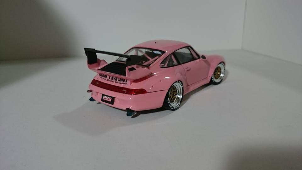 This is Tamiya's 911 GT2 Porsche in Gravity colors Porsche Pig Pink. Heat stained exhaust and added details like Hobby Design Bride seats with Edward harnesses and other small details.