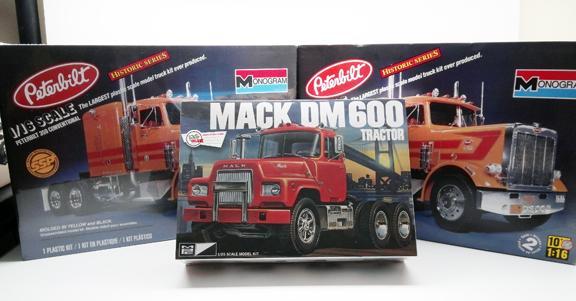 I got these over the past couple of days. The 1/16 Pete kits were Ebay purchases, one sealed and one open but complete. I picked up the Mack today at Hobby Lobby with the coupon. It was good to see something there other than their endless supply of Freightliner COEs. -