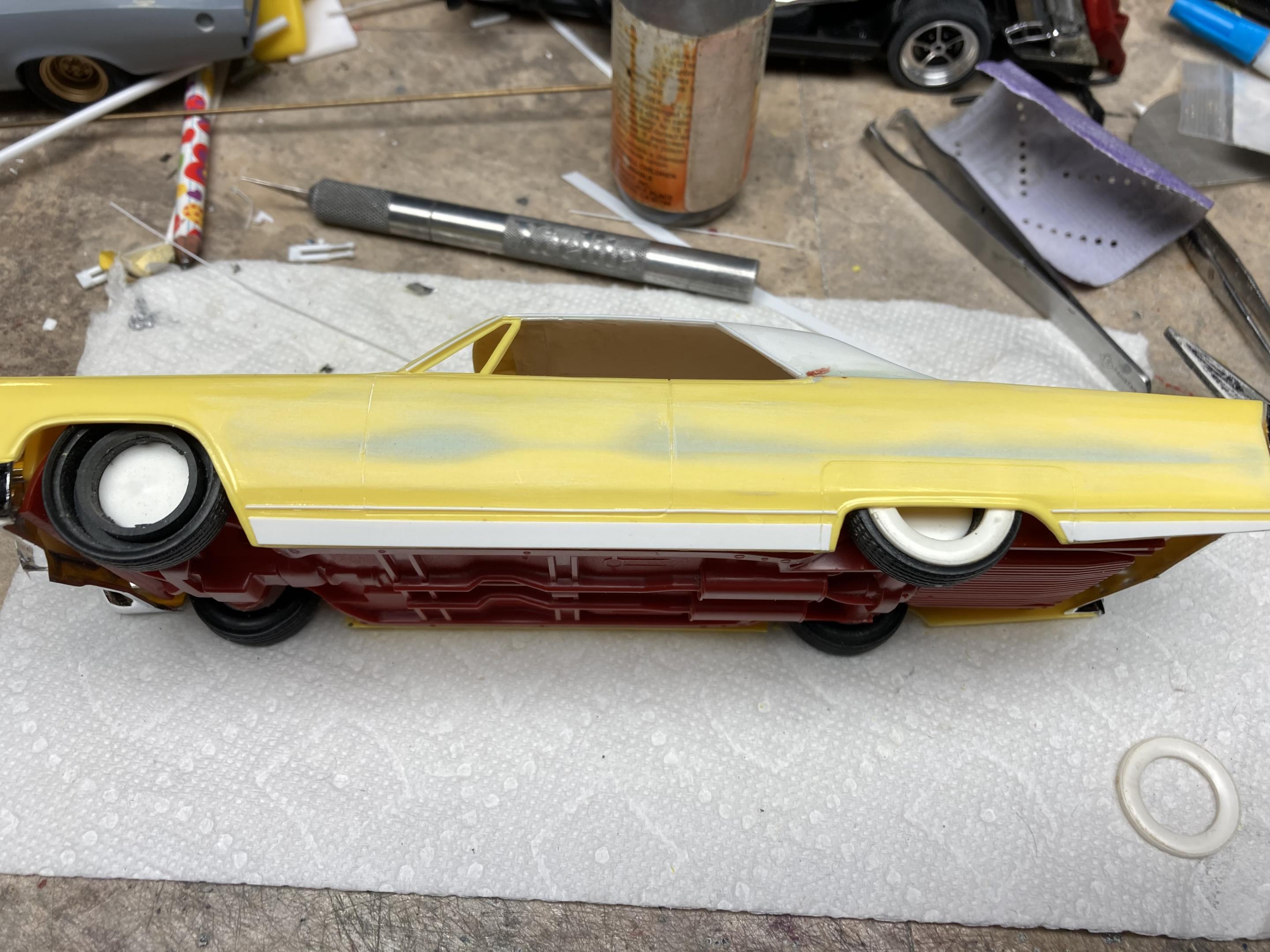 Floating out the bodywork. Stupid thing had a groove around the bodyside molding I removed. Going to add rocker chrome to it instead of the bodyside molding.