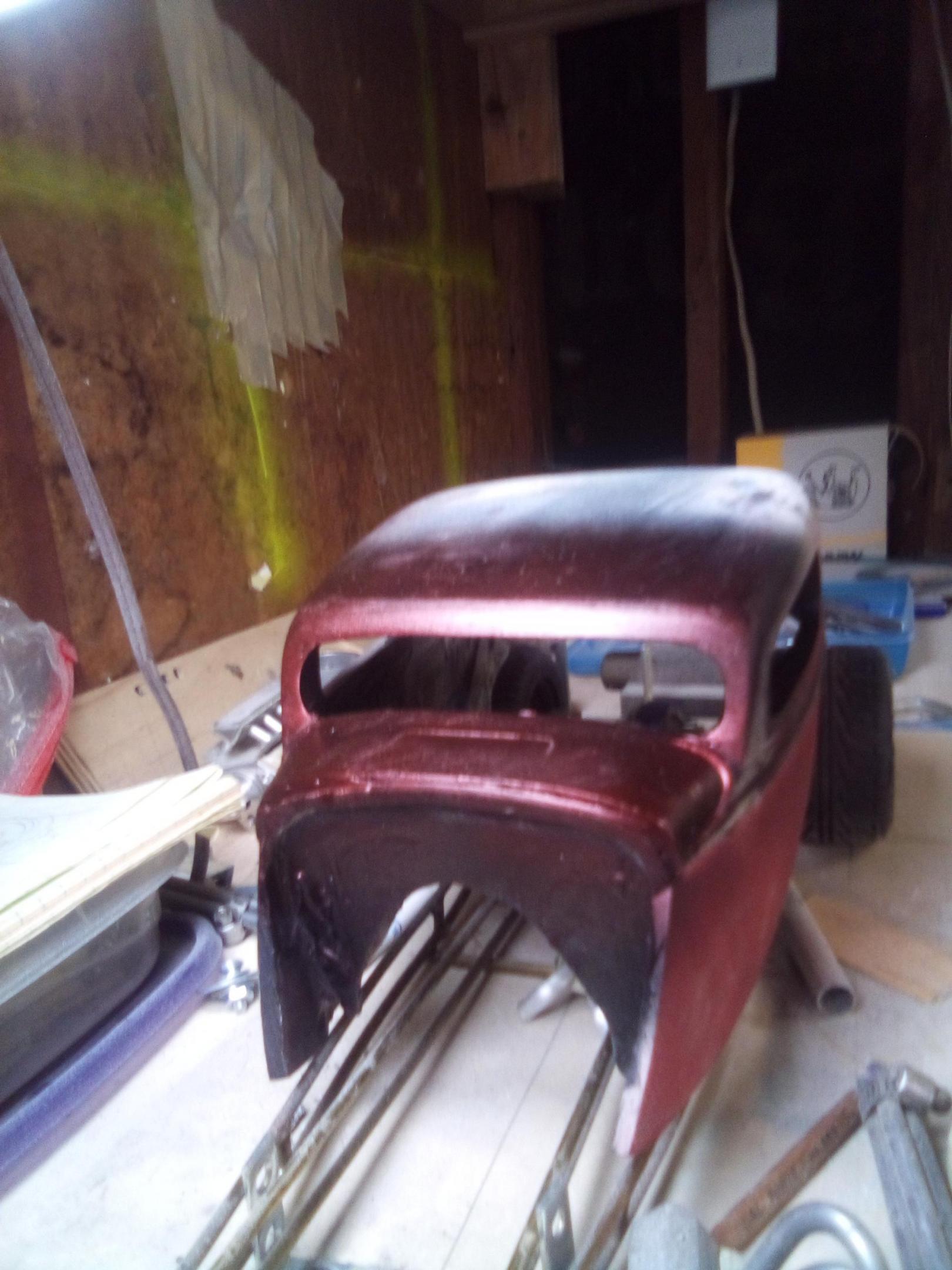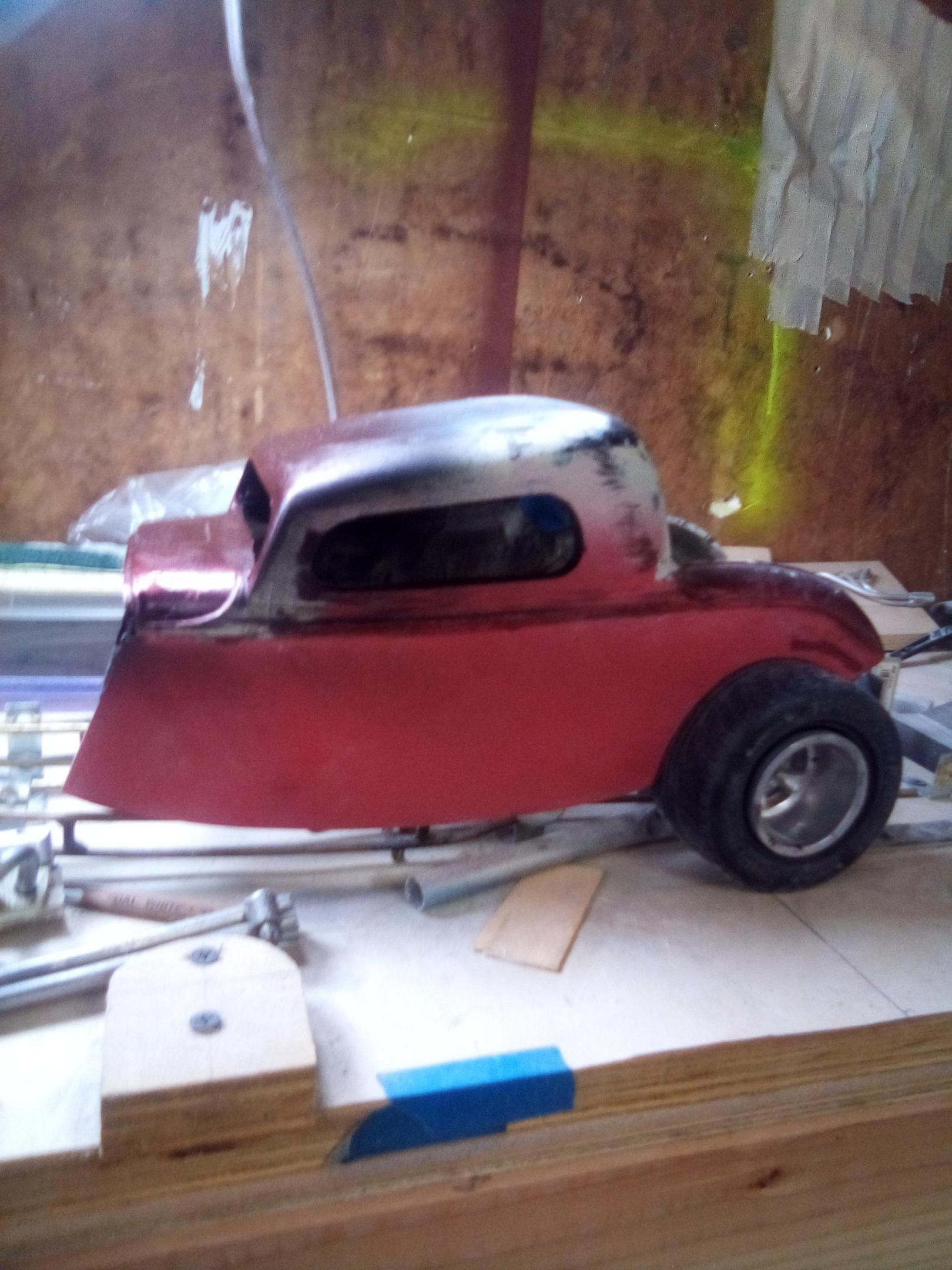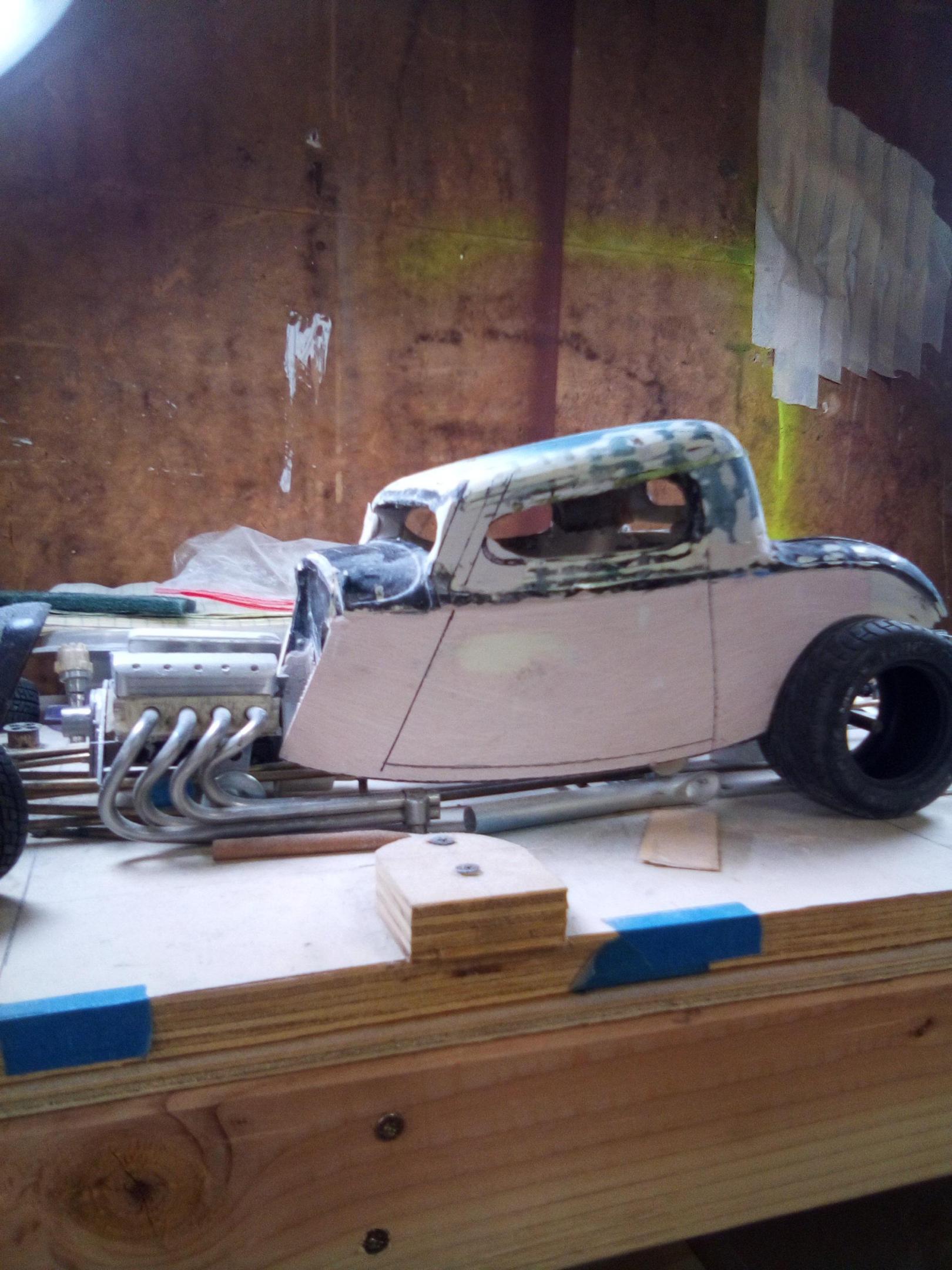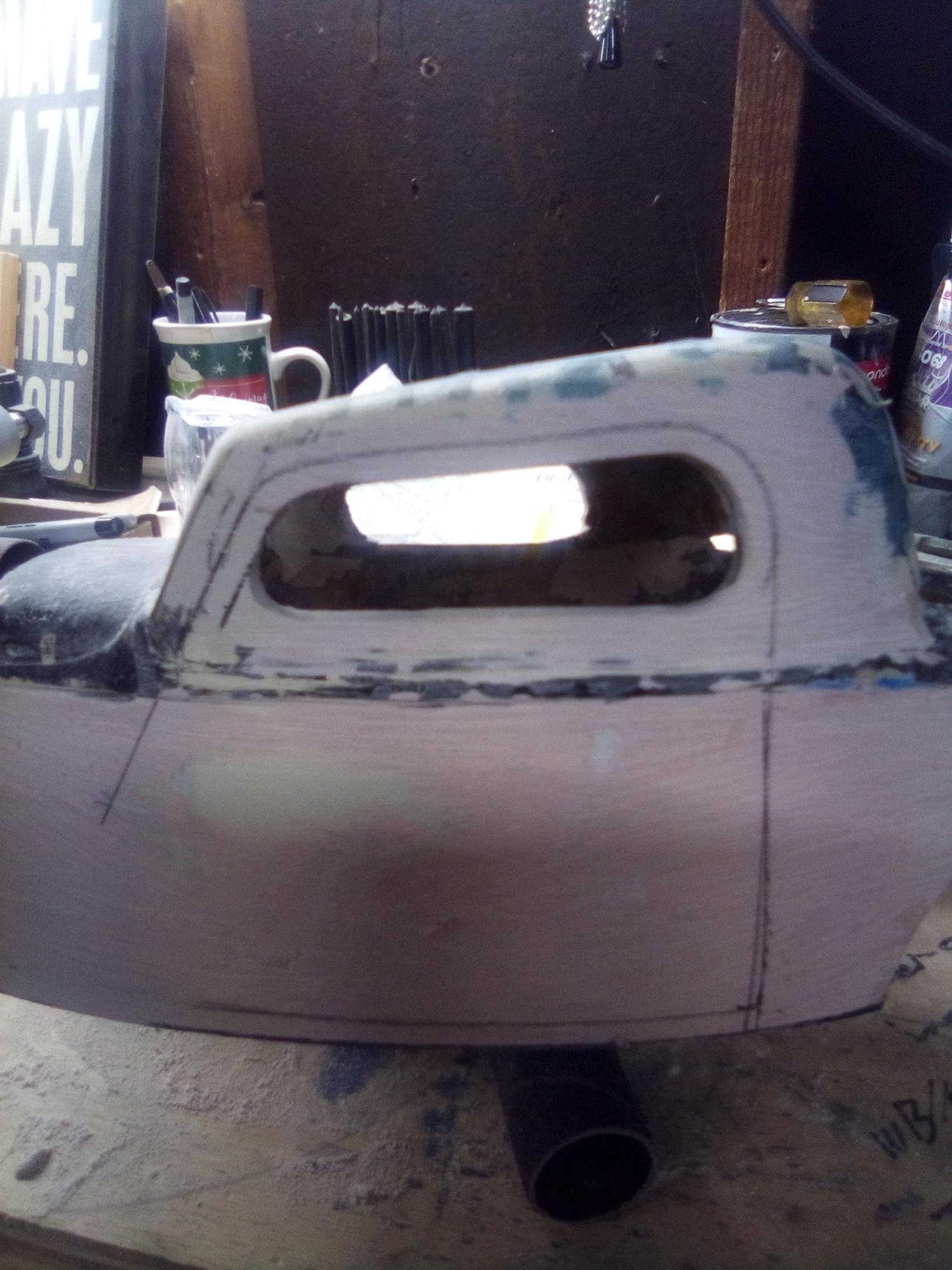 I have 2 main problems with the way the car looks from the side at this point... The radius where the cab back rolls over into the top is too tight needs to be flatter, larger. It's too "peaky" if you will. Upper rear corner of door window opening is too tight, small. Needs to somewhat match the profile of the final radius across the top...ii think... This is the cool factor in scratch building and modding stuff...trying to build what you see pictured in your head. If something's not right you know it but can't always identify it Immediately. Sometimes takes multiple redos on a spot before it clicks.