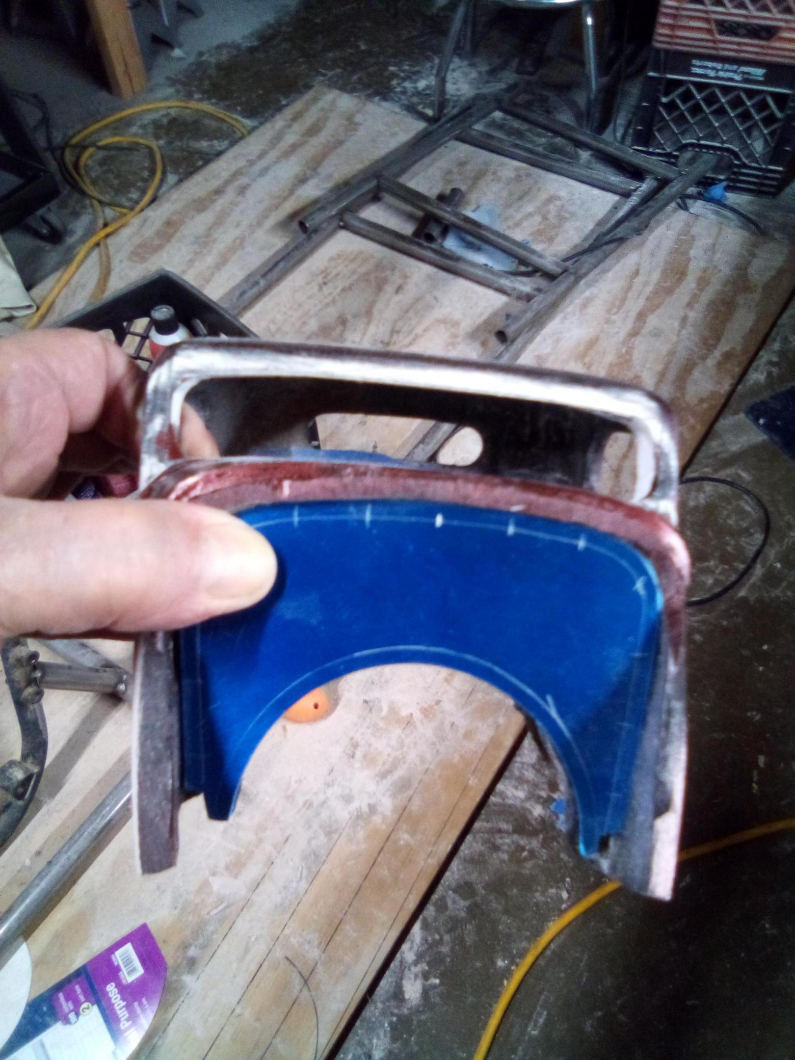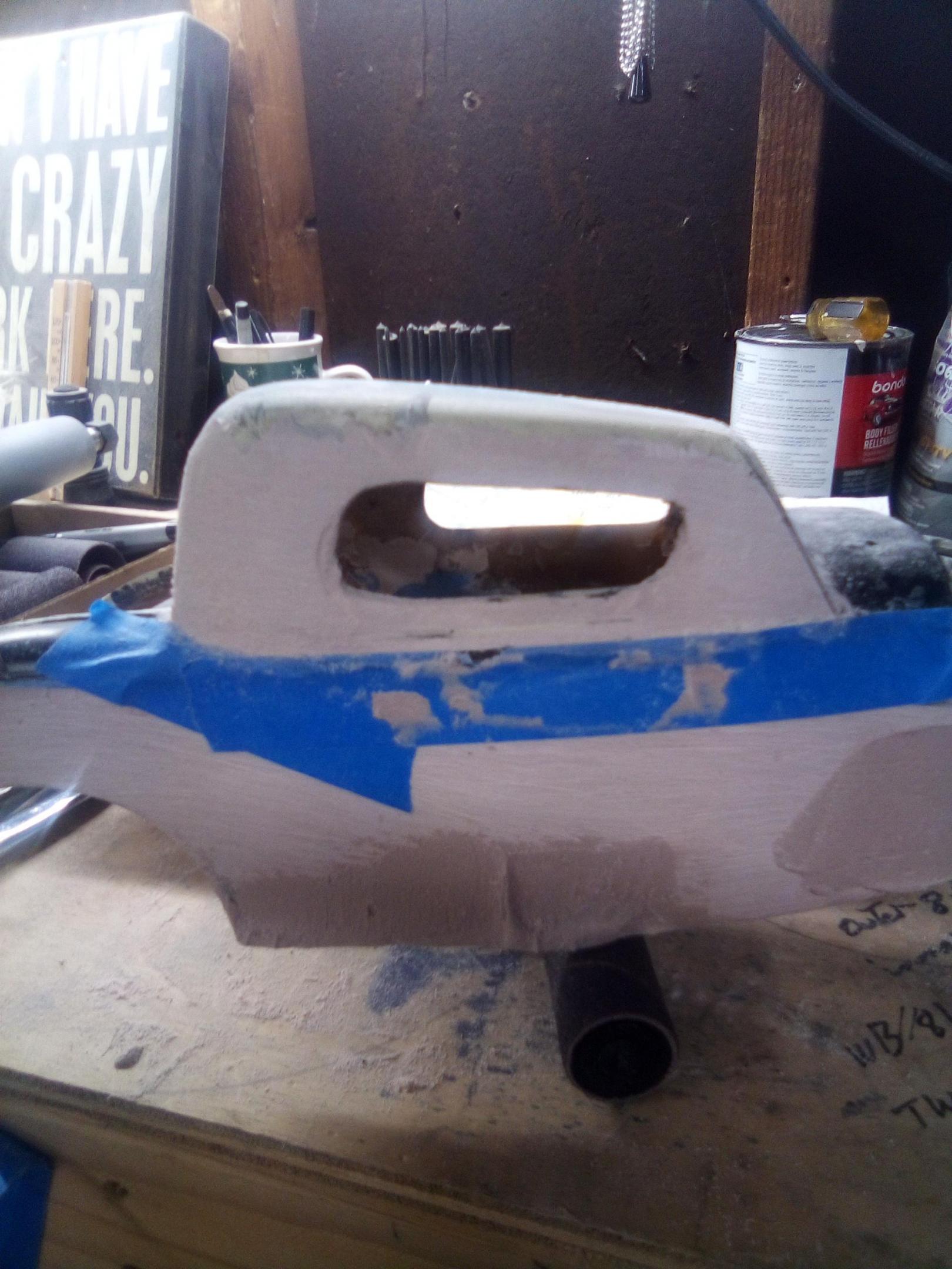 What the panel looks like at the beginning g of a coarse 40 grit block. Can see how the hard block bridges the low areas. Initital rough in was done with a small hand held belt sander. Second pic shows the other side after a second bockout with 80 grit. Have a nice transpearant bronze metallic I'm playing with here as well.