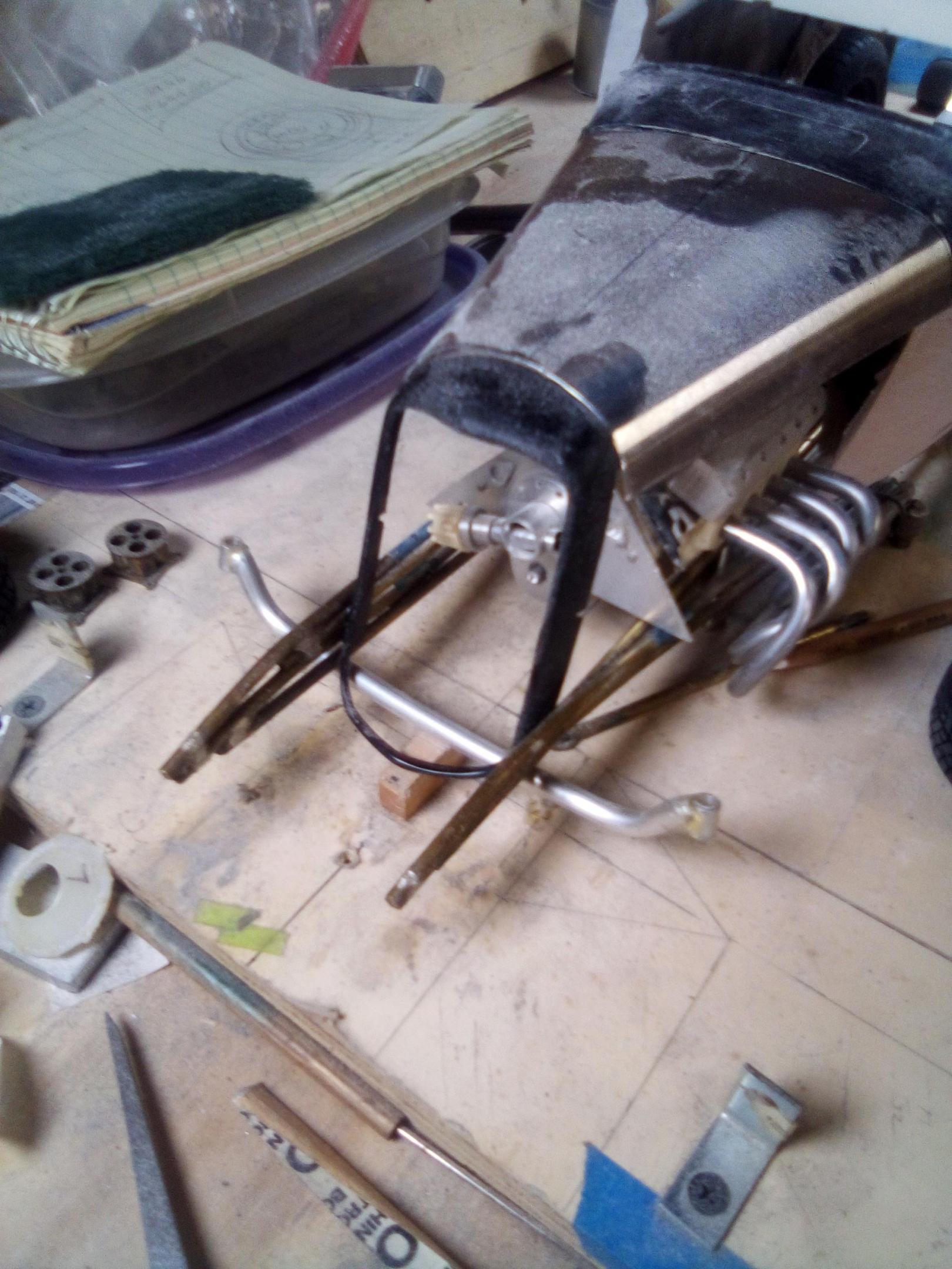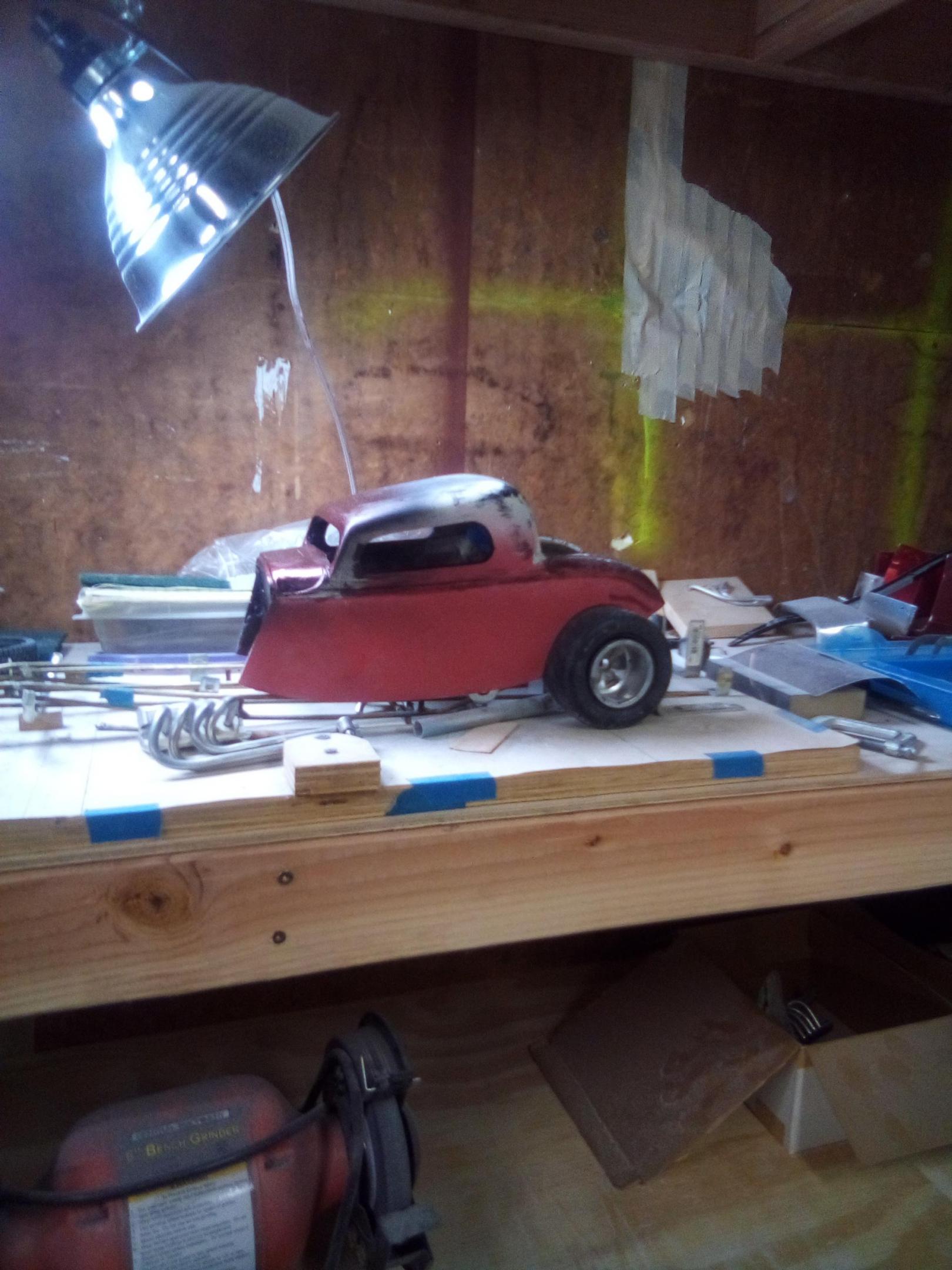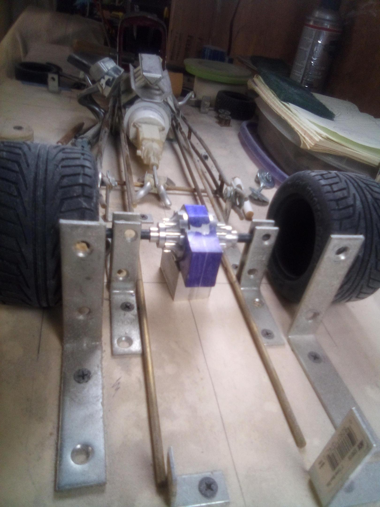 As I think about this, I order my thinking so that my thoughts and decisions are as tho I'm building 1 : 1. original concept for it was Euro coupe, if you will, 4 wheel independent with F1 inspired suspension with tube links. Lots of photo on first few pages of thread. but I don't know, the way it's starting to look to my eye...stuck the axle I bent in the other roadster thread under it to see how it looks.