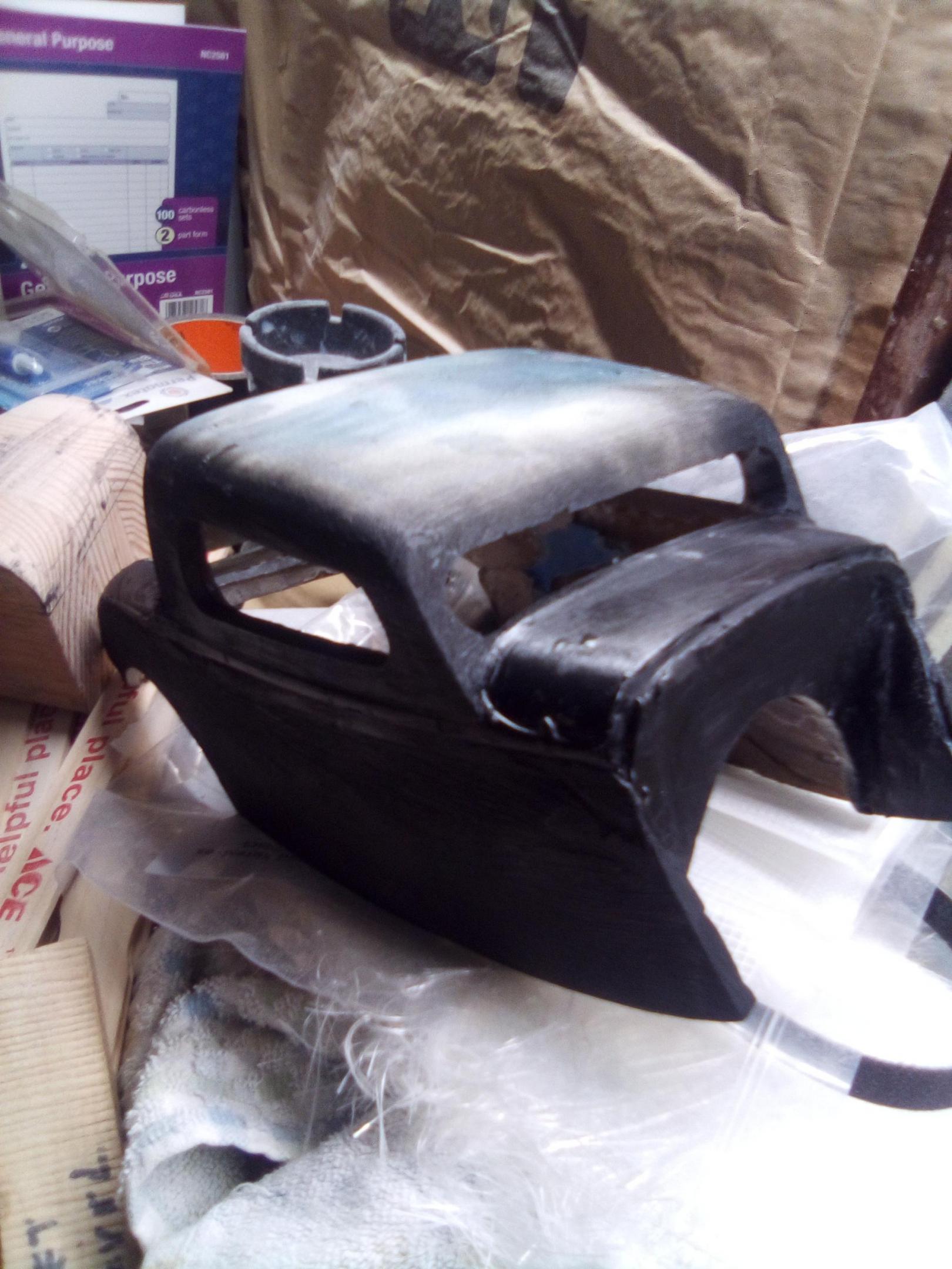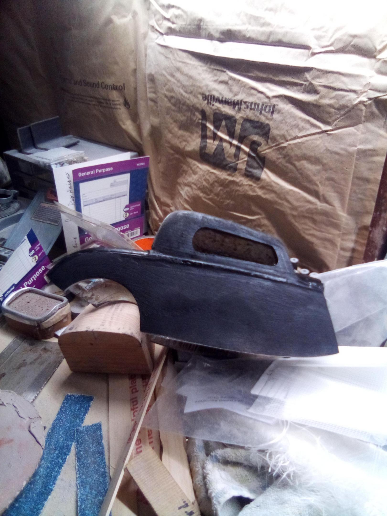 Everythings roughed in at this point. Spritzed a coat of black for guide coat. When I sand on it with a hard block, the black will sand off of the high spots leaving color in the low areas as the block bridges across them. Keep working the highs untill they are worked down to the level of the lows, producing a straight panel. The A pillar still needs final profile, as well as finalizing the shape and radius of the upper portion of the windshield opening.