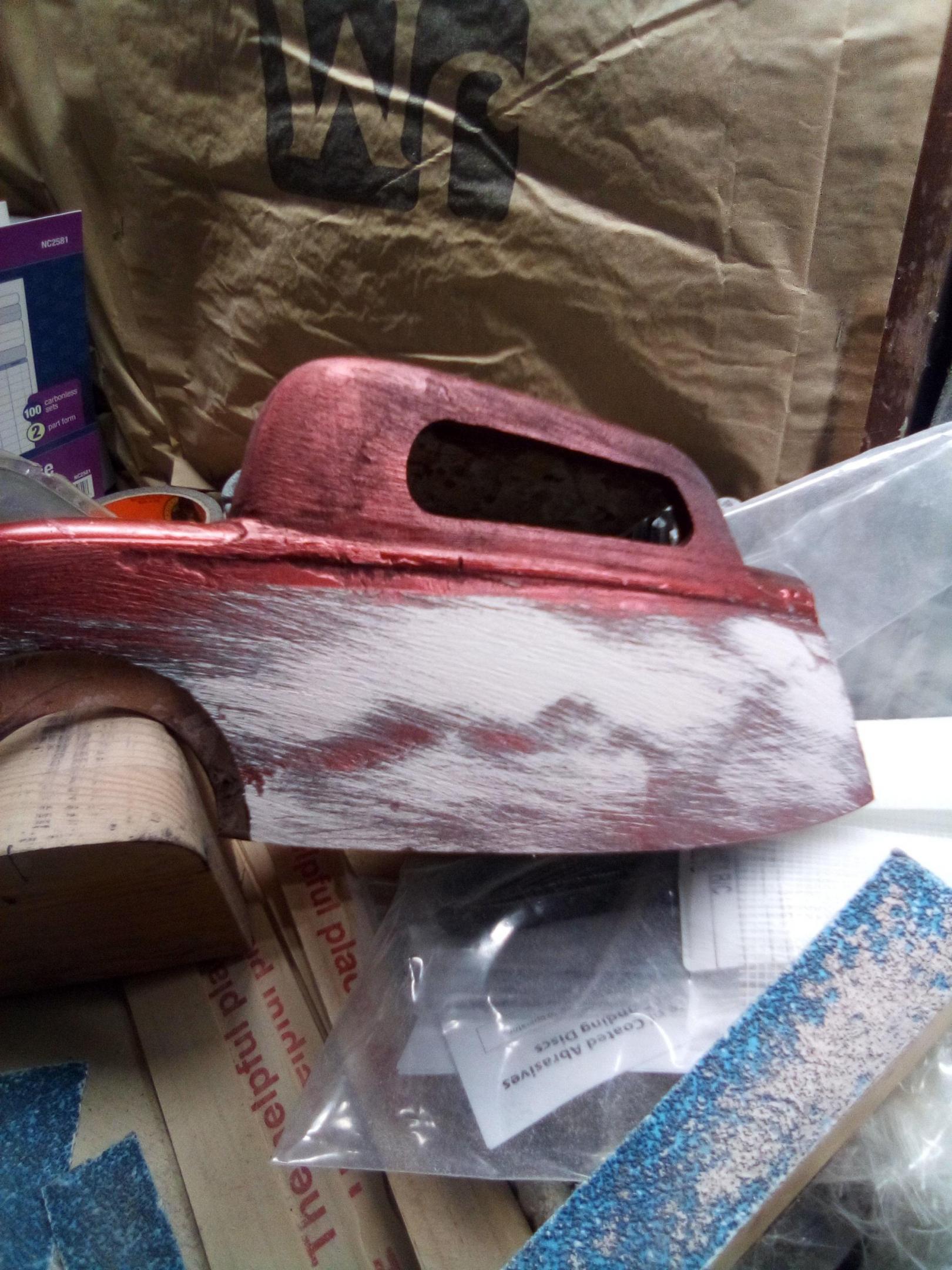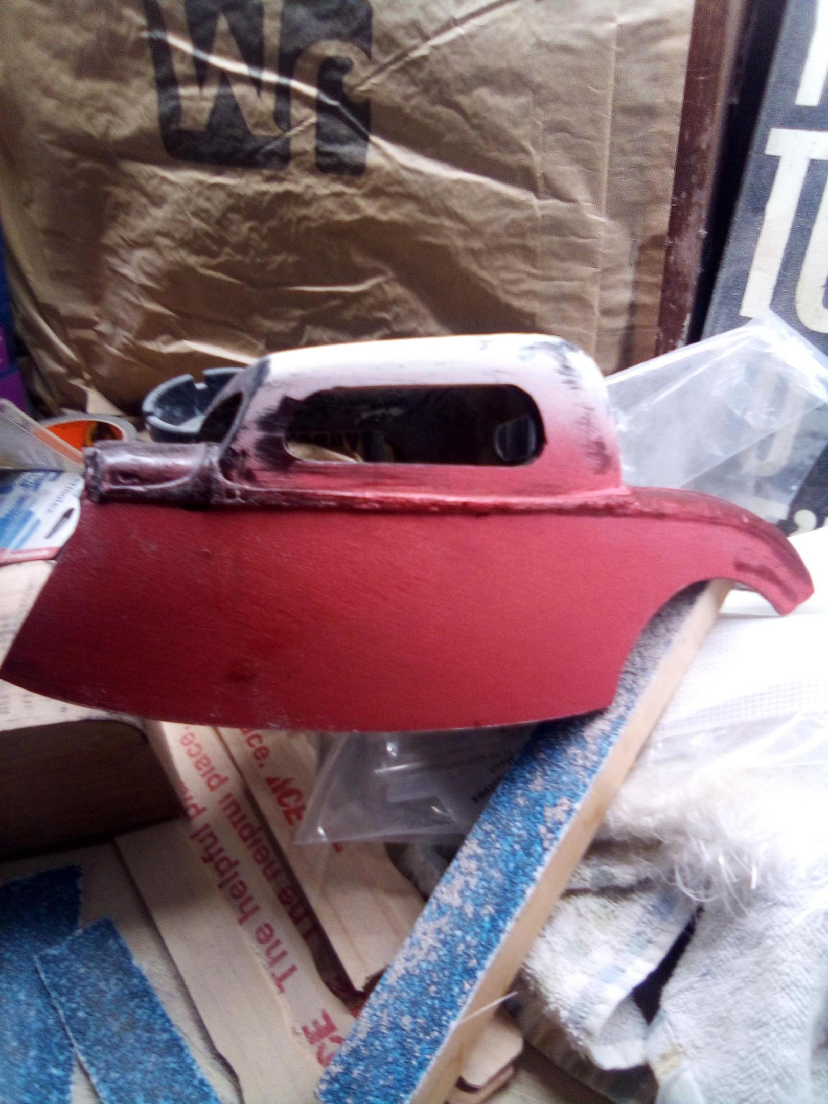 The red on the cowl is the same mix as the red on the side shot, above. It is transparent enough that the base color it's sprayed over influences its final appearance. I'm close on the shape I want on the driver's side of windshield opening. Still too rounded on other end. I just stroke it a bit and then set it down and look at it for a while. Make sure I'm getting what I want visually.