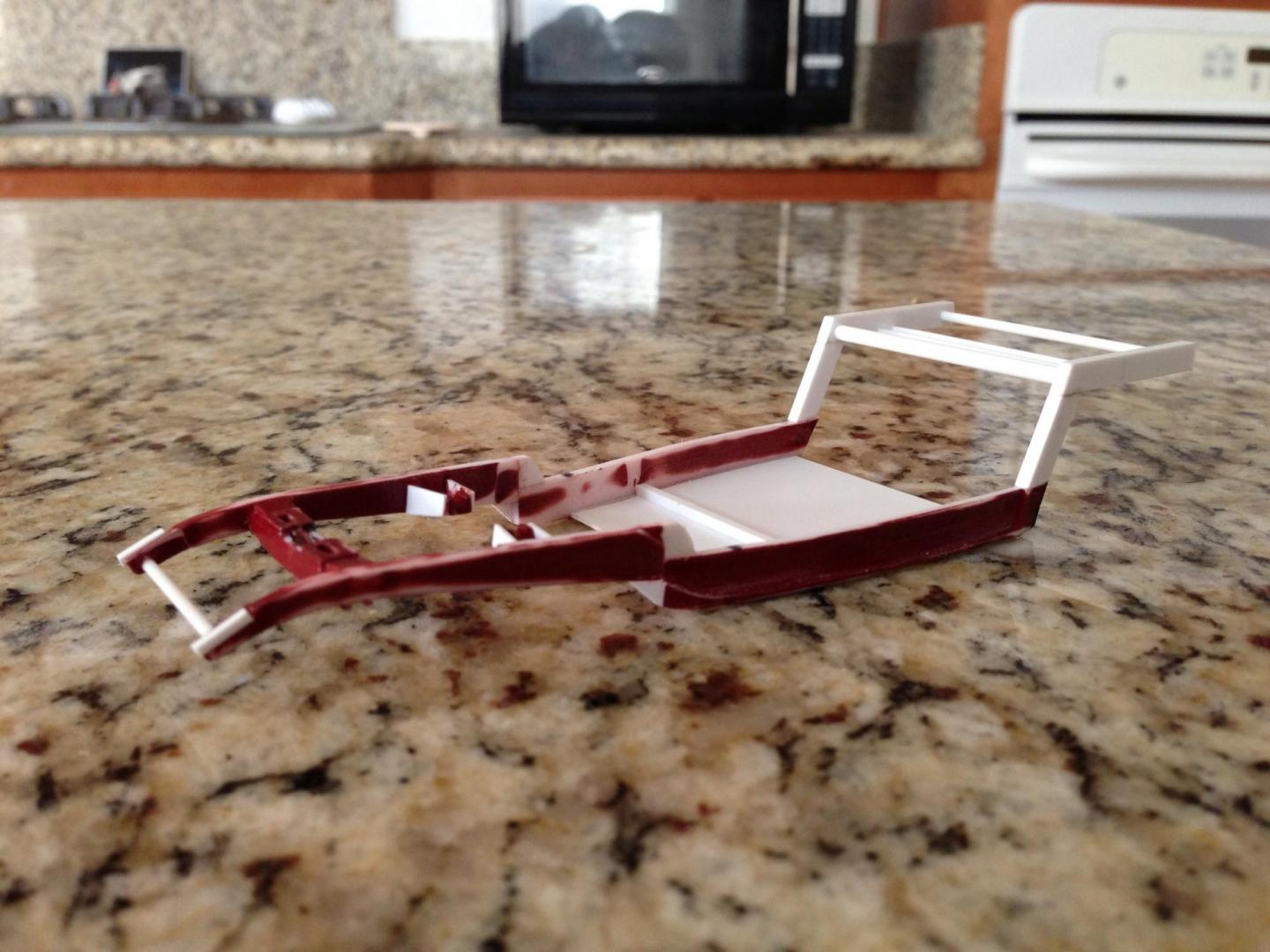 I was sitting in traffic, when I got this idea. So I went home, cut the back half off of the front crossmember, and glue in a piece of styrene to lower the front suspension. Then I Z'd the rear suspension and modified the floor pan. I'm going to have to modify the radiator to get it to fit, and notch the underside of the frame rail to get the spring to clear.
