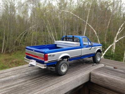 I finished this up maybe a month ago and haven't had a chance to post pics till now ,been super busy lately. I built it as a 4x4 f250, scratch build the back rack and modified a grill guard from a bronco to put on it. I haven't decided on a motor yet, I've been trying to squeeze a 460 in it but it might be to tight a fit, so for now nothing under the hood. Overall I like it a lot, my first attempt at a two tone paint job and it came out great, it is a work truck though so I decided not to give it a shiny finish. Hope you guys like it.