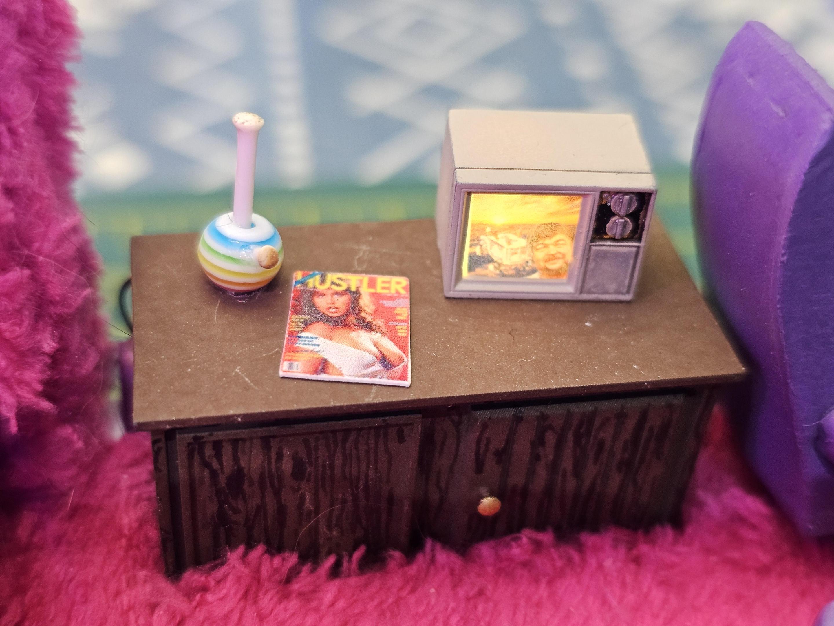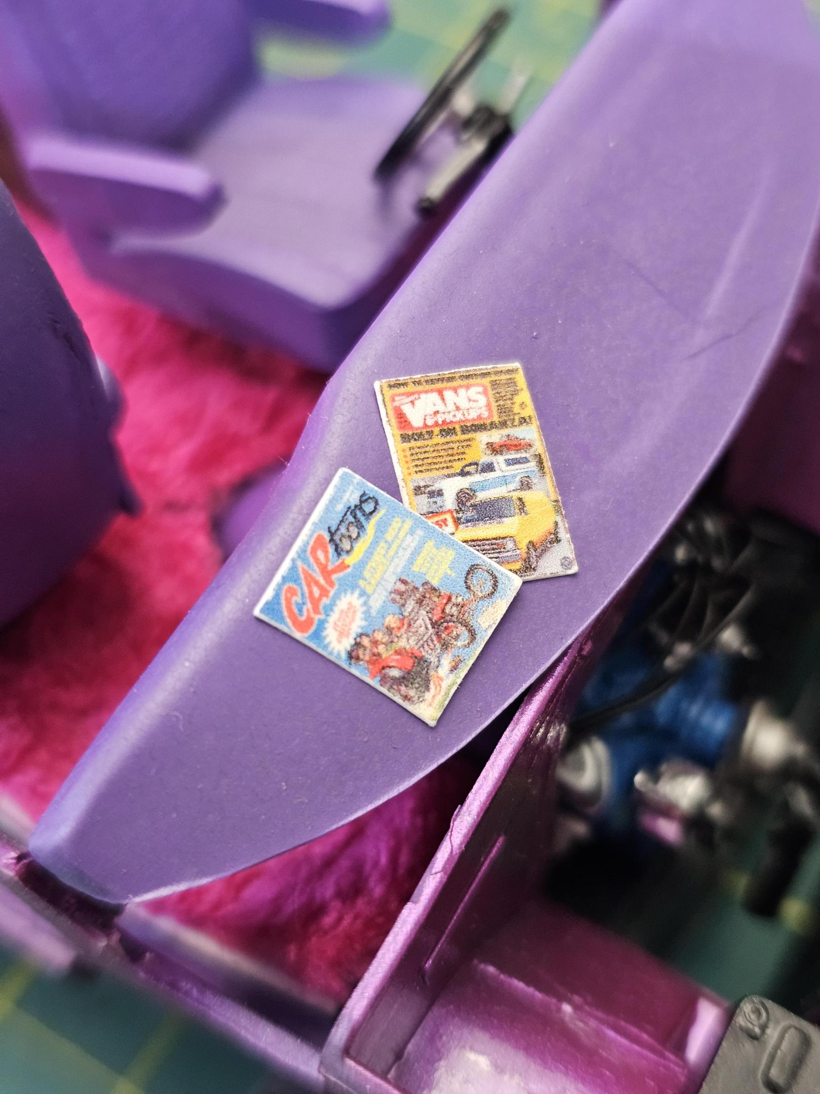 Hey, thank you for the positive feedback man, appreciate it. I just sprayed the side pipes with some SpazStixx chrome. The lighting was from Evan Designs. I got one of their kits with two pink LEDs and one warm white LED, it comes pre-wired with a button cell battery and a switch. I glued the battery and switch to the underside of the floor pan and ran the wiring up the inside of the body to the roof for the pink overhead lights, and ran the wiring for the TV behind the bar cabinet. Evan Designs Link the bar cabinet, TV, and side pipes were designed by me and 3D printer on my Uniformation GKTwo printer. I also sell the files at cults3d or on my website under the "Digital Products" tab. I hope to start selling physical 3D prints at some point in the near future, but not sure when I'll get that up and running. Link to my Profile on Cults3D Link to my site "the Boogie Machine" -