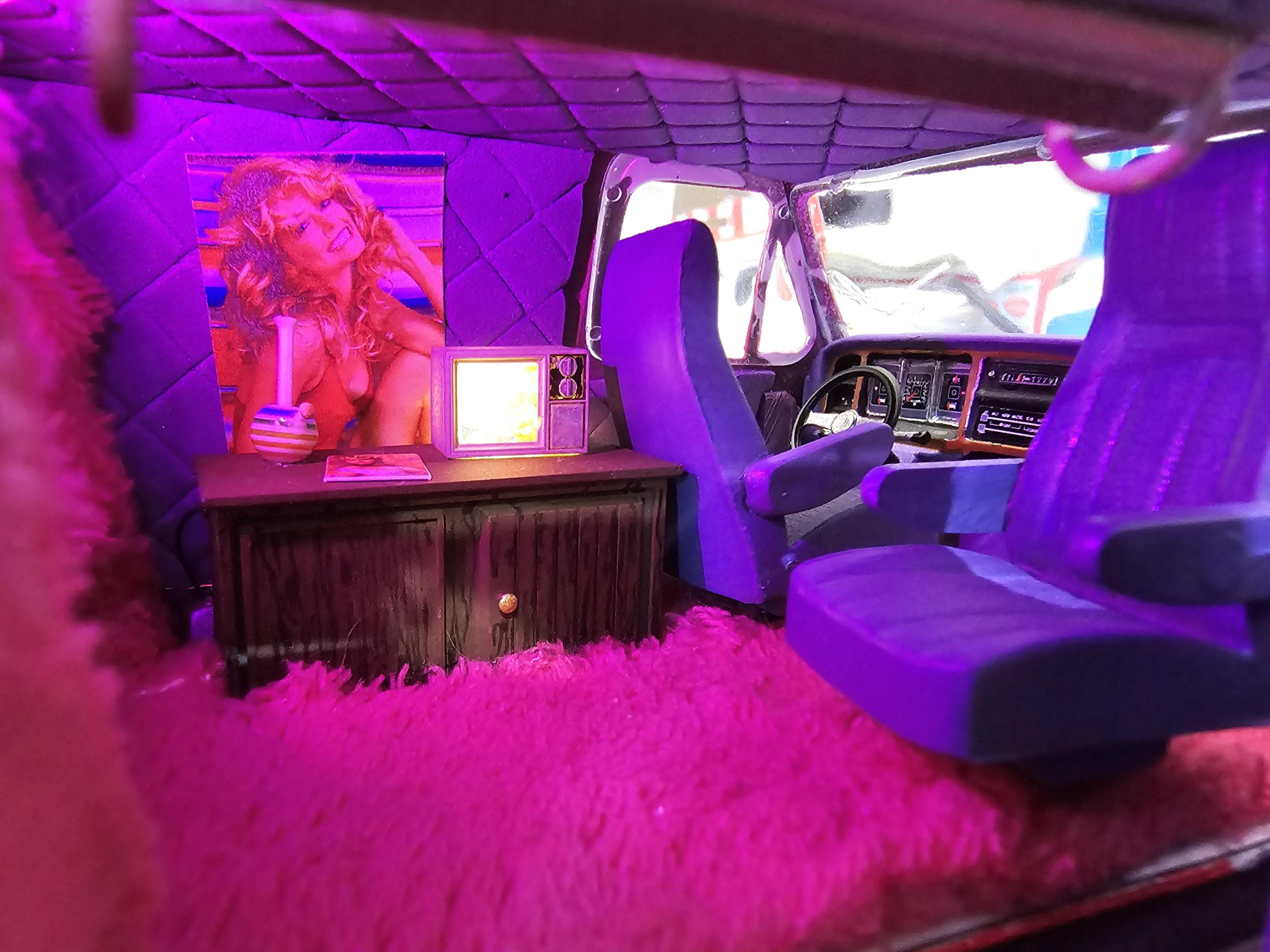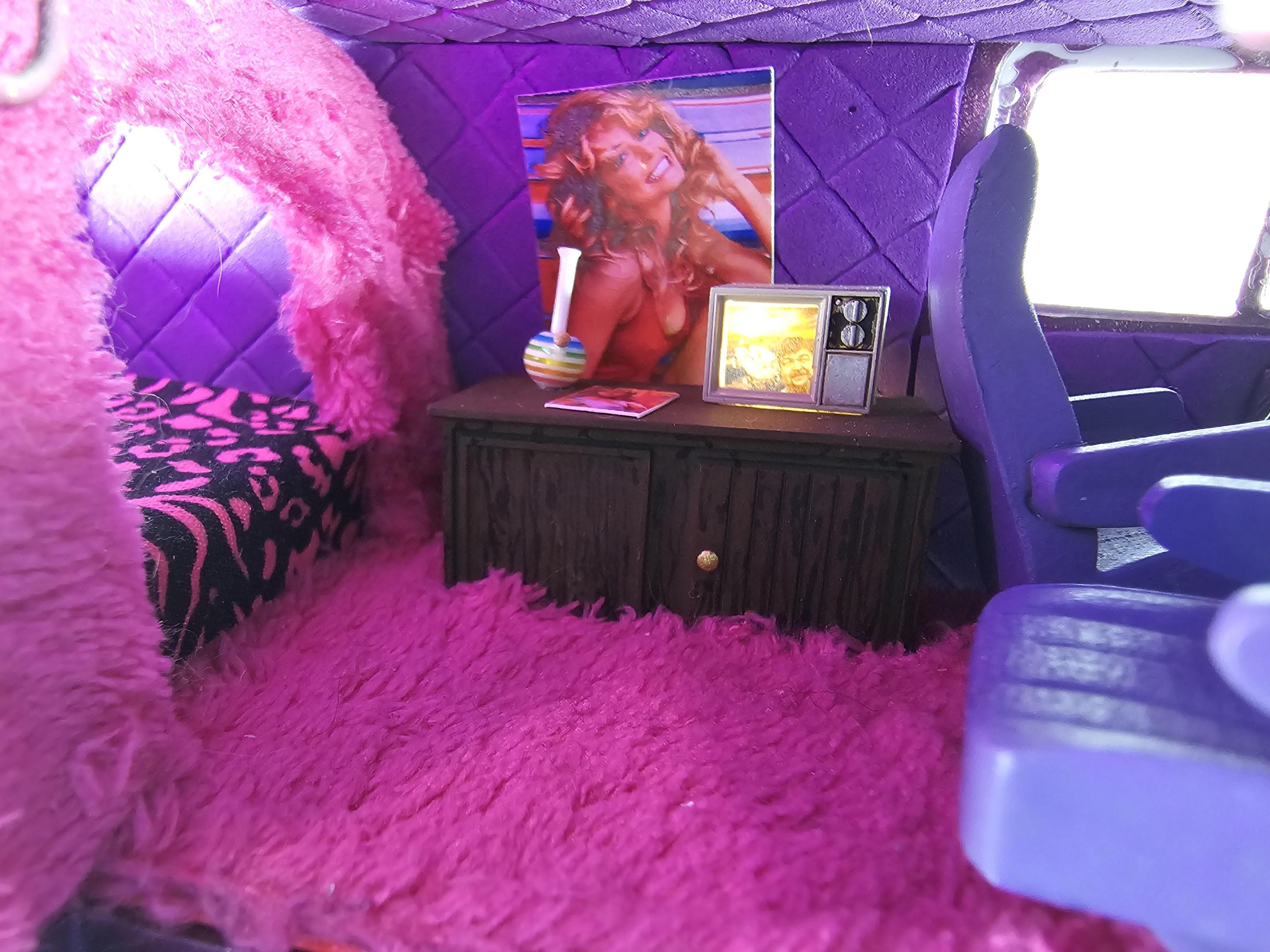 Just finished this one up for a tribute build and auction at Herk's Modelworks on Facebook. Herk passed away in December and a bunch of us in the group are doing builds to auction off on March 16th, sending the proceeds to his family. I'm quickly learning that AMT's kits are a hot mess anymore, at least a lot worse than I remember them being when I was younger, but I still had fun with it. Hopefully he would be proud of it. Paint is from Tropical Glitz using their hot pink basecoat called "Miami Nightlife" and airbrush fade of violet candy around the lower 1/4. I designed and printed the TV, the bar cabinet, and the side pipes. LEDs from Evan Designs (two pink lights in the rear cabin and a warm white for TV backlight). Shag carpet courtesy of a hot pink kids coat from Goodwill, foam bed is covered in some hot pink zebra striped kid's coat material from Goodwill, and diamond stitched interior panels are made of craft foam. Gull wing side door, and some Slixx decals. Also made the pic of Herk with his ice cream truck build for the TV. Threw some magazines on the dash and cabinet, made a "fancy smoking pipe" from a bead set I found at Hobby Lobby, and added a Farrah Fawcett poster to the wall. I think that's about all, but probably forgetting something. Hope you dig it. ??