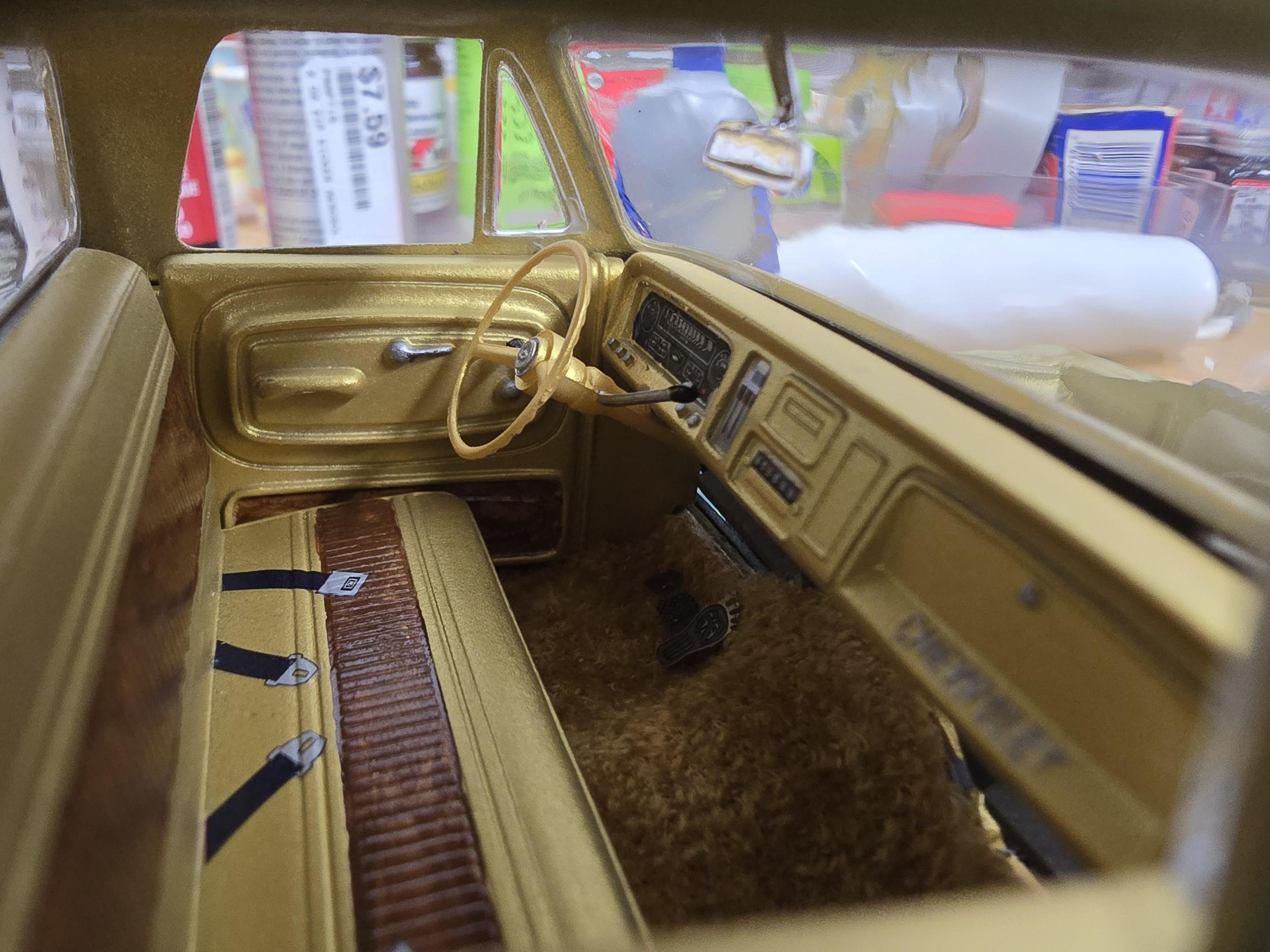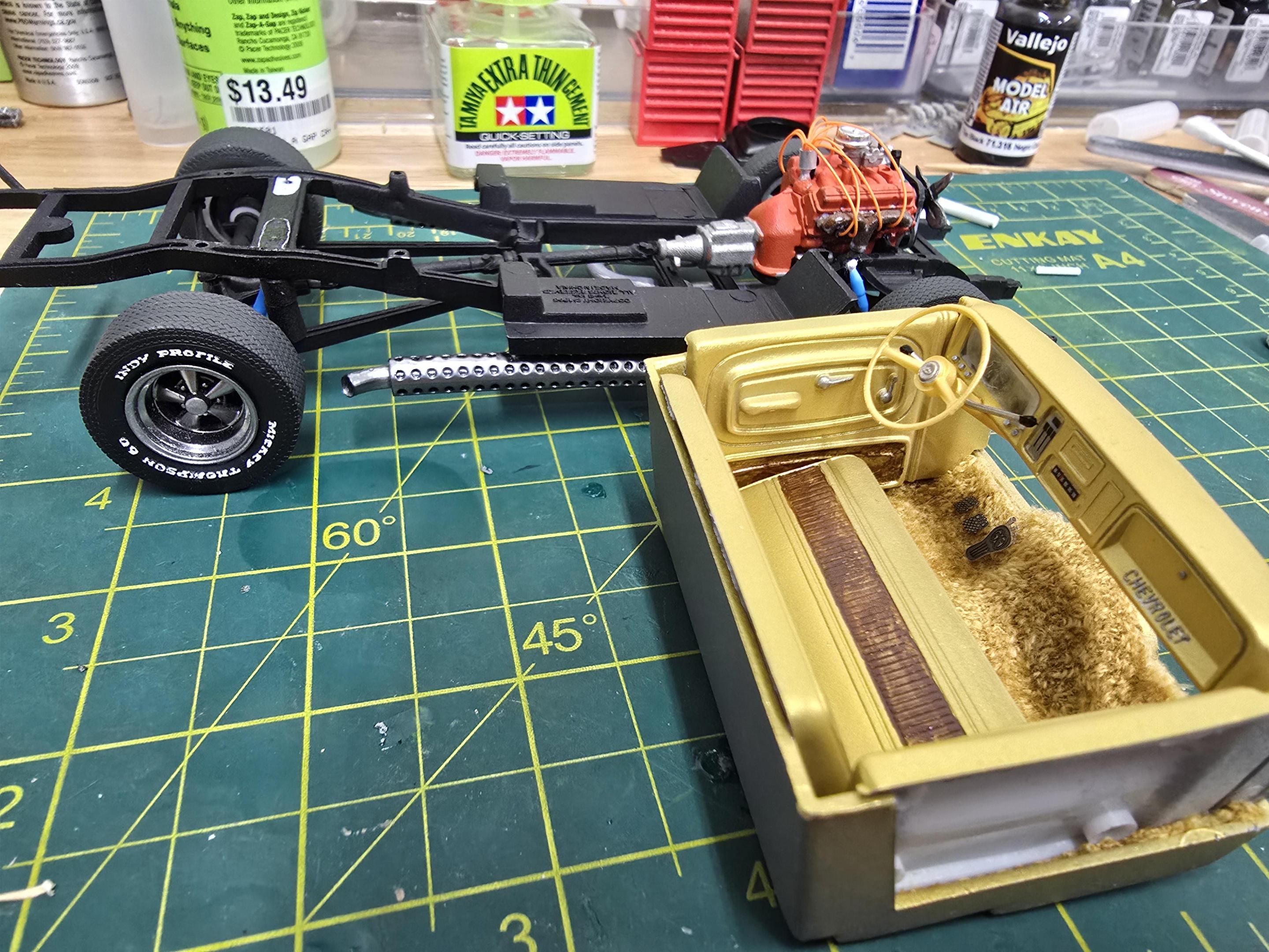 Haven't built a model in several years, life always seems to get in the way, but I'm back into it again. Planning on building an art studio out of a big sun porch at my house, so I will definitely be building a dedicated model building bench before long. I've been struggling with PTSD since my 2005 tour to Iraq, and this seems to be a huge stress relief for me (also finally seeing a counselor over the past year and now have a service dog in training which helps tremendously as well). Anyway, I'm getting ready to paint a 1:1 custom chopper for a friend, so I needed to refamiliarize myself with my paints, paint guns, and airbrushes. So I decided to built this kit I've had sitting on the shelf for a couple years. I'm not spending a lot of time removing mold lines and doing hyper detailing. The kit overall gets a big thumbs down on quality from me, but it has been a fun build regardless. The body is flimsy and warped, lots of details are totally incorrect for a 76 Chevy van (I'm building a 1:1 82 boogie van and have owned several others over the years). With that said, it's been a fun challenge to polish a turd I suppose. I started on Monday Feb 28th by opening up my tackle box full of Testors and Model Master paints that I'd collected over the years, only to realize it got completely ruined in a basement flood at my old house a couple years back. So I'm building back my supplies slowly and trying acrylics where I can. First thing I did was to paint the body. I figured on a color scheme and went to town. I started with Transtar 2in1 primer in aerosol, then Nason gold metallic base sprayed through a $14 Harbor Freight detail gun. Next was some Custom Shop .004x.004 micro gold flake shot through an old Harbor Freight 2.3 nozzle gun mixed in some Axalta clear as a carrier. Then I airbrushed Createx Blood Red and Tequila Yellow fades sprayed with an Iwata HP-CS. Lastly I top coated with Axalta 7776S clear through the $14 HF detail gun. Pretty happy with the outcome of the paint. Still have a couple dirt nibs to sand out, one small chip above the rear doors to touch up. Next I started my usual routine of hopping back and forth painting some parts with rattle can, others with acrylics, brush painting some enamels. A few on the parts trees, some on the alligator clip sticks, and just slowly getting the basics of the engine and chassis together. I started on the interior last night. I wanted to replicate 70s shag carpet, so off to Goodwill for some fabric. I found an old Elmo kids jacket which works perfect. I make tape templates on the body parts I want to cover, then stick the tape template to some really thin cardboard from a cereal box. I glue the fabric to the cardboard template using 3M upholstery adhesive, then glue those panels to the model body. I did shag on the inner sides of the body, floor, and a dash cap. I have to head to the craft store in a little while to see if I can find a few supplies, then I'll get back on this thing tonight and see if I can knock a little more out. Hope you guys enjoy. 76 Chevy Van Model 001.mp4