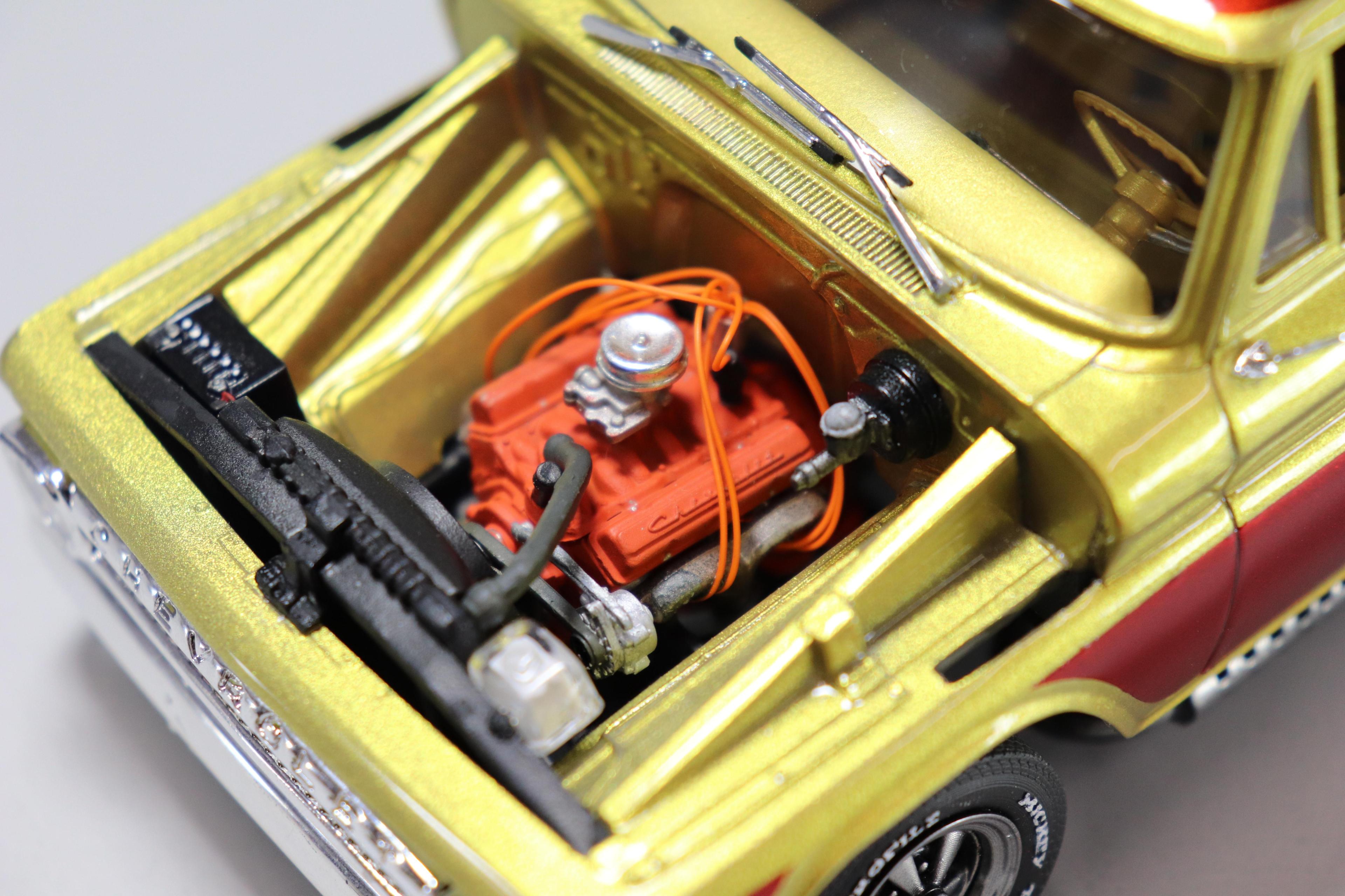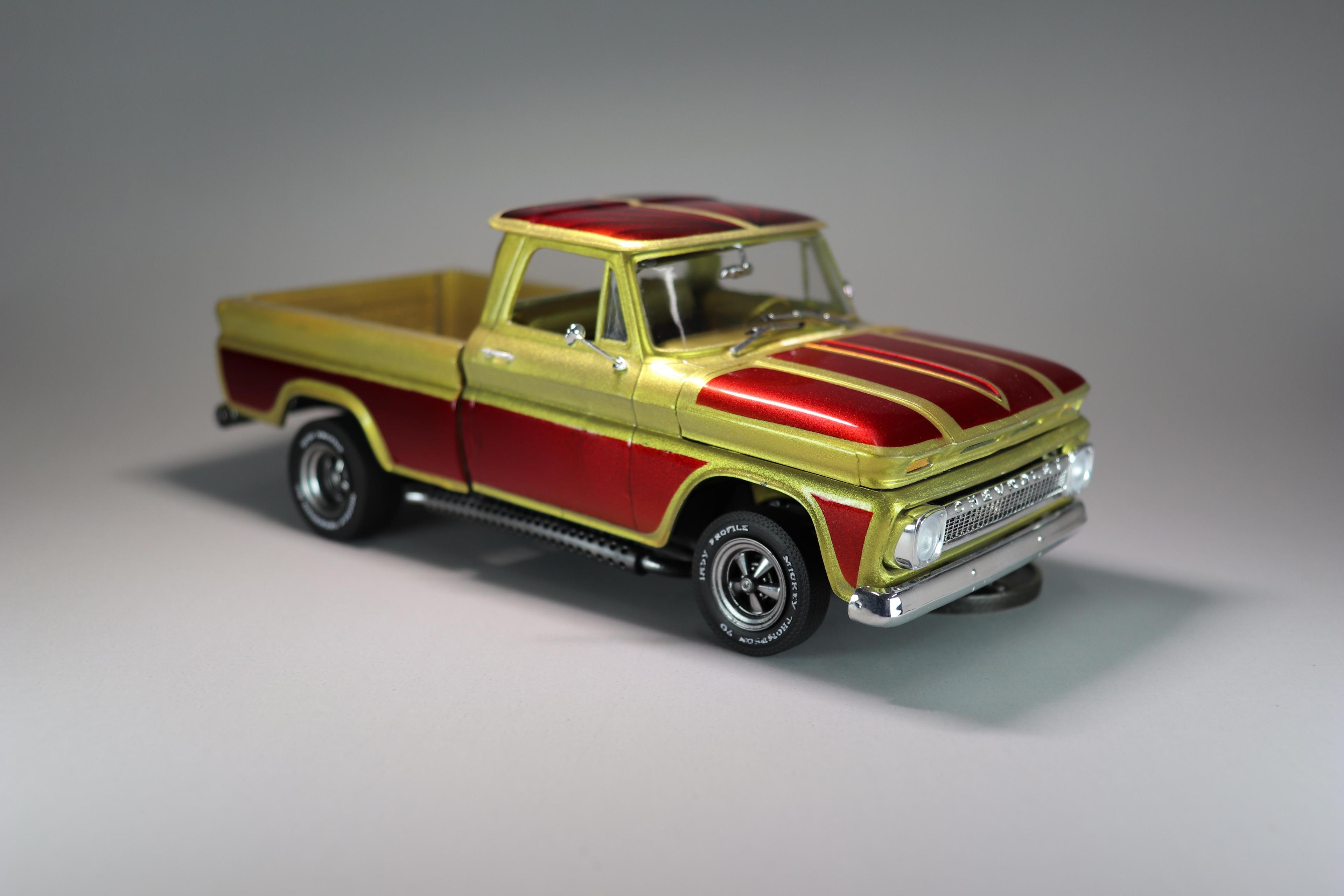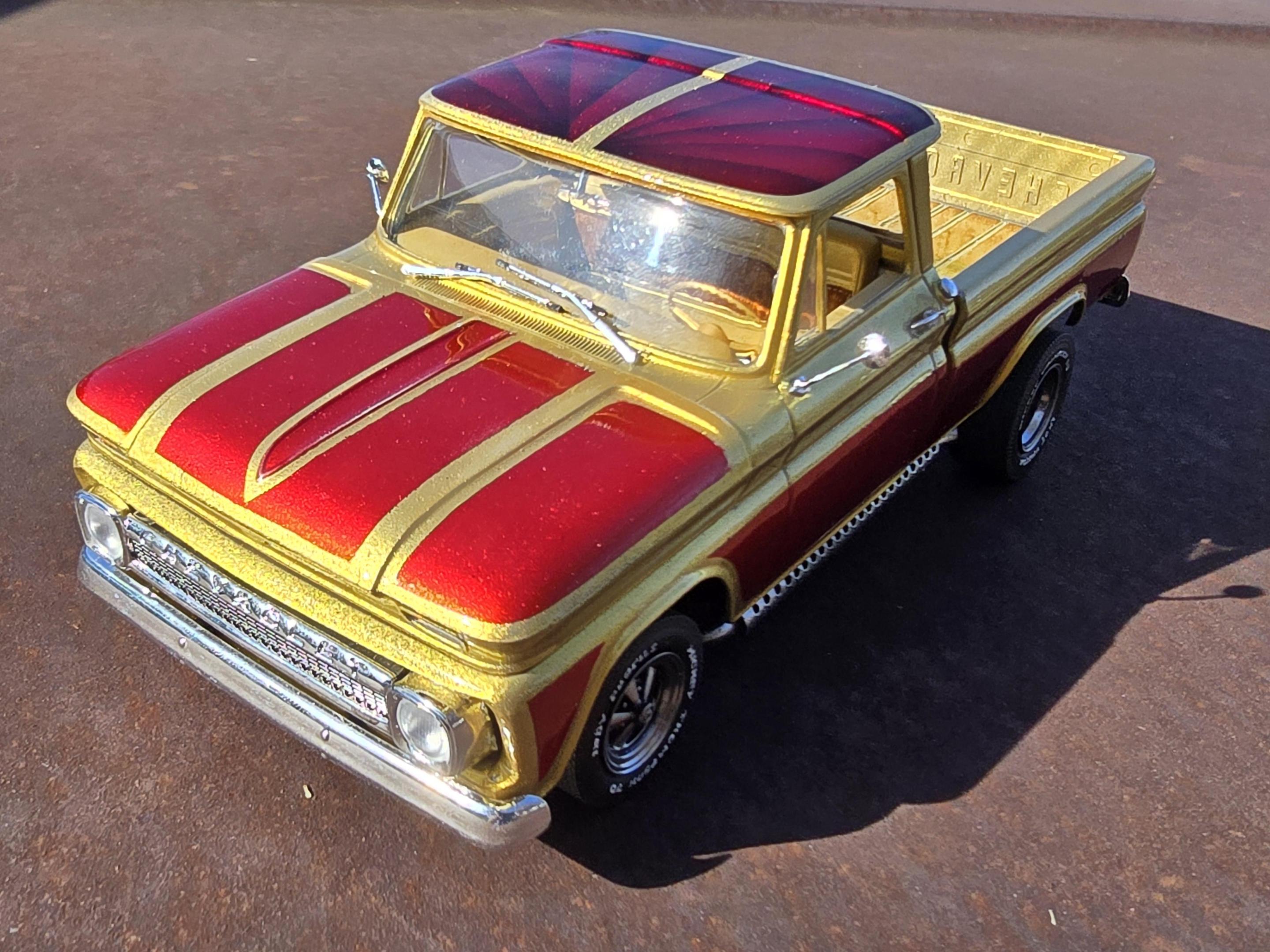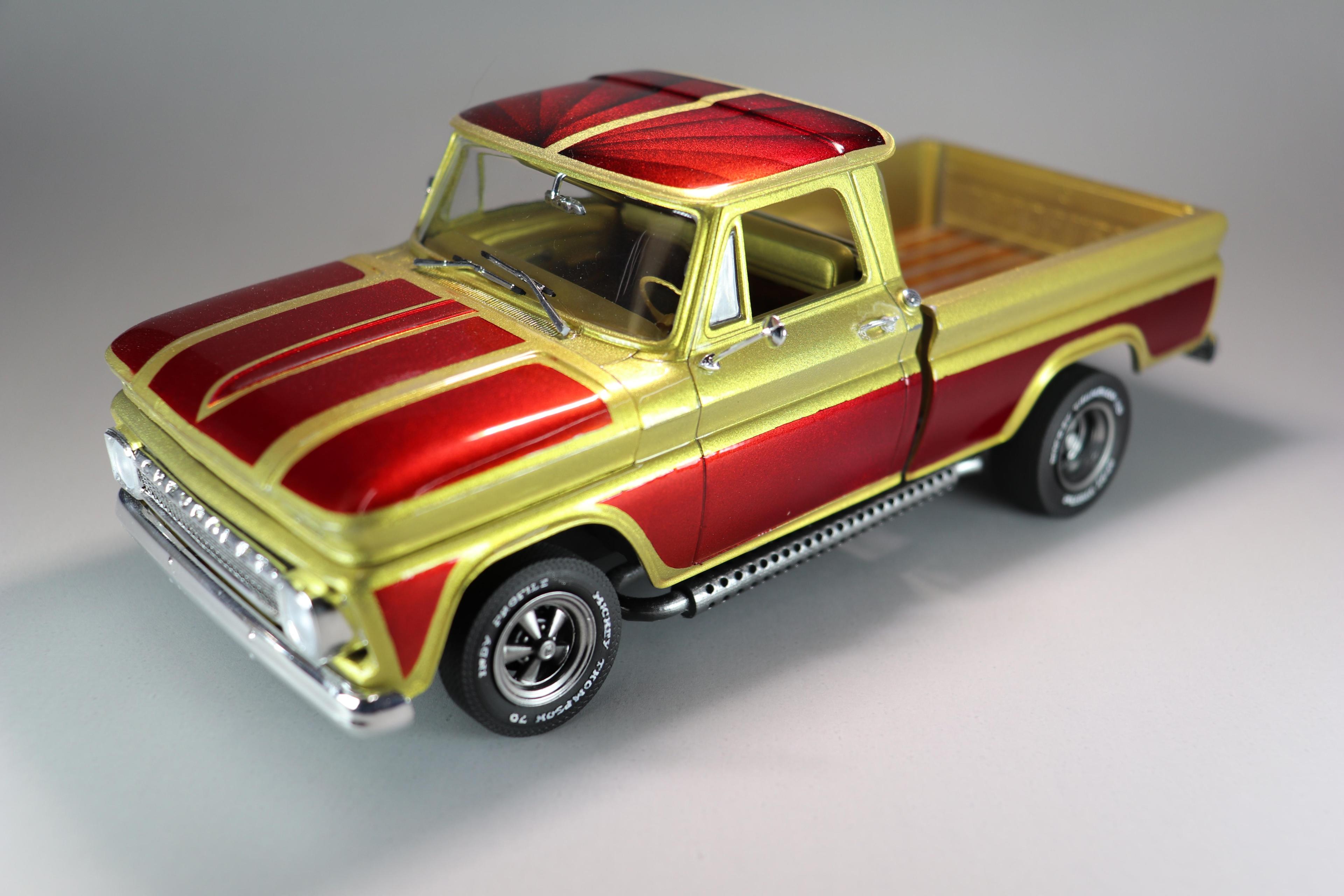 Did this build for the November group build-off in Herk's Modelworks group on Facebook. Pretty happy with how it came out. Flaws and all it was a really therapeutic build in a time I really needed to just escape the world for a while and focus on some personal stuff. I built it somewhat stock with an aftermarket distributor, some 3D printed Cragars and "Sticky Mickeys" boas ply tires. Also added some of my 3D printed side pipes that I designed for the Ford van I built last year. Paint is a Createx gold base. Then faded the graphics in with some Sangria candy (brighter red front), Merlot candy (darker red to the rear), and ended up hazing in a little Violet Candy at the very rear all from Tropical Glitz. Axalta clear coat. Also added a mild lift to the rear leaves to clear the bigger tires in back. Shag carpet is from a fuzzy kids shirt I found at Goodwill and Moon foot pedals were photoetch parts ordered online. Hope you guys dig it.