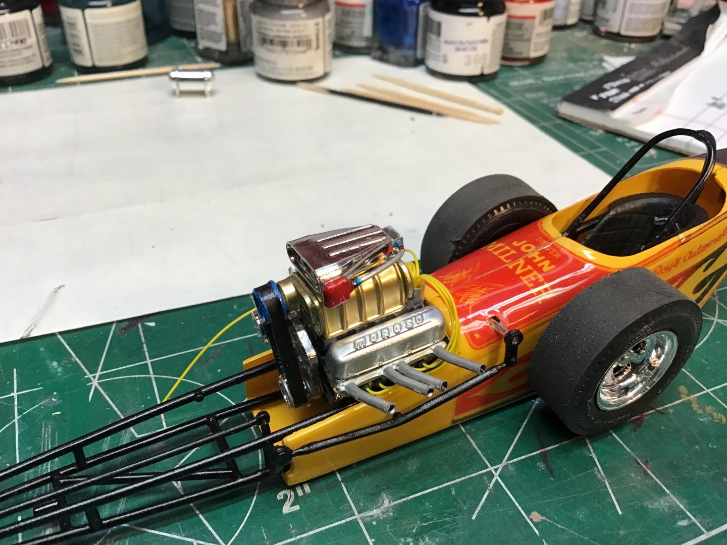 Hi guys, I wanted to post an updated pic of the Milner dragster engine. It’s just about finished. I did some plumbing and its sitting in the chassis now. All in all I think it’ll pass for a decent shelf model. Thanks for looking!