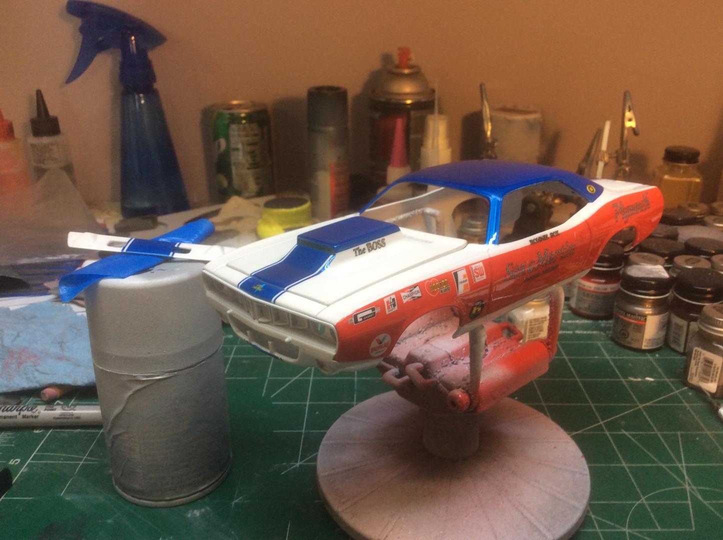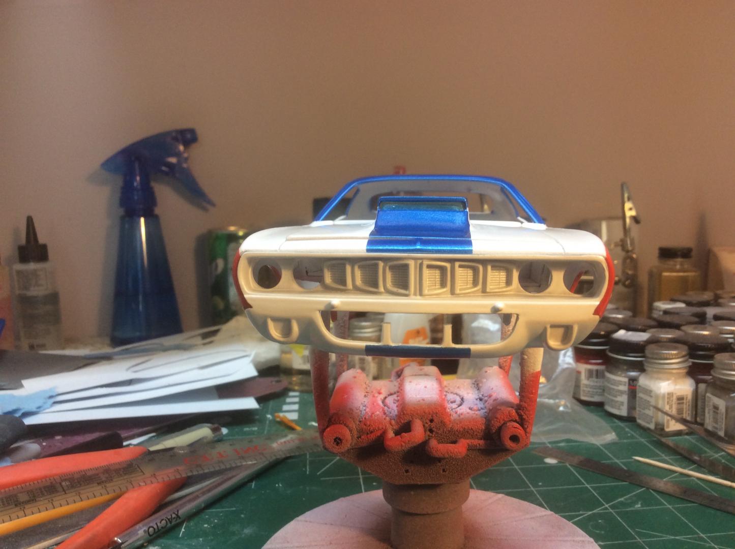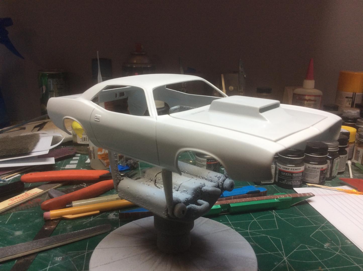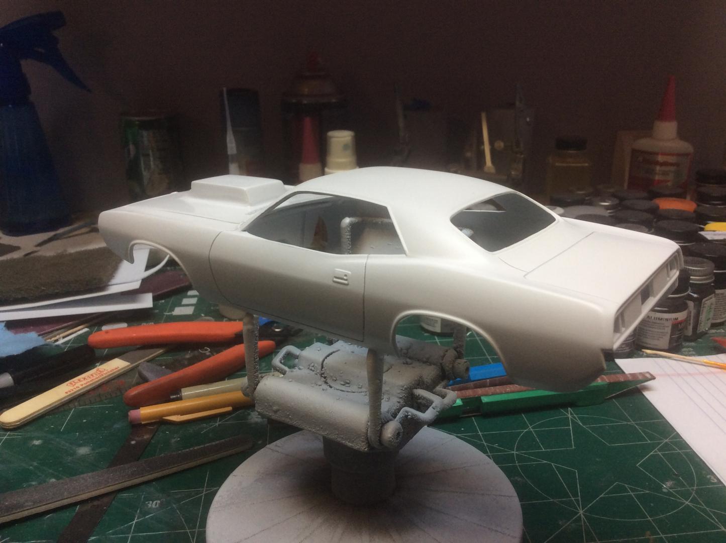 Hey guys, wanted to share an update on the Sox&Martin 1/24 Cuda. Finally got the hood/scoop right and got the first white coats on the body, not without a lot of redoing! I removed the molded in windshield water bottle and battery and filled them in with sheet plastic. I'm going to finish the white, then add the blue, then the red! I also received all my resin carbs and manifold and photo etched hardware.
