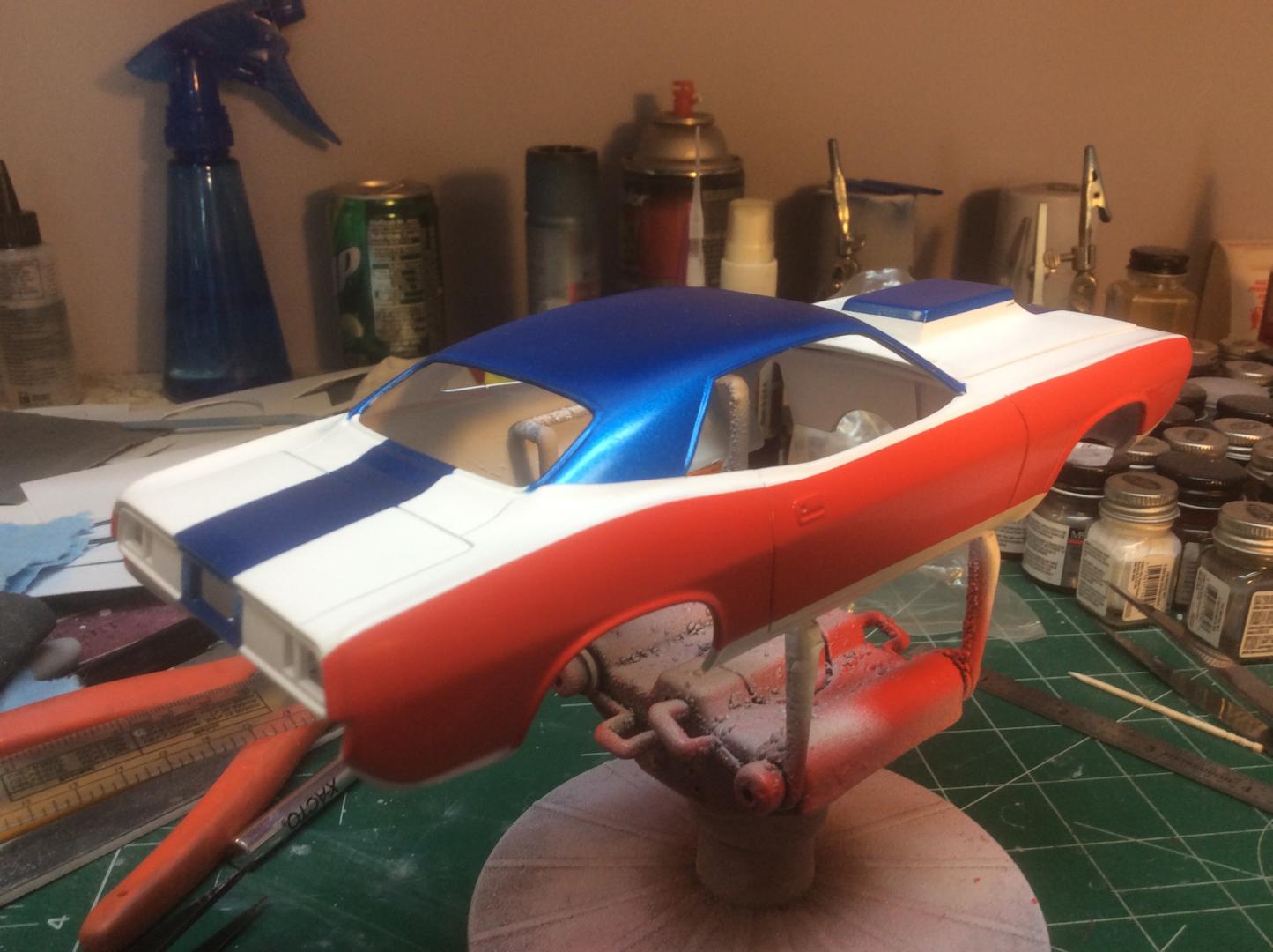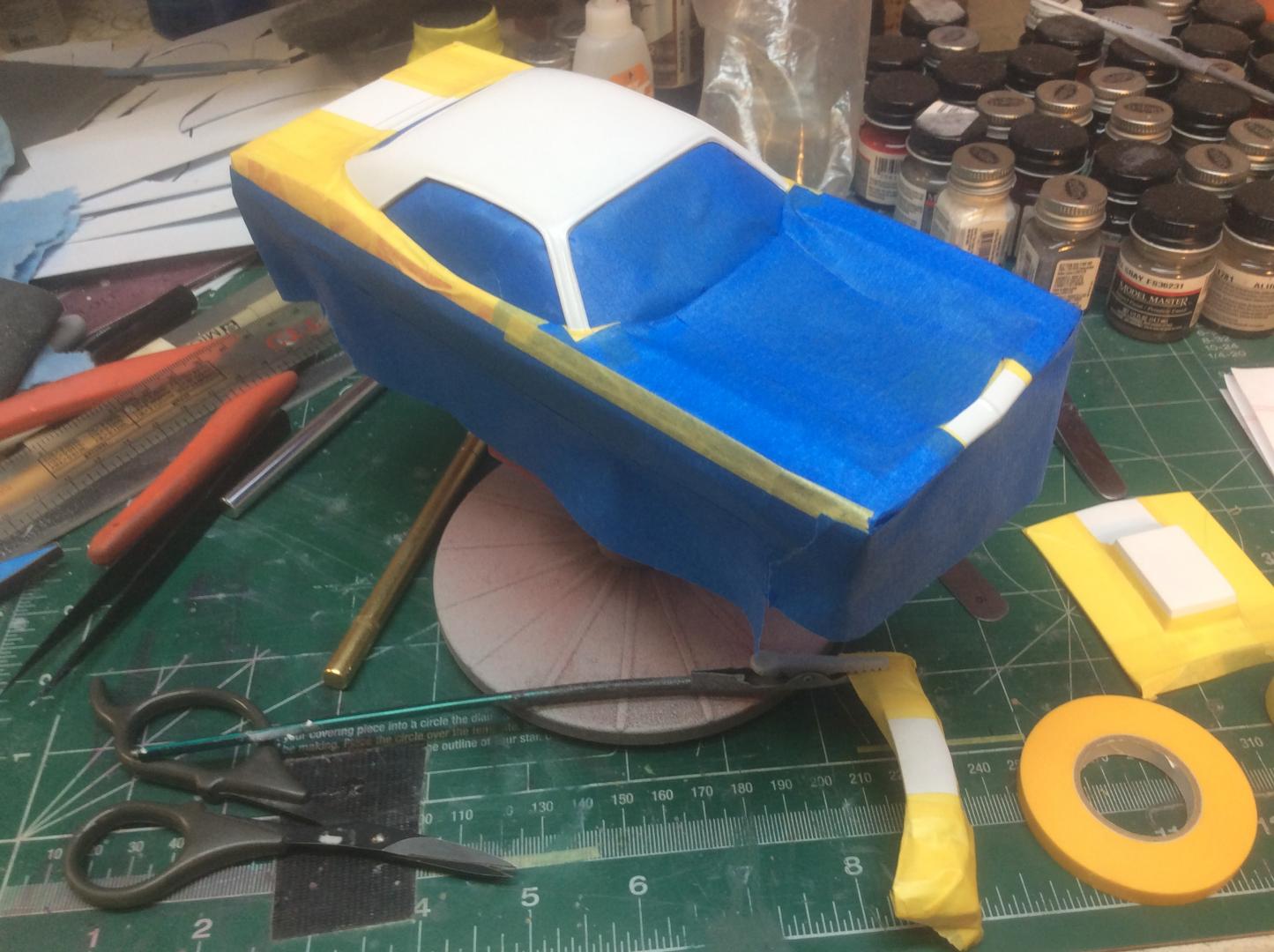 Here's an update, finally got the colors done, not without problems though! I was removing the tape after the blue, and dropped it on the roof, nicking it !!!!!! So... back to the paint booth, but I got it done.