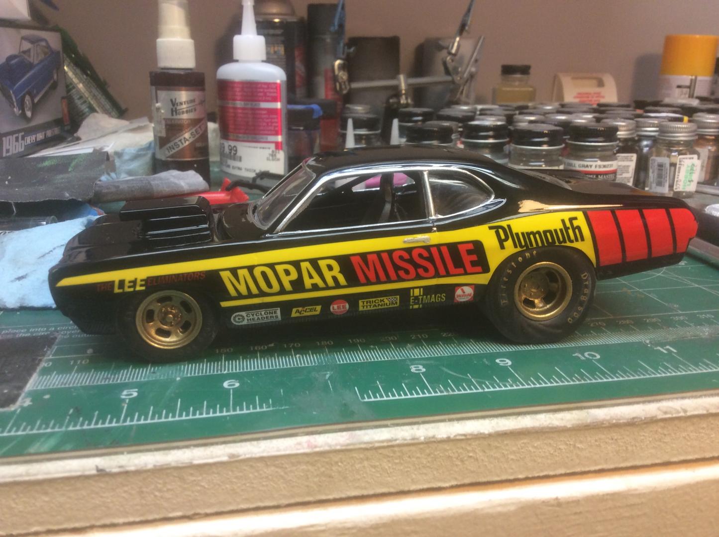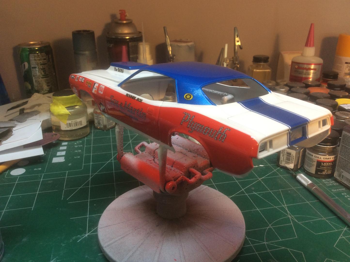 NICE! I saw pics of yours when I was doing my research and I used yours and pics of the real car for decal placement. Your detail is amazing. It started to bubble after the second coat of clear, which means I would have had to stop, sand off all the decals on that side, reorder another set of decals etc etc... i just finished it. Also, I’m sure you noticed I added the cavalcade of stars decal but not the other ones. I just liked it. I’m sure nothing is going to fit right under the body. This is probably going to be a body down only funnycar! Oh well, still a cool car. Thanks! -