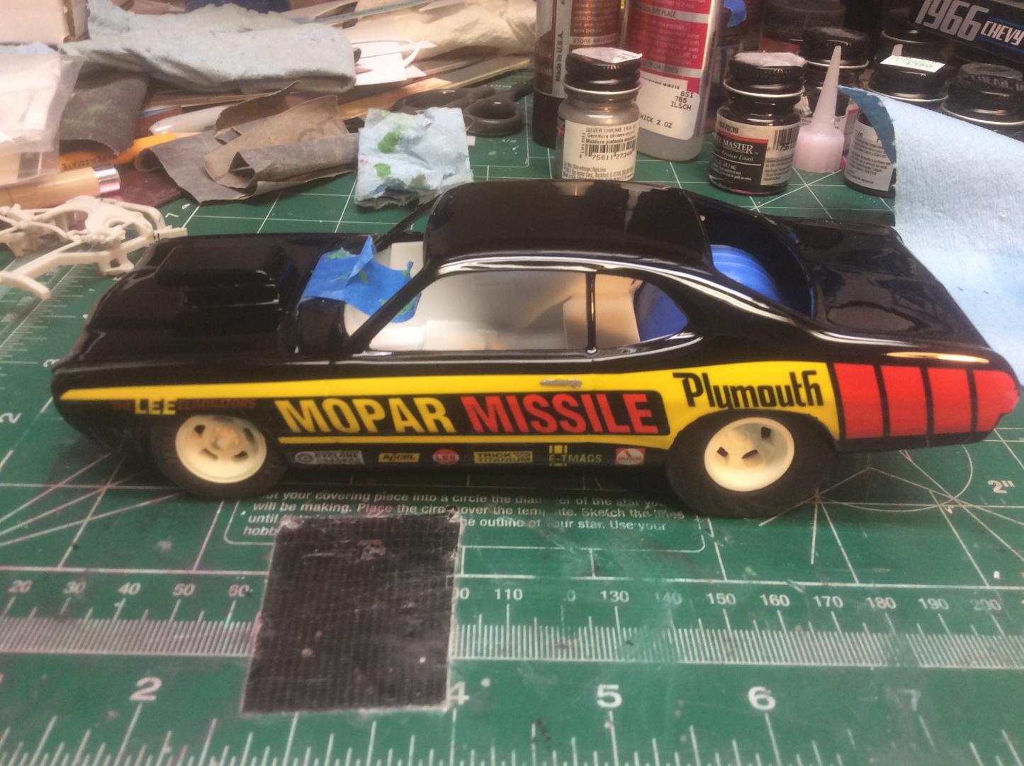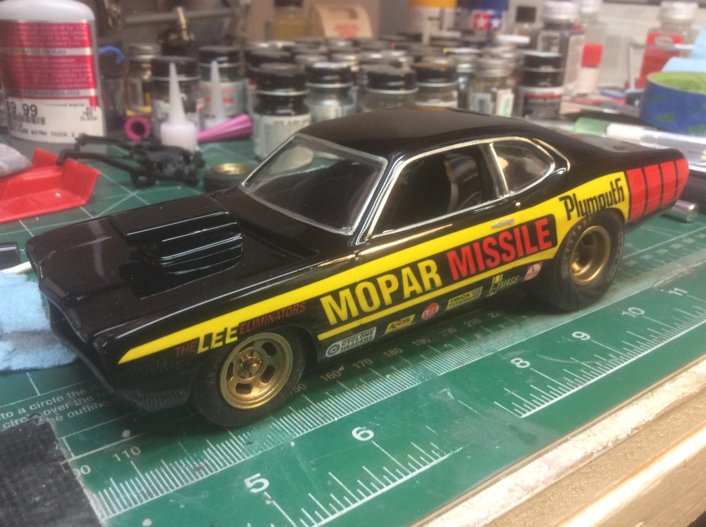 Hey Guys, just wanted to post a few pics from my Mopar Missile Duster. Definitely slow progress and kit bashing all these parts, nothing wants to fit. Finally got most of the interior fit, with a partial roll cage. I used the kit glass from the 71 Duster, but it's so thick. I trimmed it down a little. It's looking ok, But at least I got some progress done.