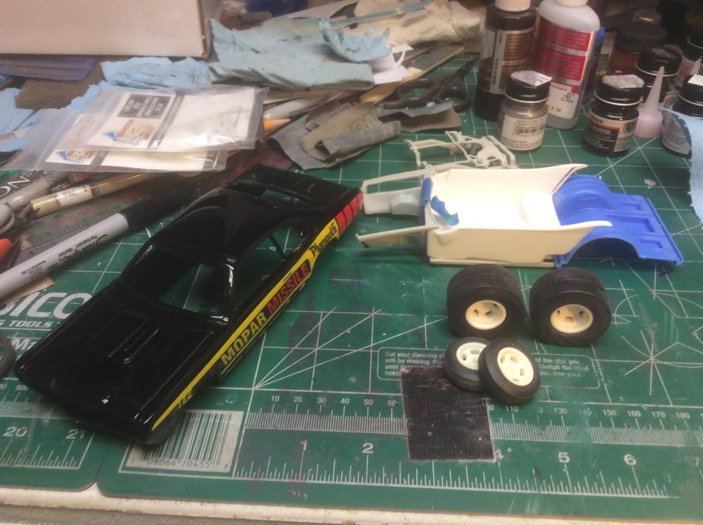 UPDATE ALMOST FINISHED, I mocked it up with both rear wheels, I just can’t decide which one to use. I still need wheel backs, but that’s about the slicks are too wide, but the resin 70s pro stock/super stock are wider!