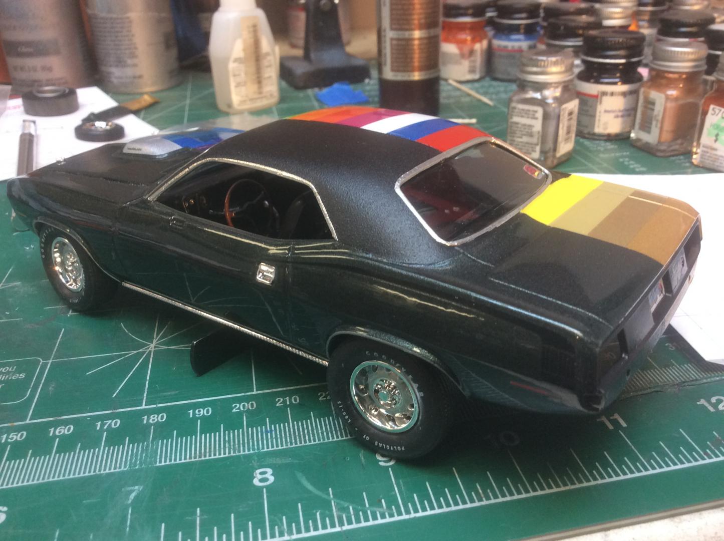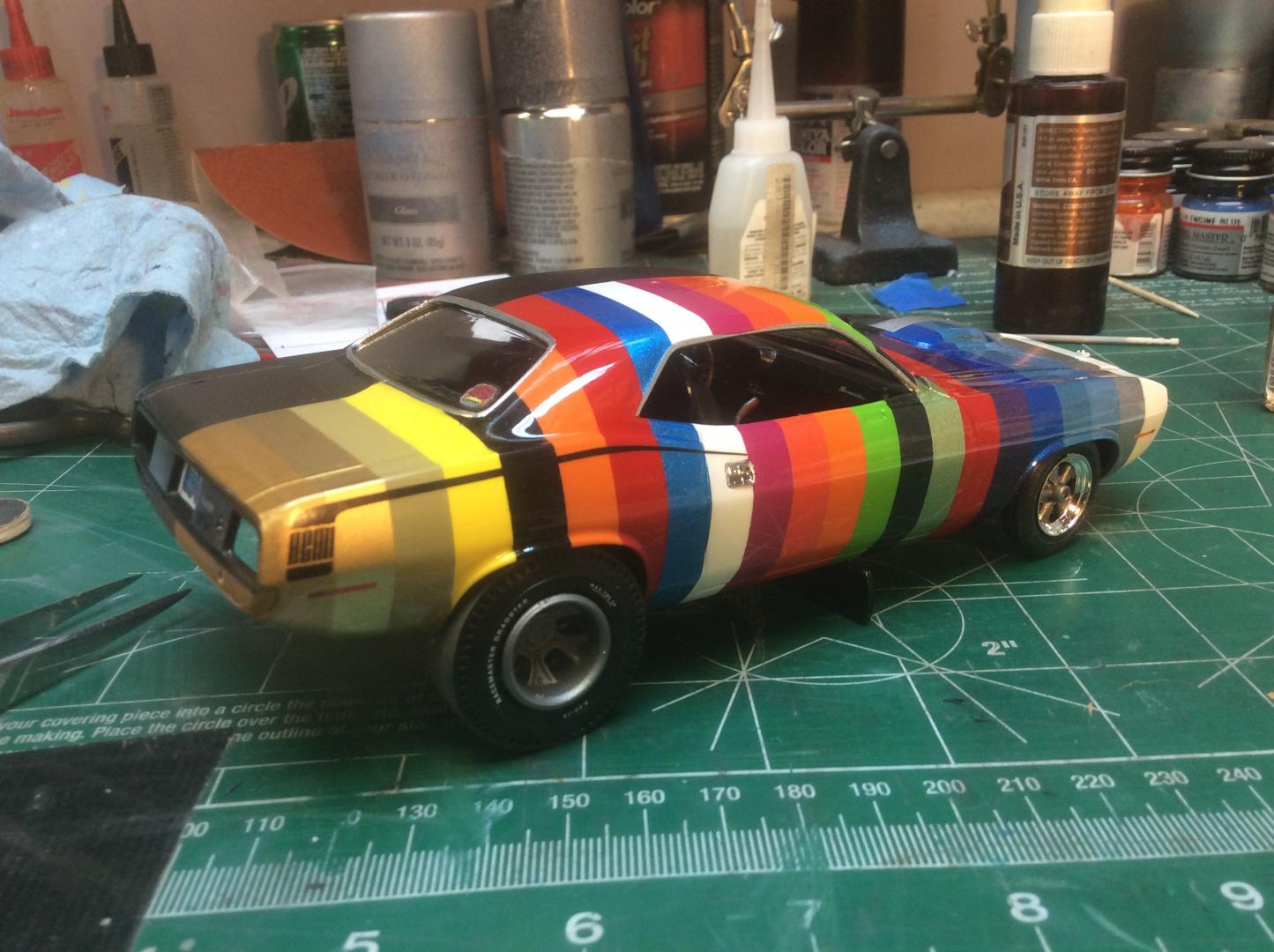 Hey, thanks for all the great feedback! It was fun seeing the colors go on. I think the secret was in the prep work. I misted on each color lightly, then carefully baked each stripe so as to minimize any lifting. And even with all the prep, measuring and planning I still screwed up a few spots. Oh well, all in all it turned out decent. Thanks guys. I'll post the final pics In a few days. Just finished all the other painting of parts.