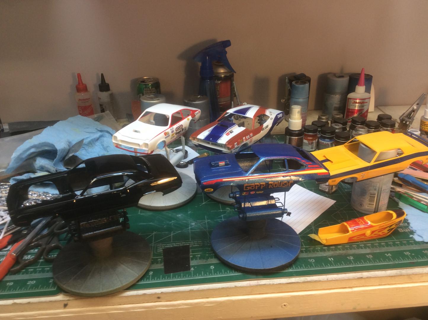 IVE BEEN ON THE 70s pro stock kick. Just wanted to get the bodies done. I figure once the bodies are done I can always go back and finish it anytime. I finally found the AG dragster, unbuilt. Did that one too. The black Cuda will be the Motown missile and the cougar is Fast Eddie Schartmans. Just waiting for the decals.
