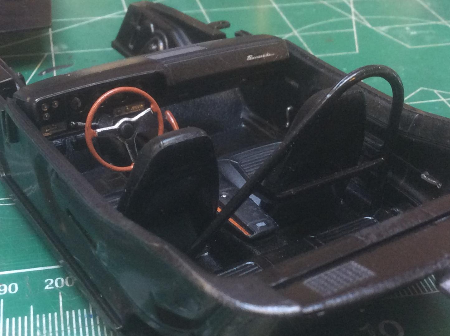 here's a few more. I had to correct a few things on the interior, added the clear lens for the gauges and fixed the shifter. I also forget to blackout the tail panel, which I so ever gingerly corrected. It seems like I'm always doing it the hard way! Gotta slow down a little! But it's coming along nicely. -