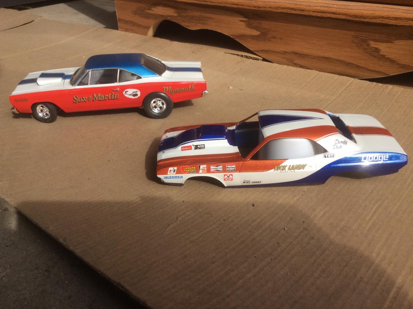 Here's the 69 with the roadrunner in the cloud decal and the other one is a GTX on one side and the RR decal on the other to replicate the Feb 1968 Hot Rod magazine cover