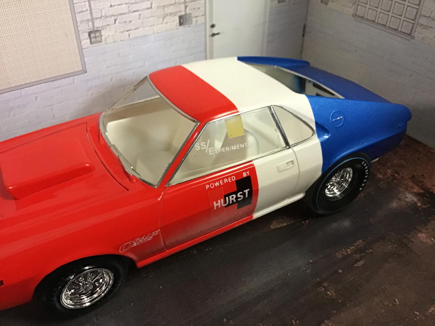 Shirley was the only woman ( at the time ) to win a major drag racing championship, which she then switched to American Motors and drove the Hurst prepped ‘69 AMX that was wrenched by her husband, H L Shahan. The website superstock AMX.com has some great photos and history on the car. The kit scoop is wrong, nothing like the prototype, but I couldn’t find any good photos showing it so I went with the kit scoop. I cant figure out what color the interior is. The pics are B&W, in one of them it almost looks like it could be blue, and I’m guessing the car was white, then they added the red and blue. I did replicate her prototype paint job, which looked like it was a metallic blue, not Big Bad Blue. I just guessed... -