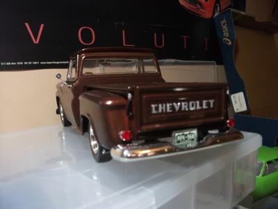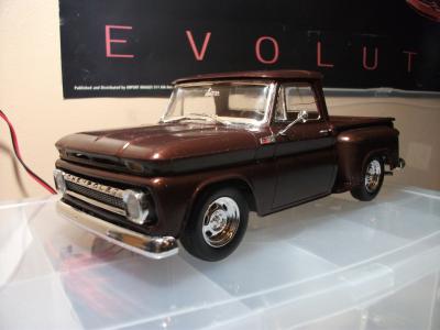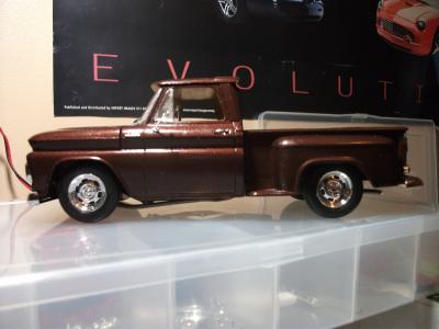 I originally bought this kit to use the torque thrust wheels on a previous 70 Chevelle build and decided to build the truck since I had it. The color that I used is Testors Root Beer Brown and it has Testors Wet Look clear coat over it. The wheels and tires are from a 70 Roadrunner, they look a little big because the Roadrunner is 1/24 and the truck is 1/25. I used wires that I pulled out of an Ethernet cord for the plug wires and the chrome trim is just standard aluminum kitchen foil. I took a break in the middle of the build which resulted in me losing several parts like the gas cap and upper radiator hose. I am not quite sure how the rear window became cracked, but when I pulled it out to continue working, it was. As you can see, there is plenty of room for improvement and I would definitely like to hear your critiques and tips so I can improve. Also, let me know if you have any questions or want pictures of different views. Thanks for looking!