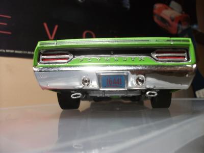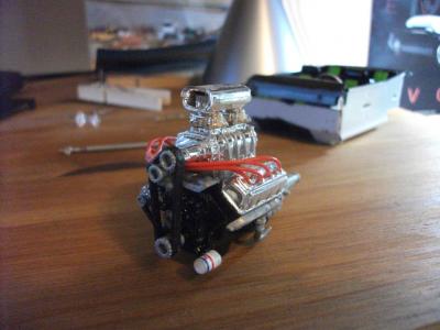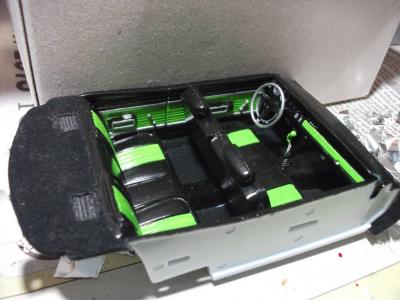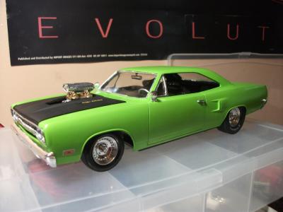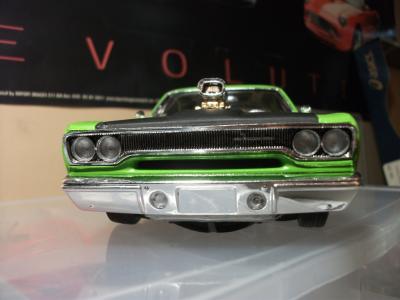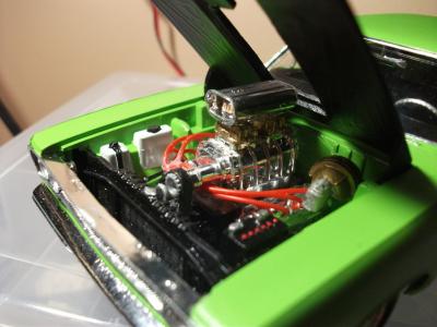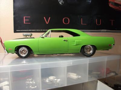 I was working on this model at the same time as my 65 chevy stepside pickup posted in the truck section which was interesting because I have never worked on two models at the same time before, but I liked how efficient the process was. I was able to get a lot more painting and building done at the same time which was nice. Now onto the model, it is a Monogram 1/24 kit with centerline wheels from the heavy chevy chevelle and rear tires from the AMT superwagon. The 426 Hemi came from a 68 charger and the supercharger setup from the same heavy chevy. The paint is Model Masters Sublime Green which I know is a very common/overused color, but I like it. The model did not turn out exactly how I envisioned it, but my skills are just not at the same level as my imagination yet. I originally wanted it a little lower and meaner looking, but I am not unhappy with how it turned out. This was my first time trying embossing powder to emulate carpeting and it went relatively well but I will be better next time. My Reynolds Wrap foil trim skills are improving slowly but surely as are my engine wiring skills. I disliked having the exhaust, rear axle, driveshaft, and suspension as one piece so I cut it all apart for better detailing. I did not notice until I looked at these pictures that I forgot to glue the headers to the exhaust so I will have to fix that soon. As always, thanks for looking and leave any comments or questions about the build.