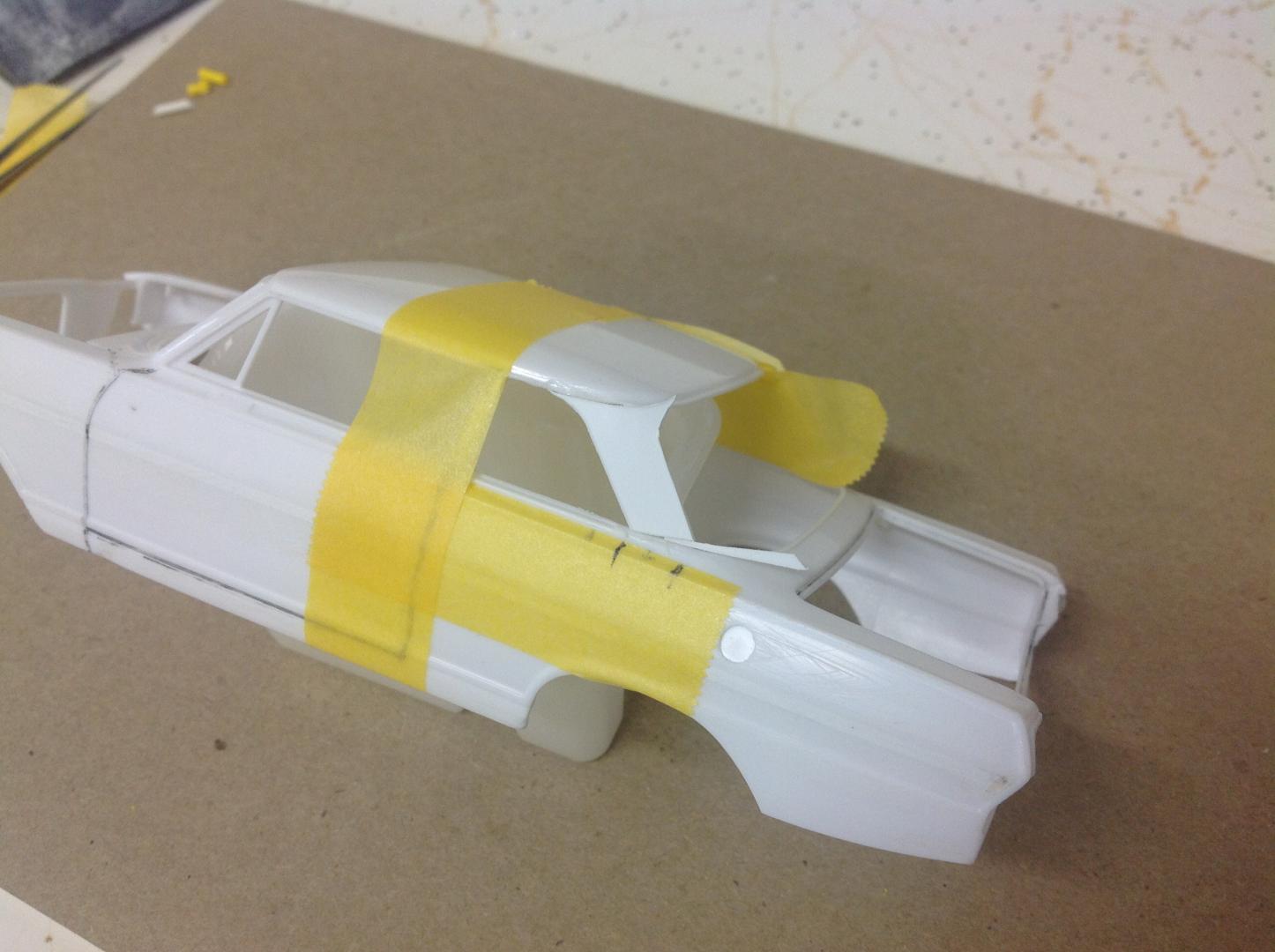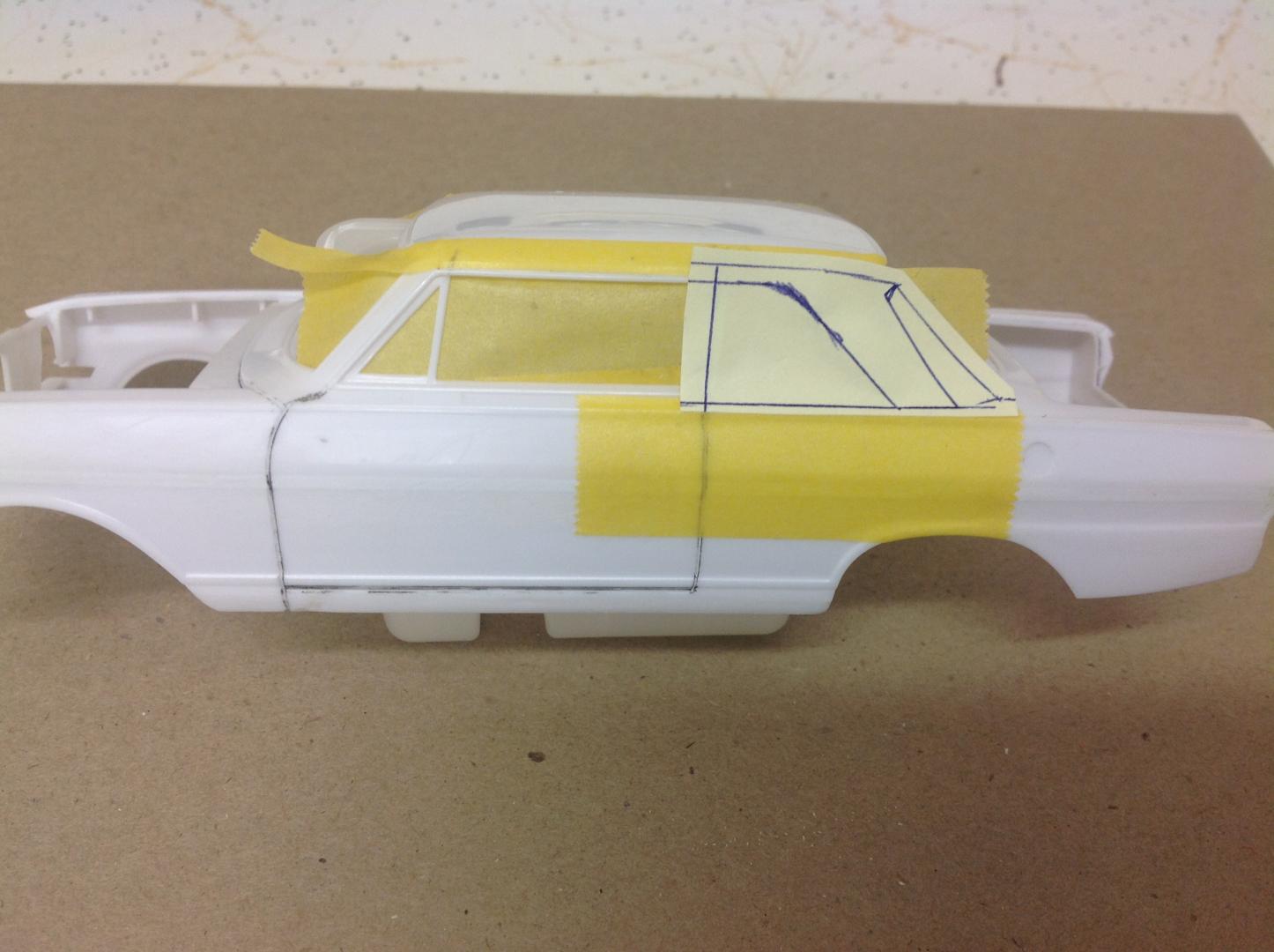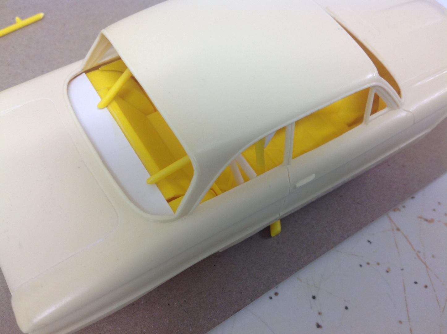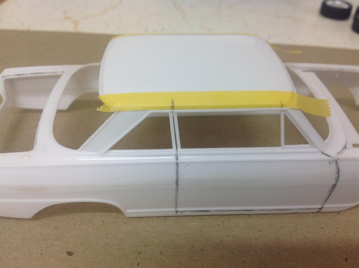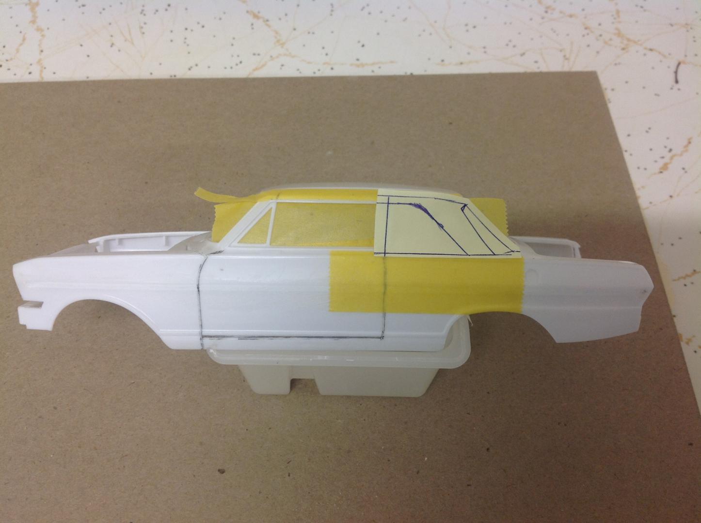 Ok. Spent an hour or so today fixing the door frames and B pillars into place. Then some time on the computer and Mr Google looking at images of the real cars. Traced off a pic to get the angles I needed onto a post it note. Cut it out and taped into place. Time now to sit back and ponder...... "Does it look right?" Cheers......Geoff -