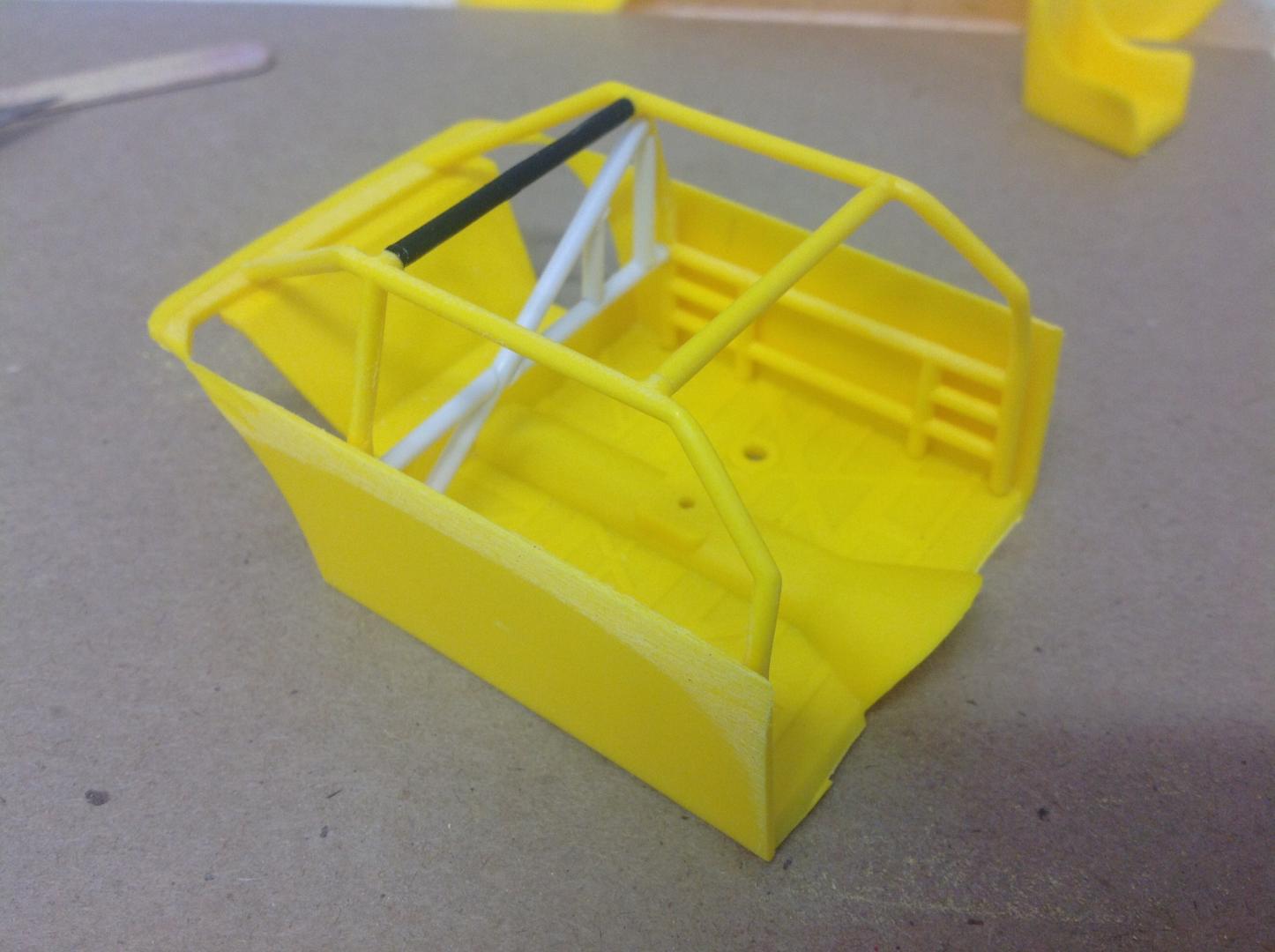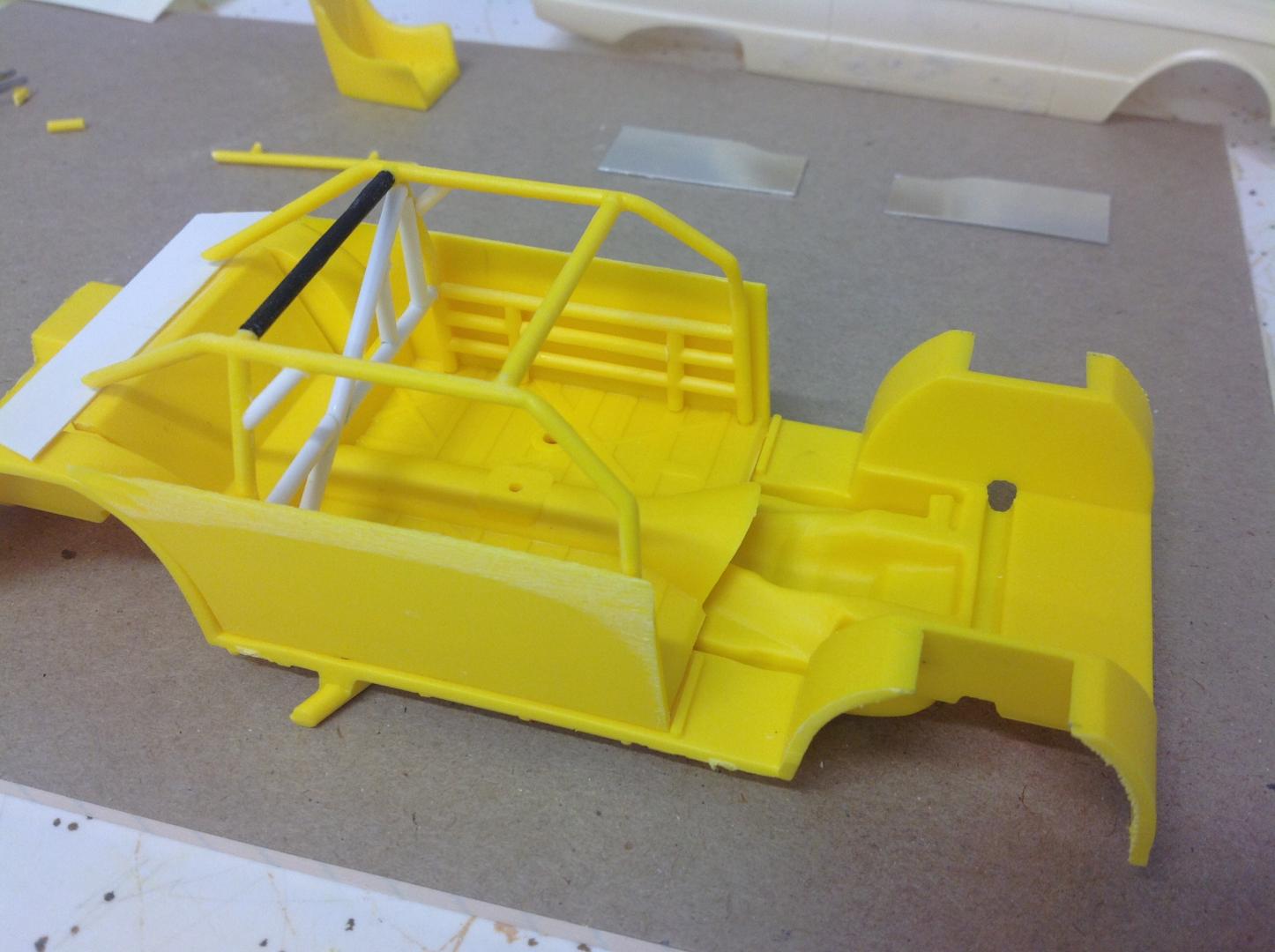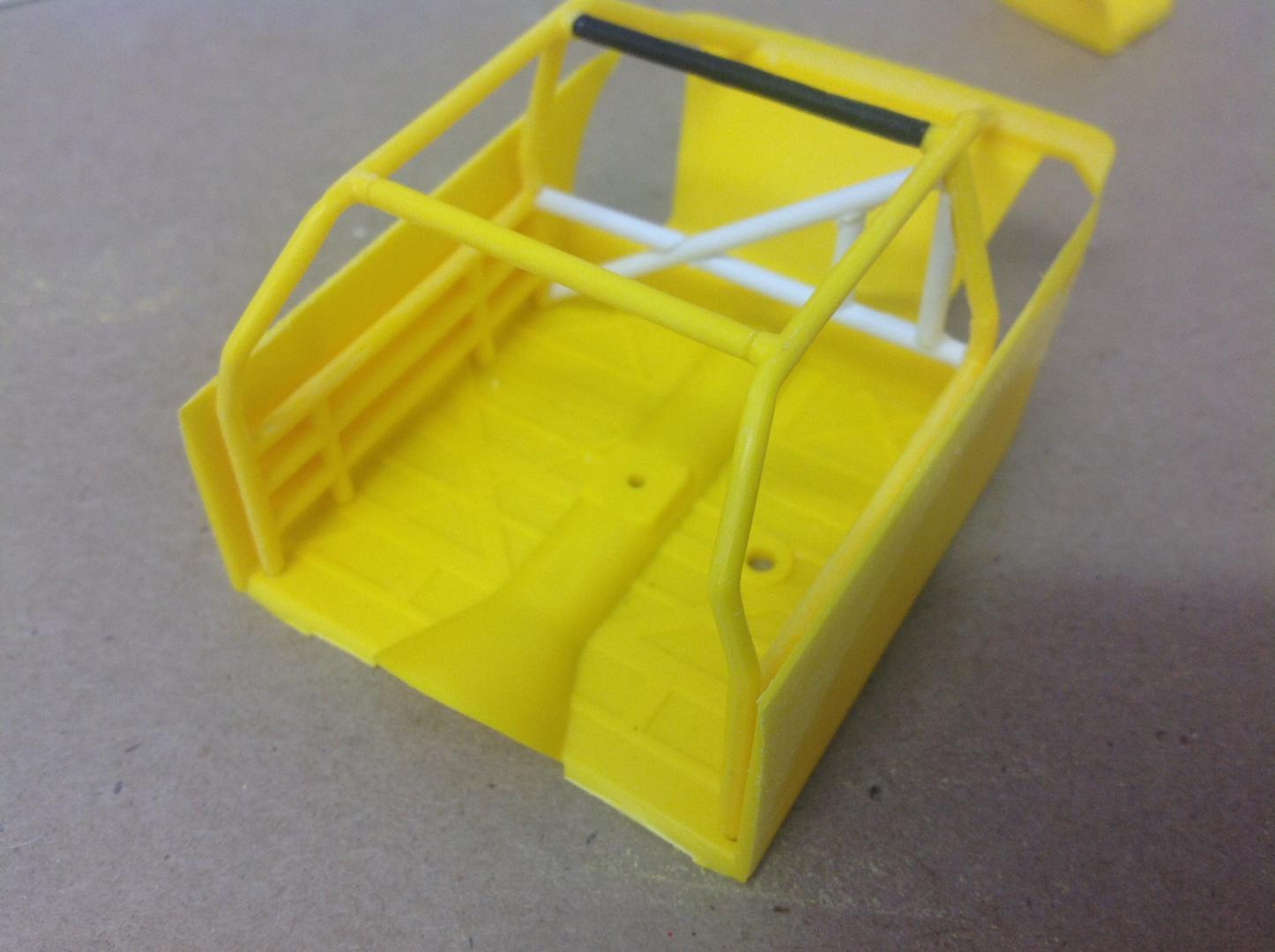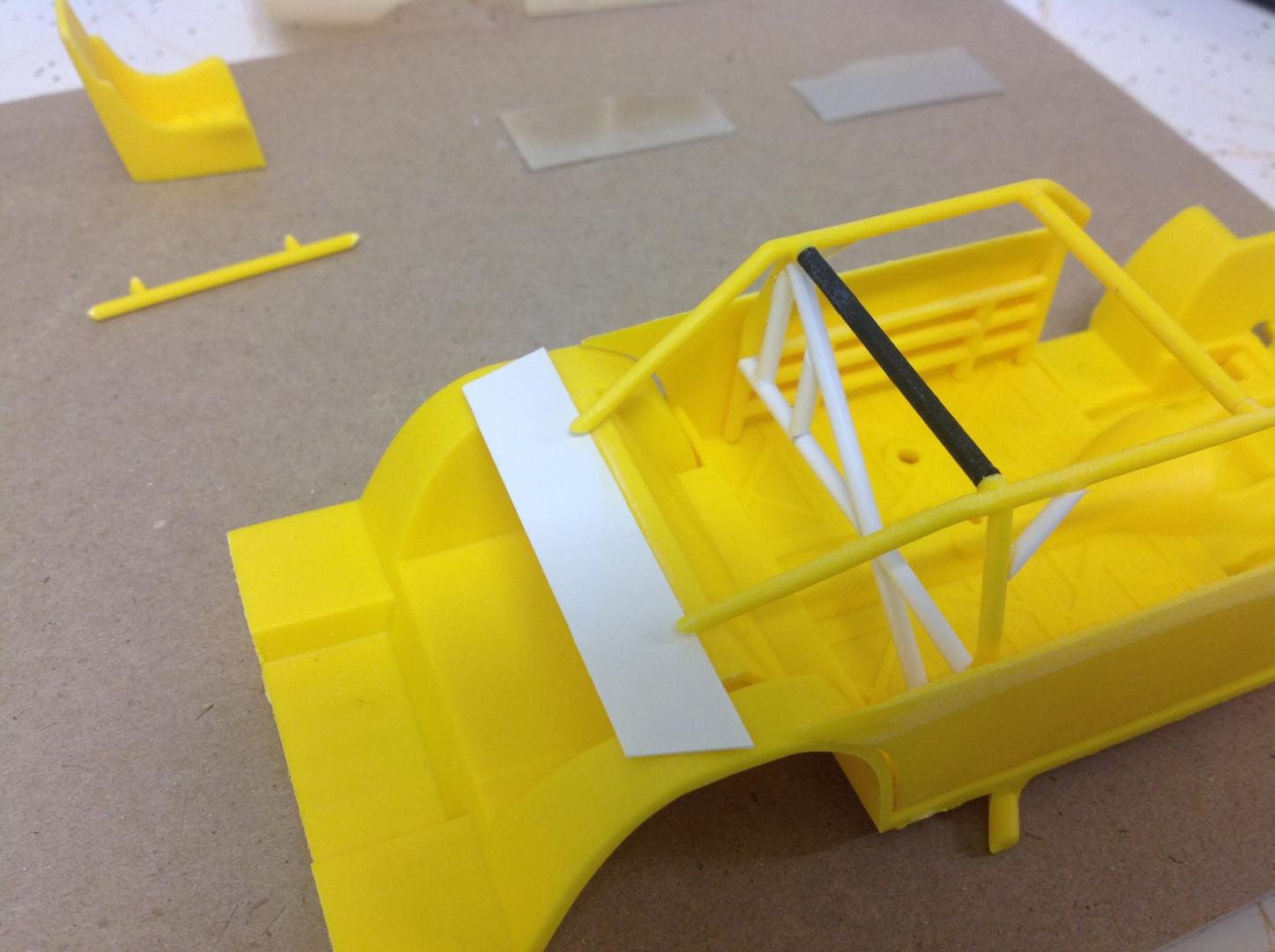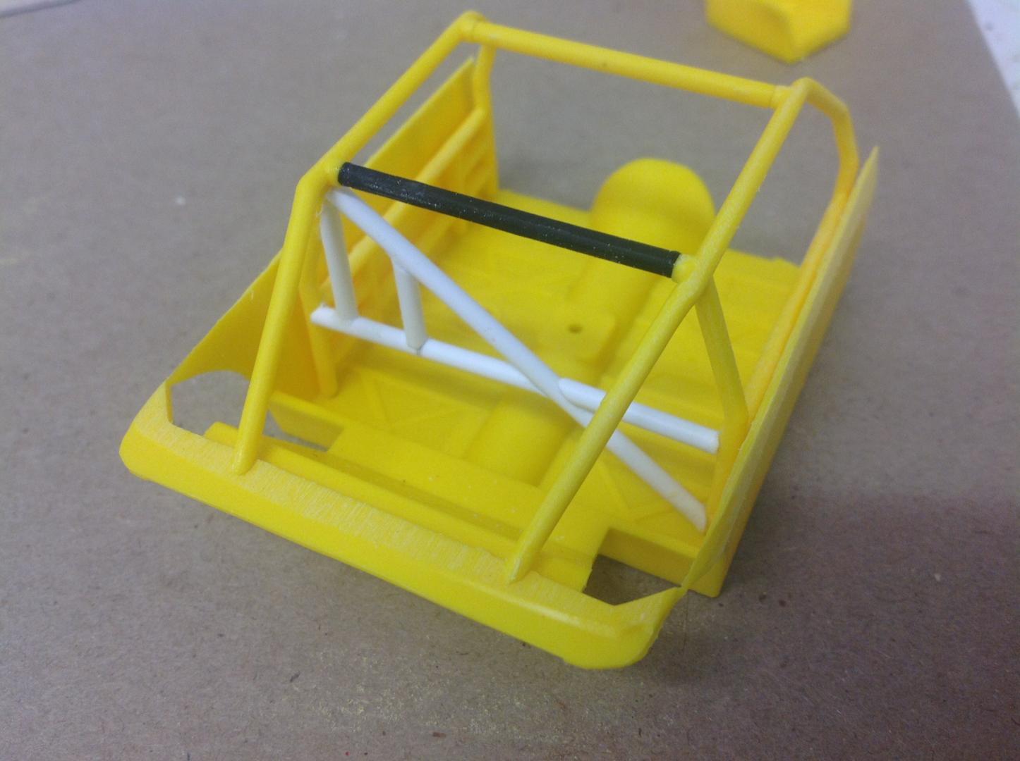 Spent an hour or two today working on the roll cage structure. The kit cage was missing one of the top bars so a piece of black sprue was recruited in to replace it. I then started adding the additional bars that are found in Aaron's car using evergreen tubing. Removed the top bars of the lower cage because the real car pic shows that the first horizontal bar besides the driver / passenger is well below the door window. I still have some small brace bars top, front and rear to add in. Coming along nicely. Cheers...... Geoff