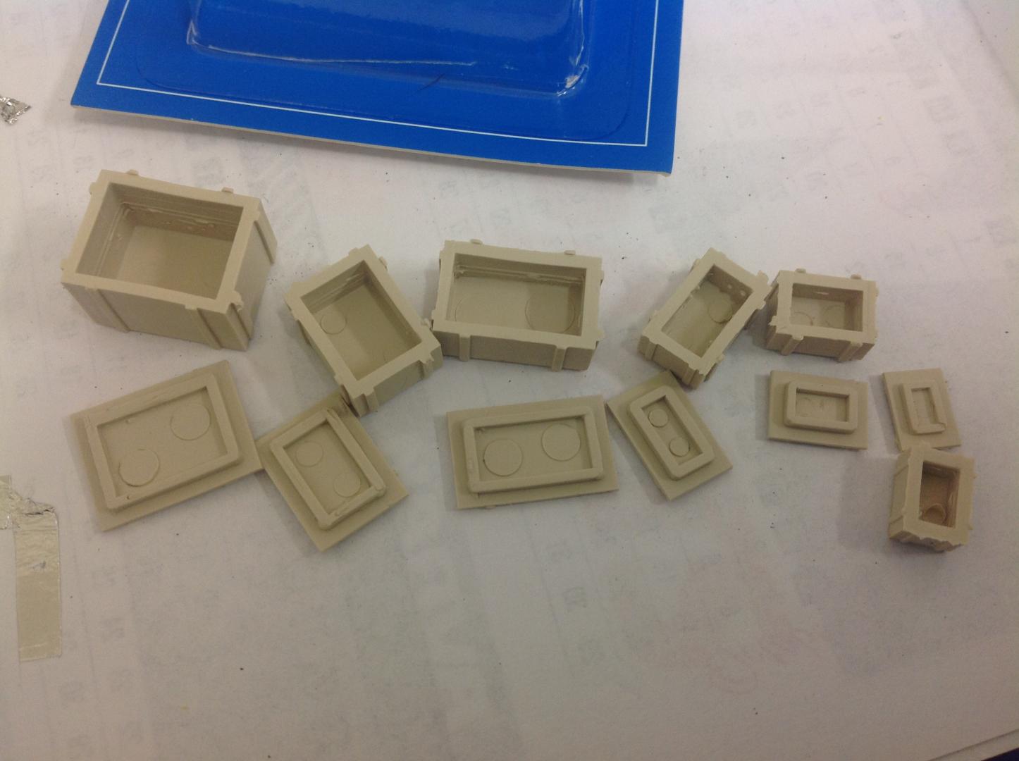 While picking up some weathering supplies from a local train hobby shop, saw these on the rack and thought they could be repurposed as 1/25 scale fuel cells, battery boxes, control boxes etc. They are mildly textured to represent wooden crates but a little judicious sanding and clean up would turn them into smooth-sided steel or aluminium boxes. They are hollow and each has a separate lid. The largest measures 20mm x 15 x 13 and the smallest 10 x7 x 6. Cheers..... Geoff