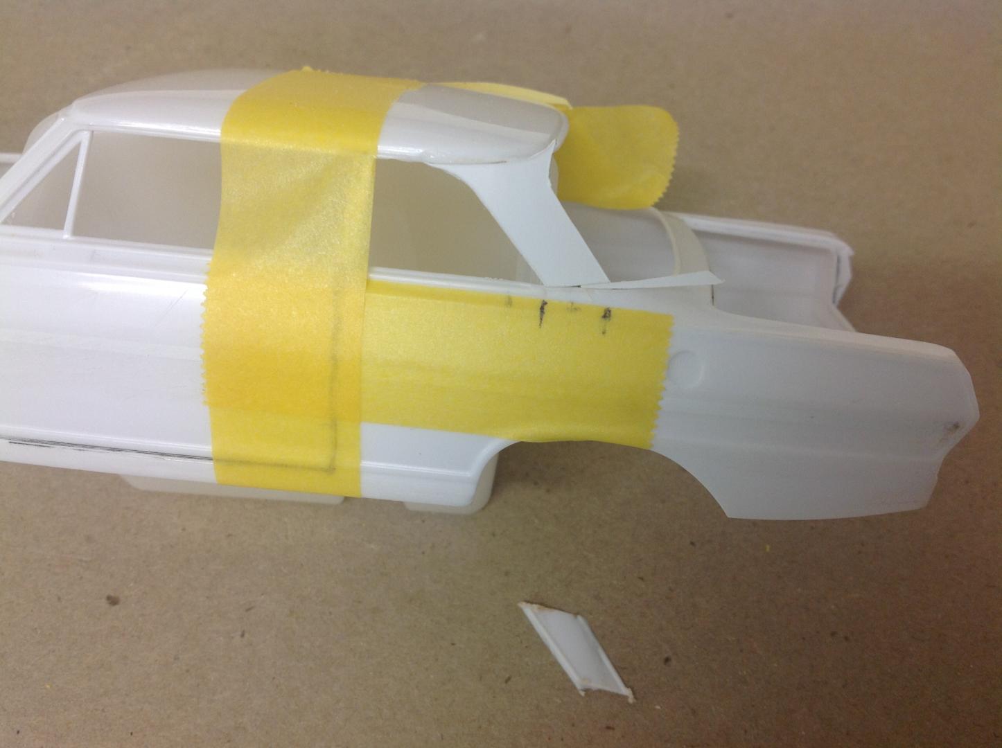 Finally plucked up the courage to pick up the Dremel and cut the C pillar out. Fashioned a new pillar out of 0.5mm evergreen sheet and superglued it into place. Needed a small fillet along the belt line. Once the glue has set up securely, I'll bend the top corner around to meet the rear roofline. Phew!!! Cheers...... Geoff -