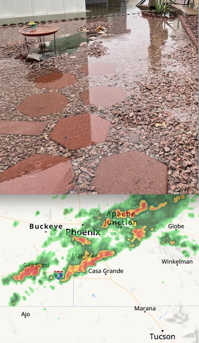 When I moved into this overglorified trailer park, my teensy backyard (those bumpy blocks are my property lines) was just a bunch of flat gravel. My sister suggested adding visual interest to it via some fake turf grass, decorative rocks, stepping stone pavers, a birdbath. This morning, courtesy of the long strip of tropical storm moisture vacuumed out of the Gulf of Baja Califorina, now I have my own .. temporary .. personal little lake. -