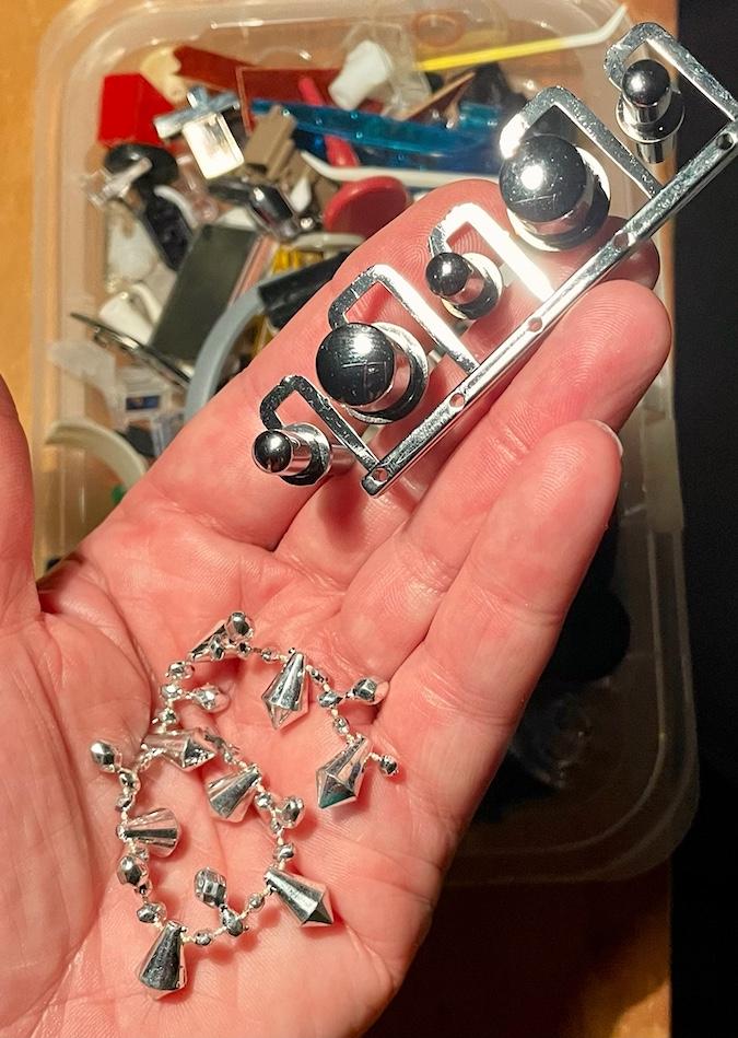 Cone shaped metal studs for leatherwork? https://www.etsy.com/listing/629379849/silver-uk77-cone-studs-bulk-discounts Electronics for dome-shape really durable chrome pieces / sidewalk trash for cone shapes? The shapes on top (from my eclectic non-automotive plastic parts collection) are what the push buttons out of a junk DVD player look like when the machine is disassembled. I found the busted kid's cheap plastic bracelet on a sidewalk somewhere. Looks like the sort of thing a quarter vending machine of little toys and trinkets might stock. -
