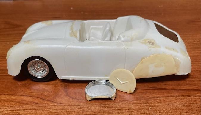 Part of what I thought made this gluebomb "so-terrible-it's-adorable." That, and its tri-carb Ford truck V8. I've scraped off the body decals, but the irony about the perfect circle decal being so far off-center on the spare cover makes me think I should keep it that way and make some kind of extended bumper to hold the spare, using one of the custom bar bumpers out of the old AMT '40 Ford kits. The reverse side of the cover has a V raised emblem and it seems small in diameter, perhaps the size of the old AMT Ford Falcon or Corvair wheels. Meanwhile, I also had a pair of Fujimi 24th scale Porsche 911 headlight buckets in my parts pile since forever. At first I thought they were too small to correct the Palmer walleyed housefly oversized headlights problem, but what I have may not actually too unusable small (ignore the blue masking tape stickies behind 'em). Not going for sheer scale perfection in this simple project, just some kind of nice improvements while keeping the two main elements that the original kid builder wanted.