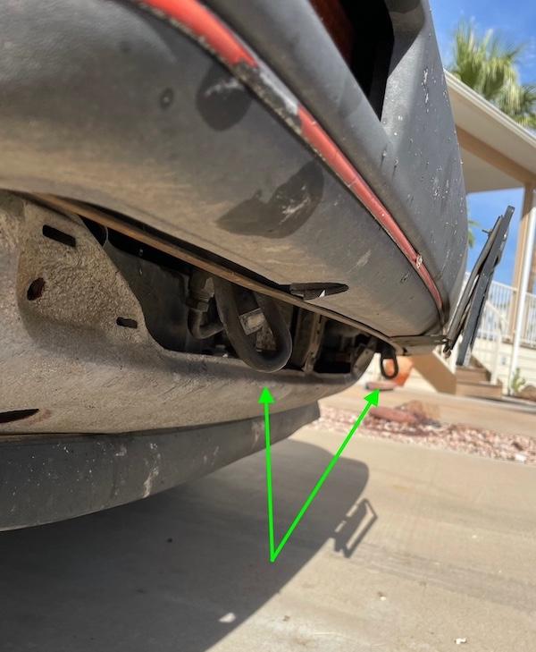 A positive development today resulting from my Oct 28th irk where the county emissions tester had (inadvertently) trirf to let my car run away off the dynanometer rollers — I definitely have the attention of the subcontractor administrator running the facility for the county today. I politely worded a letter to the country supervisor a few days ago to only ask if the guy testing my car was qualified to drive a stick shift .... and if the cable restraints were hooked onto the front of my GTI to prevent excessive side-to-side drift on the rollers. The subcontractor administrator replied this morning to say the tester guy was qualified, and that in some cases, cars that don't have front tow hooks or other means of putting on the cable restraints don't get the cable restraints. His mistake was to say if mine only came with one in the spare tire tool kit, a single hook can't be used with one front cable restraint. I replied right away with the photo below to say mine most certainly has two hooks welded to the frame, they are quite obvious to see when anyone bends down to look for them, and that the reason why I really don't remember roller drift happening with my car is that diagonal cable restraints were put on those two hooks in so much of a regular routine way over the last 20 years that I never gave much thought to it. In the subcontractor administrator's reply after lunch, he basically all but admitted outright that the first tester guy never bothered to look for the hooks, and the station manager who had to take over for him didn't either. I gather that the subcontractor administrator reminded the work staff - there's a more obscene way to describe such a scolding - that cable restraints are absolutely to be used on front-wheel drive manual shift cars when there are tow hooks / tow holes available. And if testers don't undertake that safety effort, they're in a wee spot of trouble.
