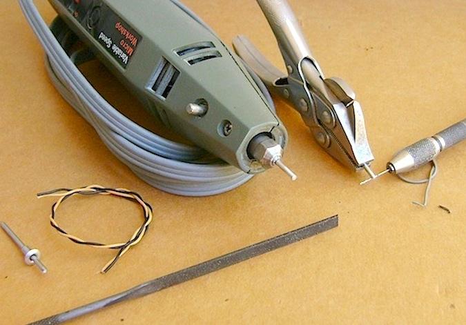 If you are poor but have the requisite tools and scrap material, you can make 1/25th scale '70s-era General Motors window cranks with this method. Or at least something which looks somewhat similar to those, anyway. The ingredients in the photo below are, left to right: 1) spent (or unused) aluminum rivet rods that are a bit over a 16th of an inch in diameter - I simply eyeball these things with no particular precision for dimensions 2) scrap insulated wire, preferably a light gray which has aluminum spiral-wound wire within it, where the insulation looks like it would be the same diameter as a window crank knob 3) a motor tool 4) a file 5) pliers with parallel-closing jaws 6) a #70 drill bit 7) a pin vice 8 & 9) not shown - an X-Acto blade or razor blade, and a hard smooth surface The procedure: Chuck the rivet rod into the motor tool, and file the end into a slight dome shape. Then use the pin vice to drill a starter hole into the side of the rod as close to the end as you can get it. The rod is soft enough that this is easier than it sounds. After that, use the motor tool to drill the rest of the way through the rod. You'll need a pliers like the one shown since the small bit of rod will heat up enough that you can feel it if you only hold it in your fingers. At this point, I used a sharp pair of wire cutters to cut off the rivet rod to about 3/16" in length. Don't lose it in the carpet. For the crank end, use a razor blade/X-acto blade to score the insulation, and strip a quarter inch or more of it off the wire. Then dip the exposed wire into some diluted Elmer's glue or touch a small drop of super glue to the exposed wire to keep the individual strands from unraveling. When that's dry, bend the still-insulated part of the wire at the point where you stripped it to a 90 degree angle. Now use the blade against a flat surface to cut off the rest of the wire - that will leave you the smallest amount of insulation on the wire, at a right angle to the bare wire, which is the rotating knob at the end of the crank. At the far right of the photo below, that's the itty-bitty result. Put a drop of glue at the center of the knob's surface to prevent it from popping off the exposed wire. Now thread this into the rivet rod piece, to a length that looks appropriate for how long the crank end should be, and touch a bit of super glue into where the wire goes through the rod. Use your wire cutters - mine are the really small fine type for jewelry work or small electronics - and snip off the excess wire. Drill holes in your interior panels the same diameter as the rivet rod and install. The finishing touch is a drop of silver paint (or other appropriate color as needed) into the center face of the knob. If all has gone well, you will end up with a window crank that looks like this: Not super perfect, but for my use in an upcoming muscle car WIP thread, it'll do, since the kit had zero window crank detail in the interior tub. An alternative way of making the crank end would be to use fine aluminum or silver colored wire which you could stuff the stripped insulation material onto to create the knob, and then crimp flatter with a small needle-nose pliers. There may be photo-etched cranks out there, but no offense to the sellers, they still look like flat layers of metal glued together.