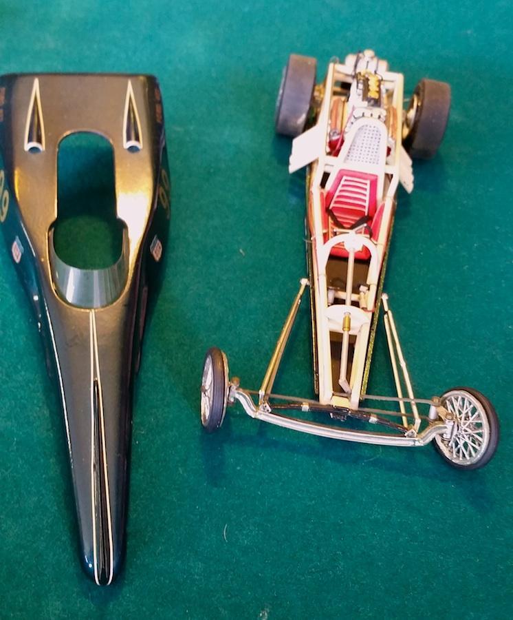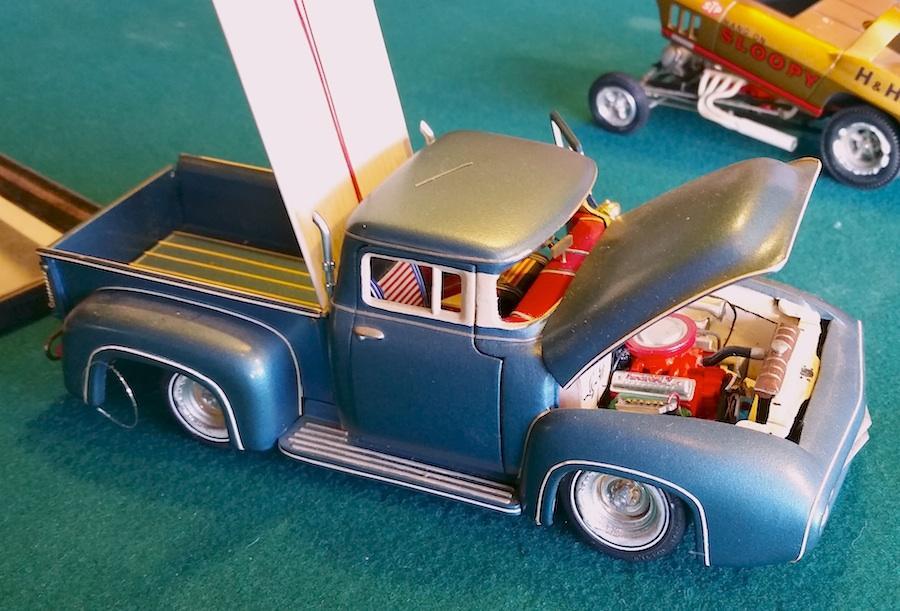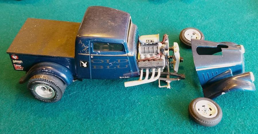 Just a brief setup first - Bob Nordberg was a co-winner of the 1964 Revell-Pactra contest with the legendary Augie Hiscano - both are seen in photos at the bottom of the page of this November 1964 Model Car Science magazine's pg 27. A close-up of Nordberg's truck is seen on pg 23. Hiscano's model is currently on display in the International Model Car Museum, complete with its original contest-awarded base. Nordberg's truck, having seemingly been lost to history, was on the Museum's Hot 150 list of models to be cloned, at the #38 spot. Long story really short, I had given serious thought to cloning the model myself because of my prior interest in it, but Pete Strause (builder of this GSL25-winning Sterling truck) beat me to the opportunity, so I was asked by Mark Gustavson, administrator of the Museum, to research the murky history of other Hot 150 models and to provide Pete with any research material I could dredge up on the Nordberg truck. I came up with nothing but blanks on the other models, but a lucky search result for Nordberg's name turned up a 2013 obituary for him, which led to contact info for his two surviving children, which in turn led to me being able to correspond with his son who still had his father's models in his possession. A friend of his was tapped to take all the photos below, and Norberg's son emailed those to me. Models, plural. I only knew of the truck, but there are several others, tow of which I subsequently found in vintage model car magazine scans. The good news is regarding all of these, Mark has talked with Nordberg's son, and they will be on their way to the Museum. First, the truck. A little roughed up and in need of some repair and restoration, but still in its 1964 contest-issued bubble display with the plaque.