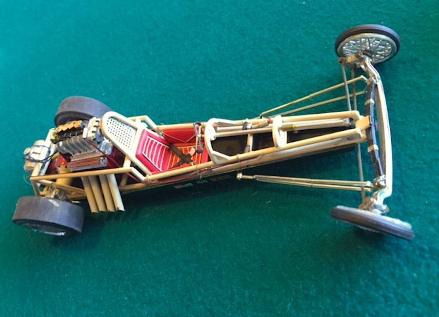 Aha, I thought the roof looked Ford Mustang-ish, but I never looked carefully at that old IMC Cougar II (Christian Boyer had a nice rebuild/redesign of one here at MCM in 2013). Looks like Nordberg filled in the pop-up headlights & grille and put quad lights in and an engine that needed some kind of hood venting. Yep, too quick of a guess about the red & white being a Lola, it is clearly an AMT Elva-McLaren from the pipe things happening toward the front of the deck, as seen in a thread about one of those here earlier in the year. White styrene tires, too.