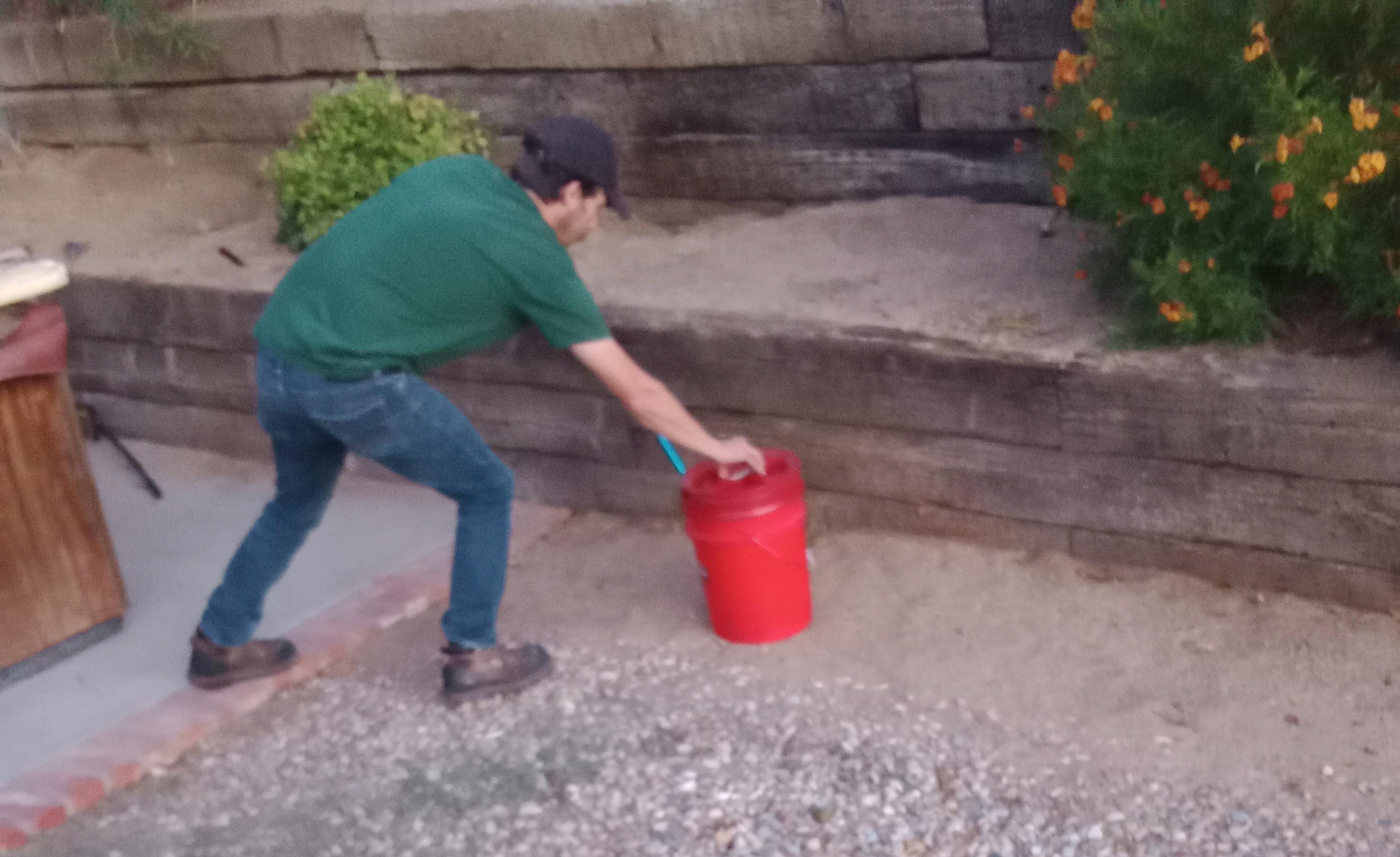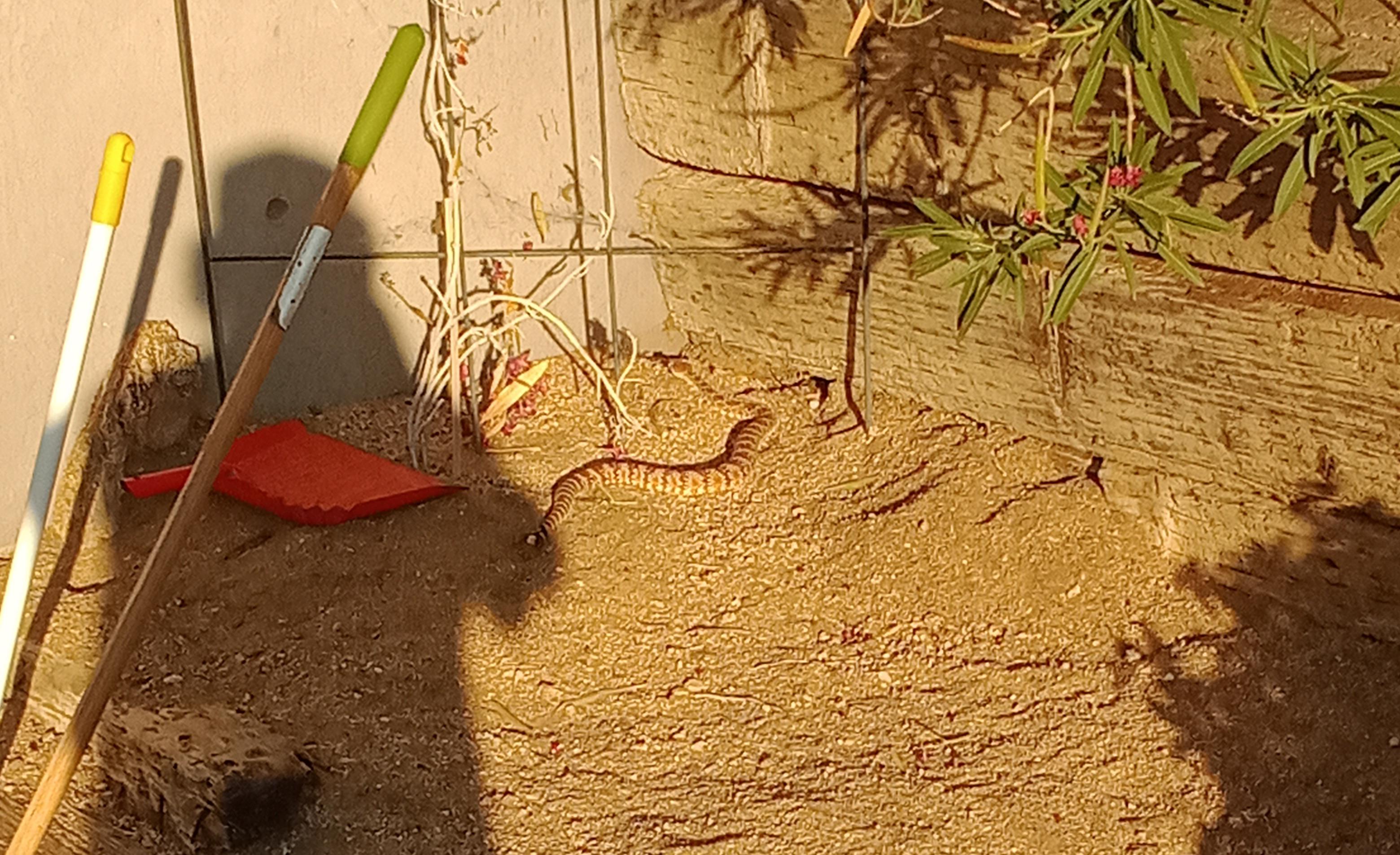 This was about a month ago. I had the boss's dog doing what comes naturally in his backyard and when I was removing the results to the trash bag I heard a VERY loud, angry buzz: Rattlesnake that looked to be about 30" long. Got the dog inside and called Animal Control, and a nice guy named Ryan came out and got it with a grabber after several tries (it had wound itself up under that shrub on the upper right), and got it in that can, and it was REALLY buzzing at that point! Thanked him profusely. -