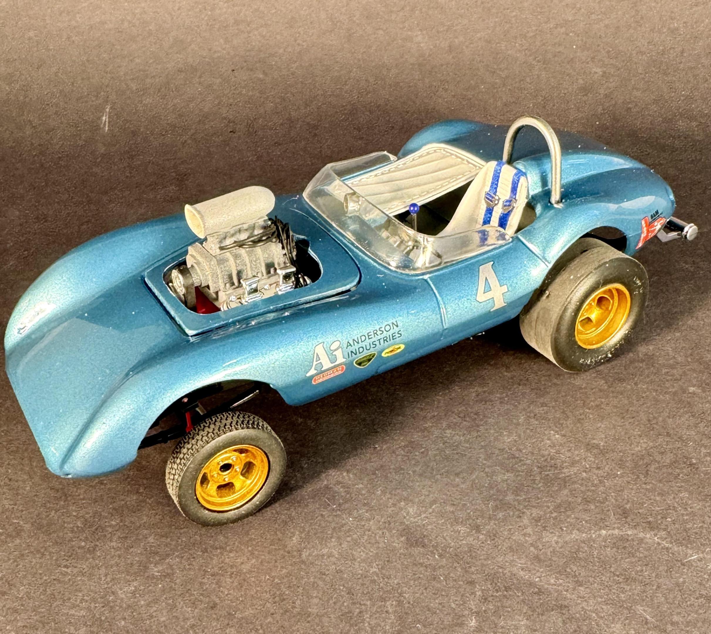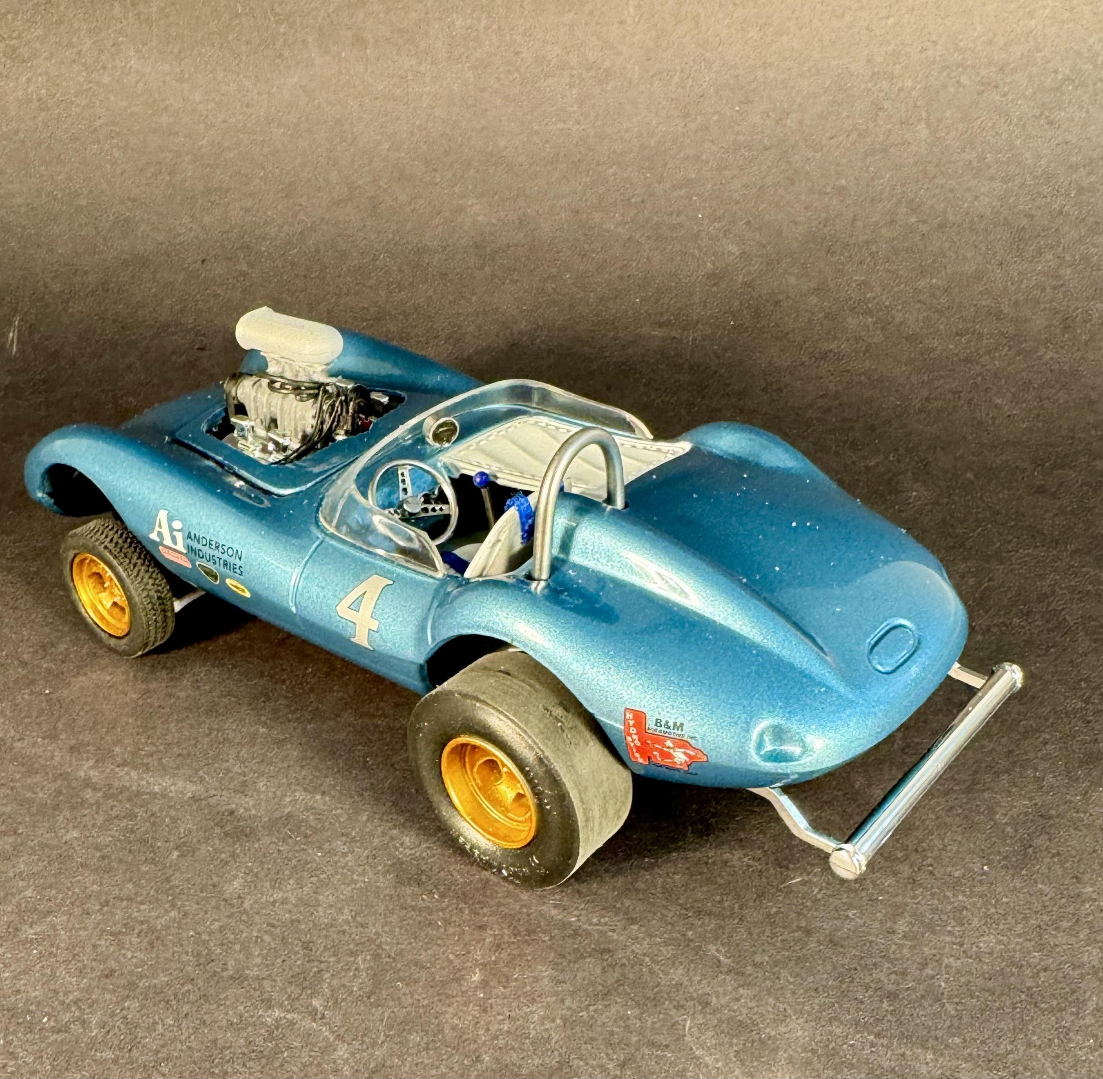 I have always had a thing for hot rodded sports cars. While these are only occasionally seen today in the NHRA context (comp eliminator, super gas, etc.), they once had their own home in the modified sports class and it was not unusual to see MG's, Healeys, Jaguars, and the like sporting big V8's with huffers poking out of the hood. A few months ago my buddy Pryor Passorino surprised me with this kit and I was inspired to build something along these lines. The body is an old Strombecker tool, actually a motorized toy that lacks chassis detail and substitutes a detailed frame and motor with a belly pan that mounts an electric motor and rotating axles. I must say, I was not even slightly tempted to build it out of the box and play with it on my kitchen floor. This is a rare and valuable kit and the collector in me wanted it untouched and on the shelf with the rest of my rarities. But this was a gift from Pryor and his expectaton was that I was going to cut it up and build something cool. The real challenge was finding a chassis that would fit the wheelbase and track width of the Scarab. I really didn't feel like scratchbuilding anything so I settled on the Revell Willys gasser kit as a donor which, after shortening the frame rails and relocating the motor mounts rearward, turned out to be a good choice. Paint is Scale Finishes Nassau Blue topped with House of Color Show Clear. I usually hate working with 2K but, I have to admit, I hate polishing and this stuff is super glossy right out of my Pasche. I pleased with the results and I'll be bringing it to Spirit of Speed on Sunday.
